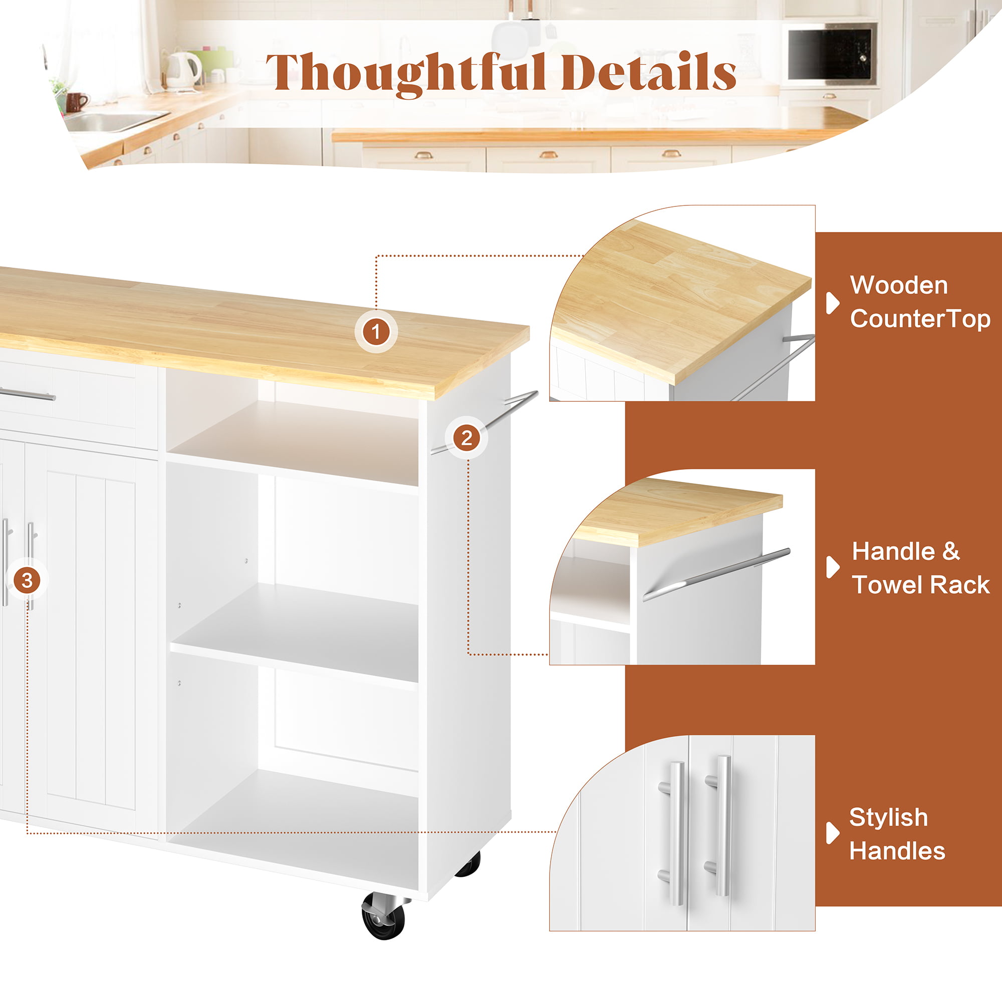 Walsunny Kitchen Island Cart with Storage.Rolling Kitchen Island Side Table on Wheels with Large Worktop.Storage Cabinet.Towel Rack and DrawersWhite
