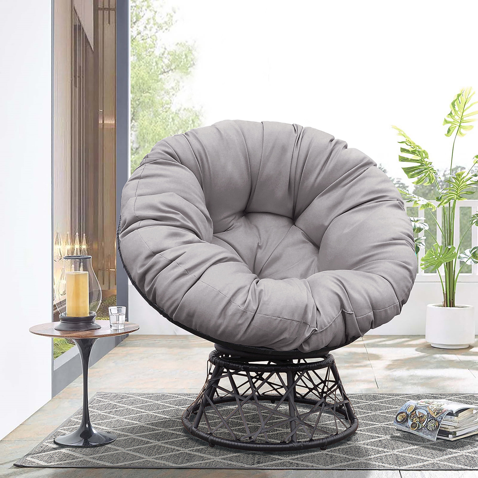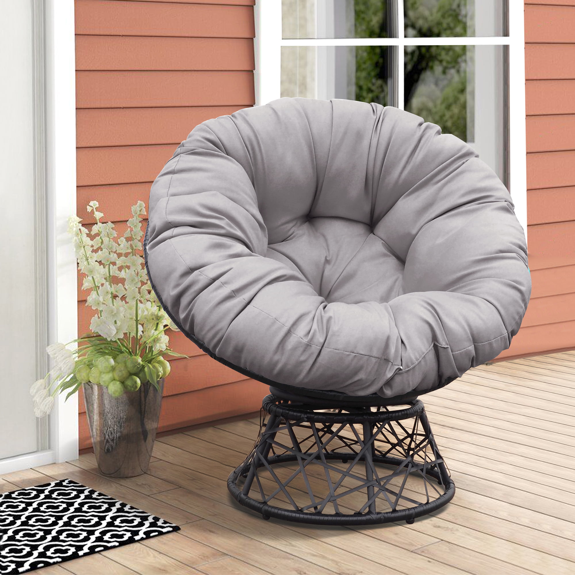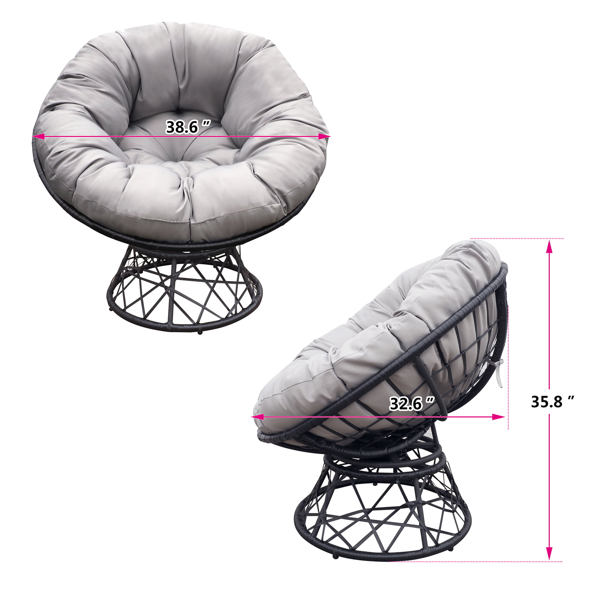Arttoreal Outdoor Patio Wicker Papasan Chair 360-Degree Swivel with Frame and Cushion.Comfy Round Lounge Moon Chair.Gray