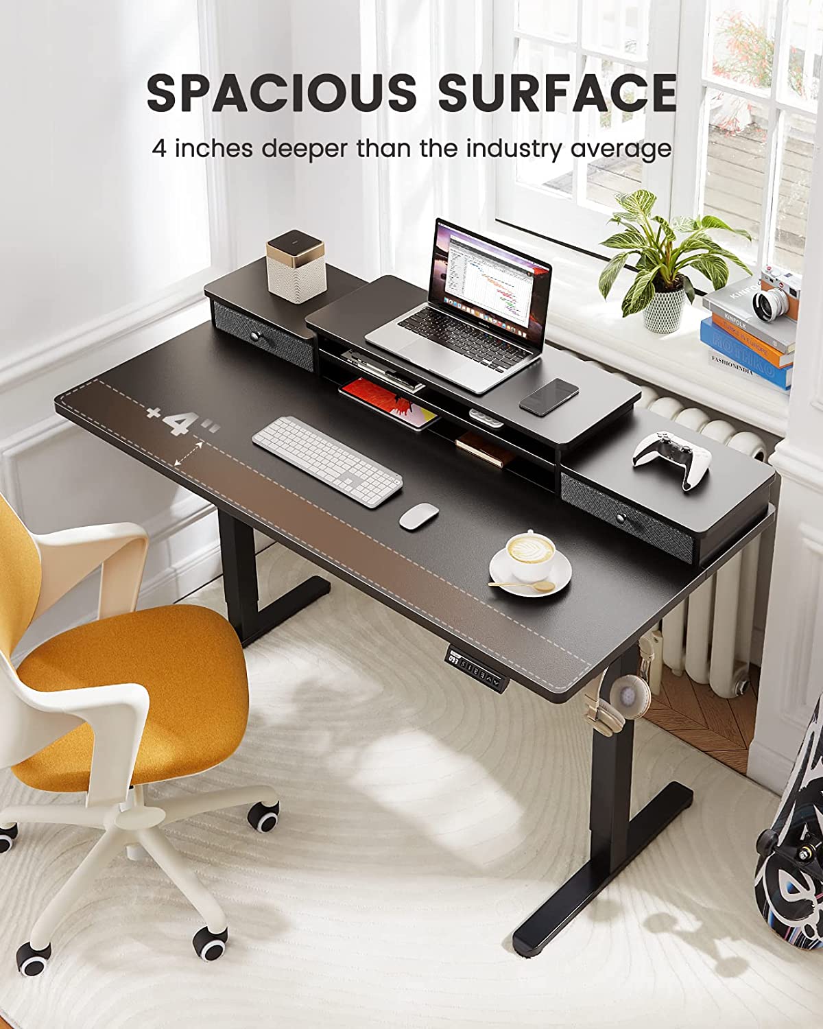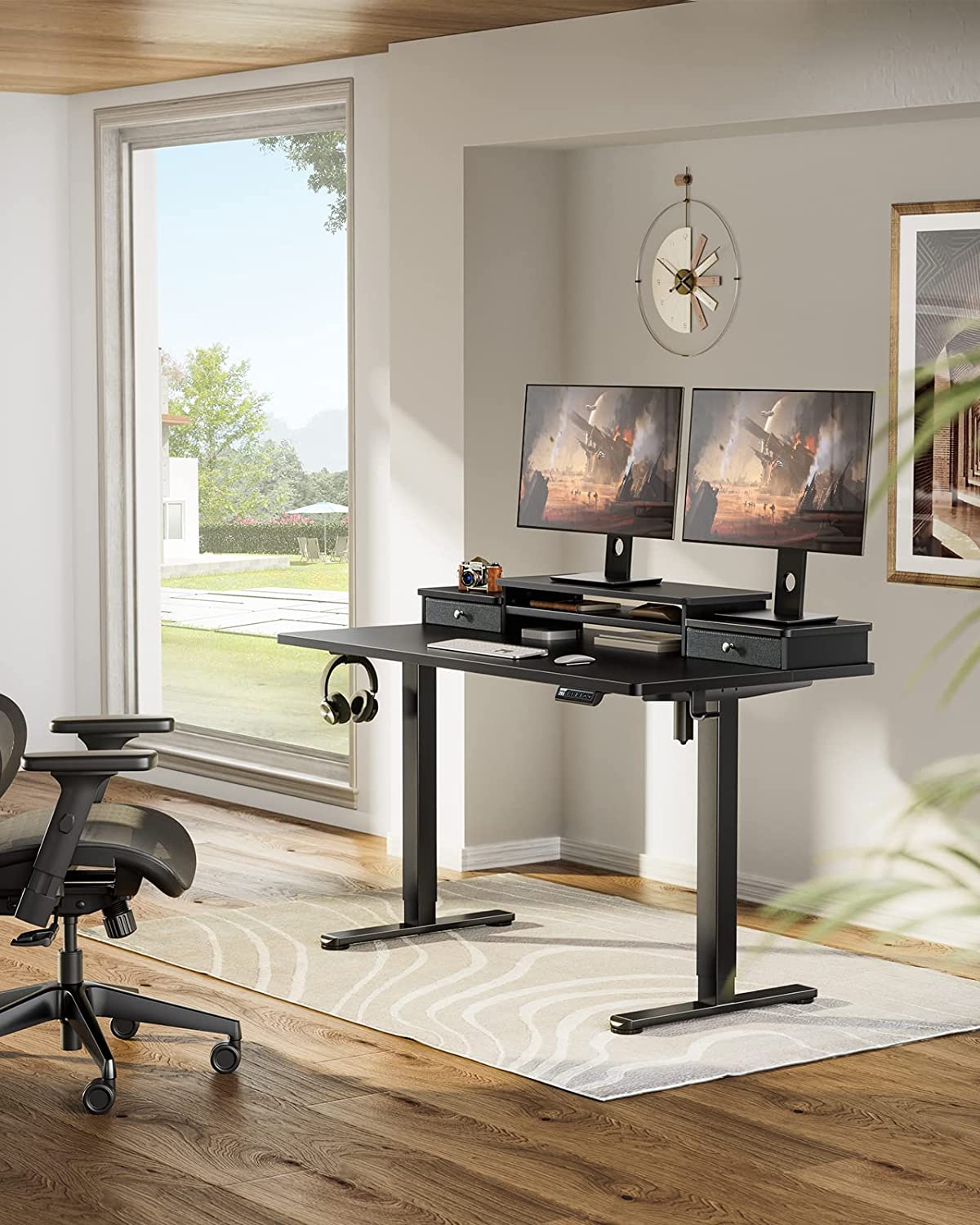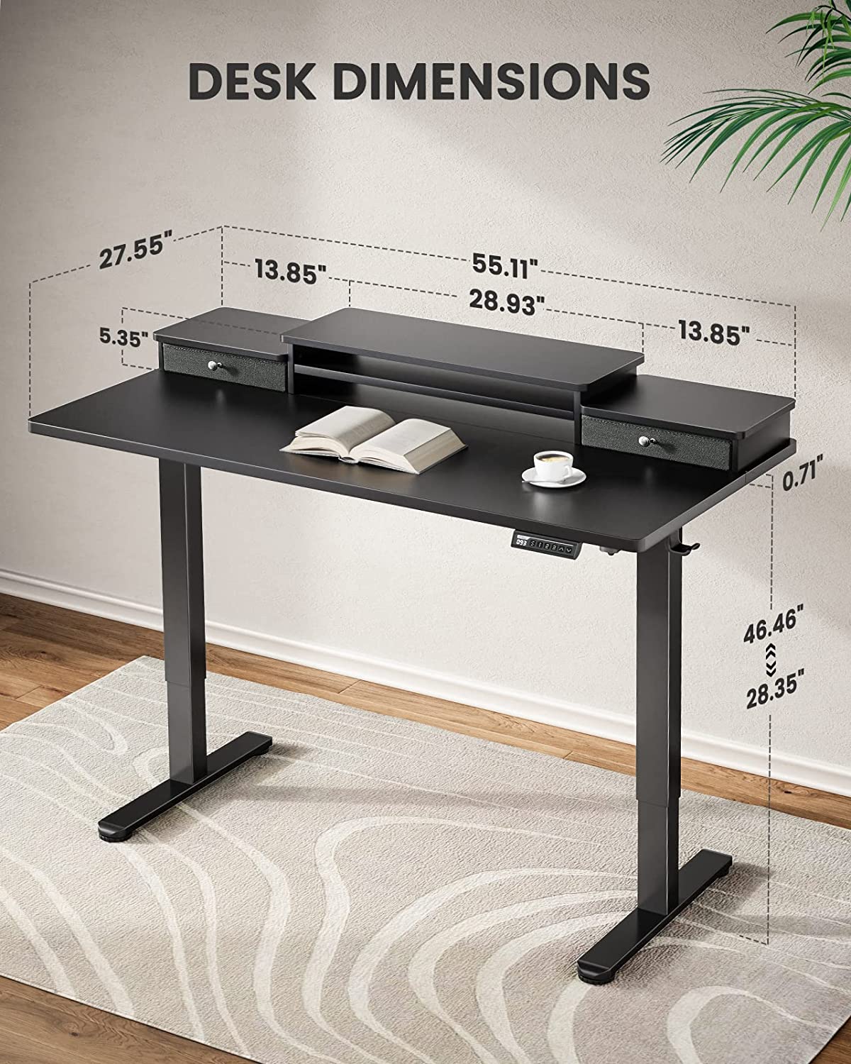Electric Standing Desk with Double Drawers Height Adjustable 55″x28″ Stand Up Desk with Monitor Shelf. Black