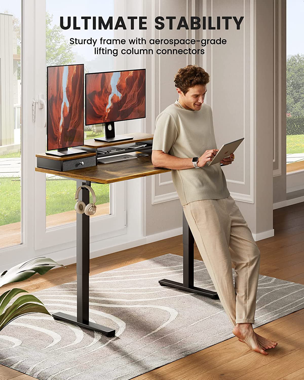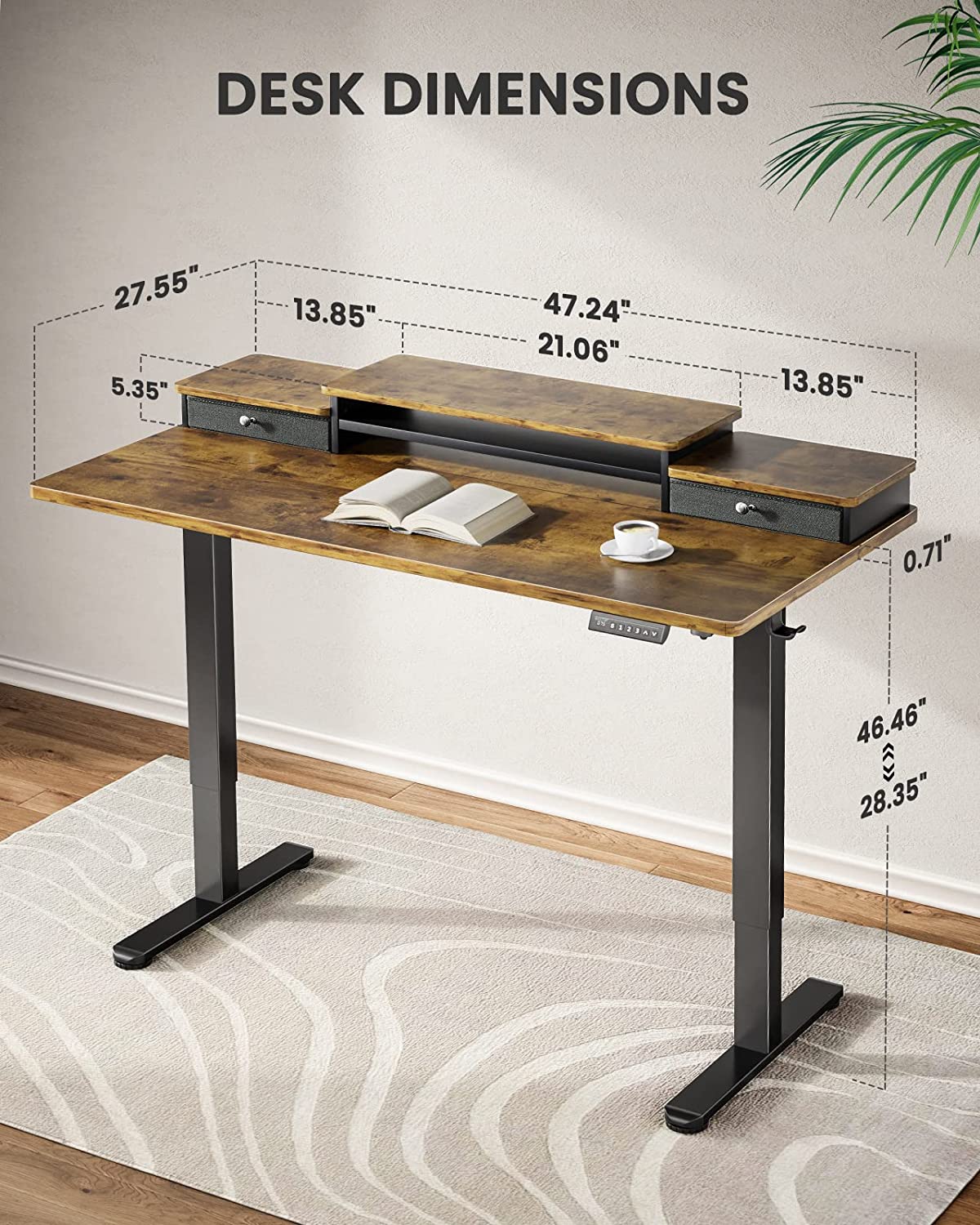 Electric Standing Desk with Double Drawers Height Adjustable 48″x24″ Stand Up Desk with Monitor Shelf. Vintage Brown