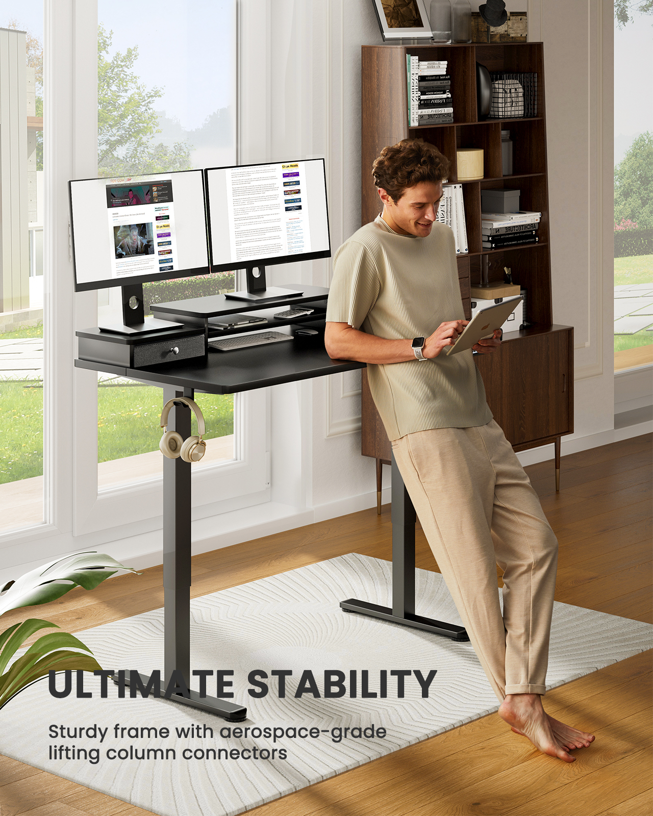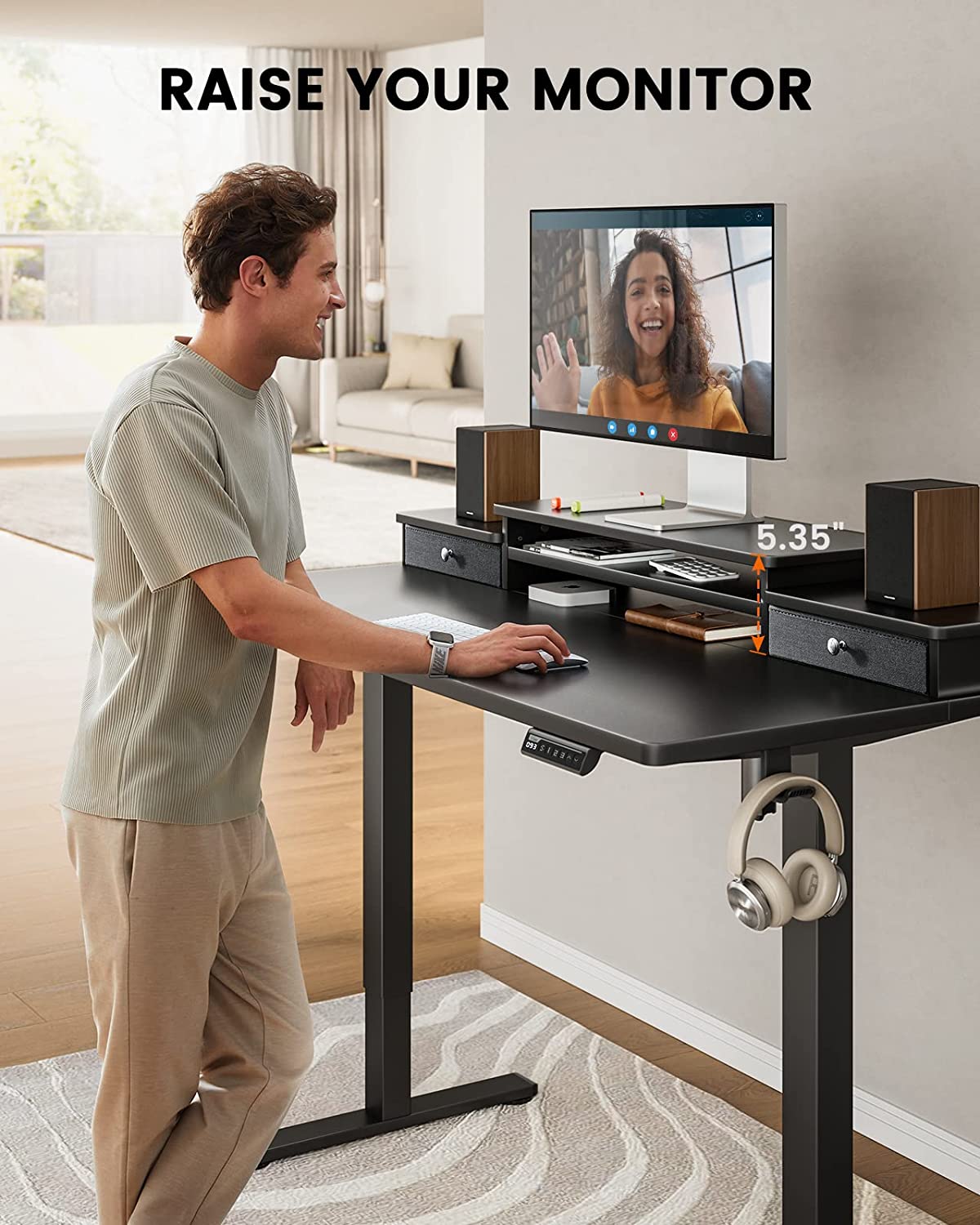Electric Standing Desk with Double Drawers Height Adjustable 48″x24″ Stand Up Desk with Monitor Shelf. Black