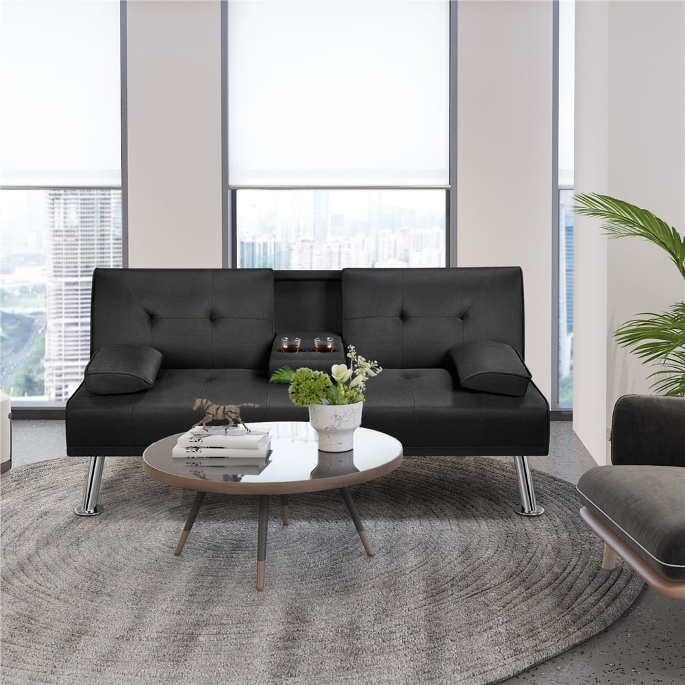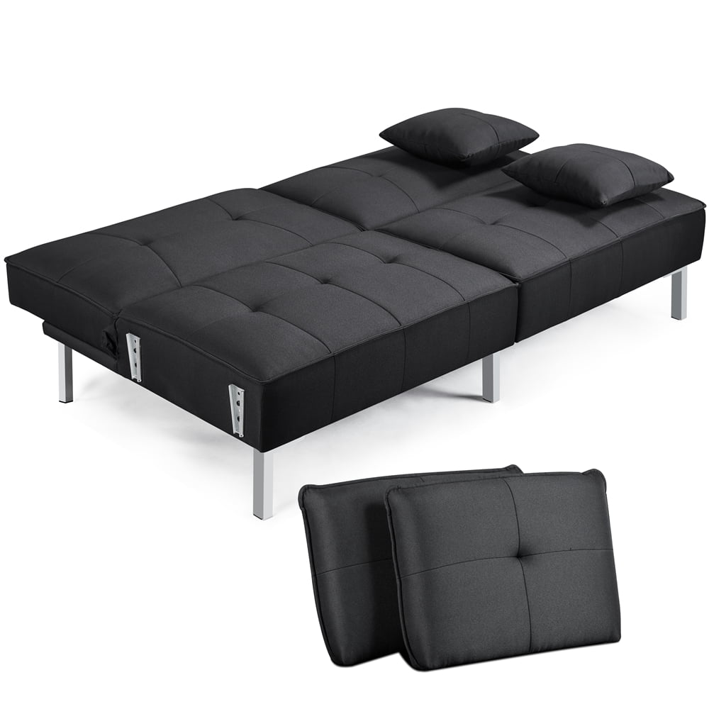 Alden Design Modern Fabric Reclining Futon with Cupholders and Pillows. Black