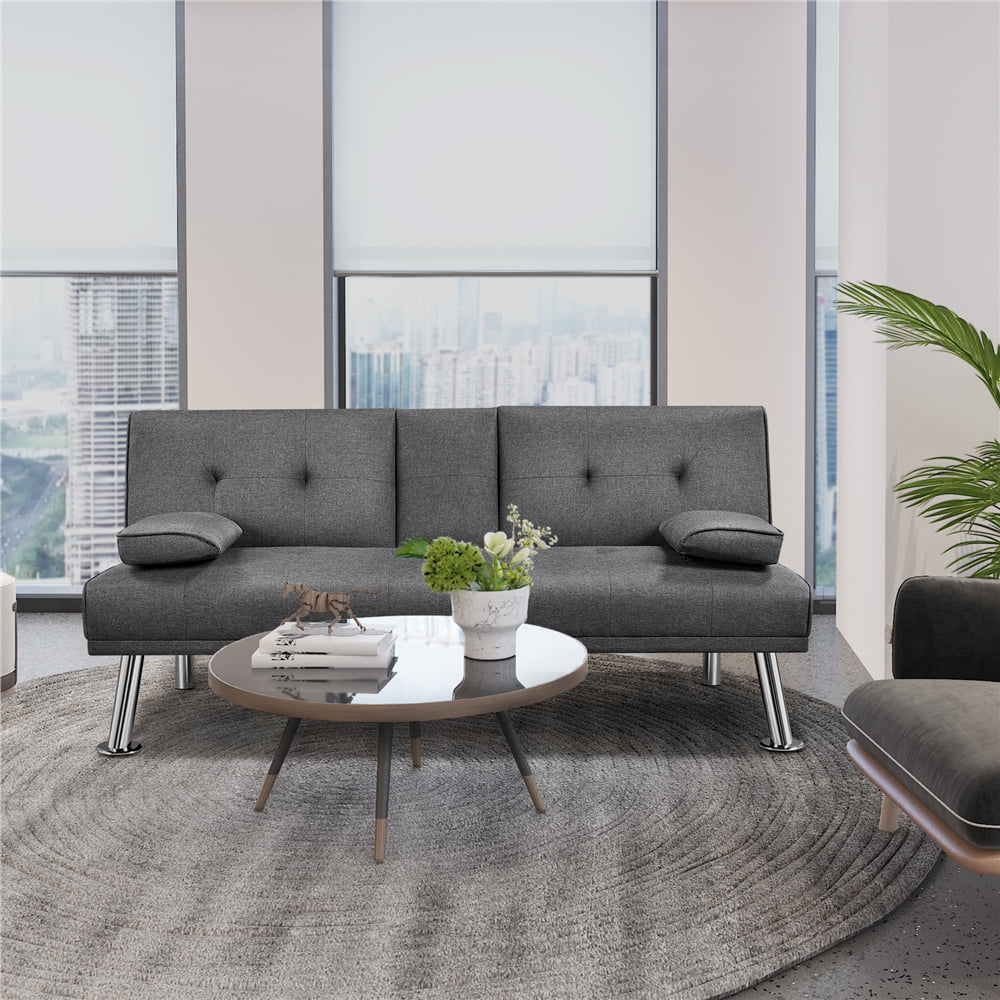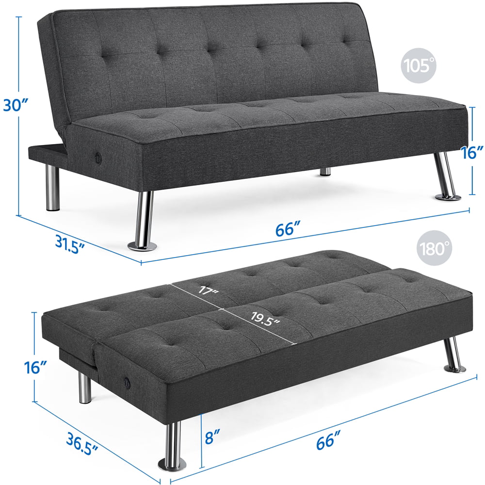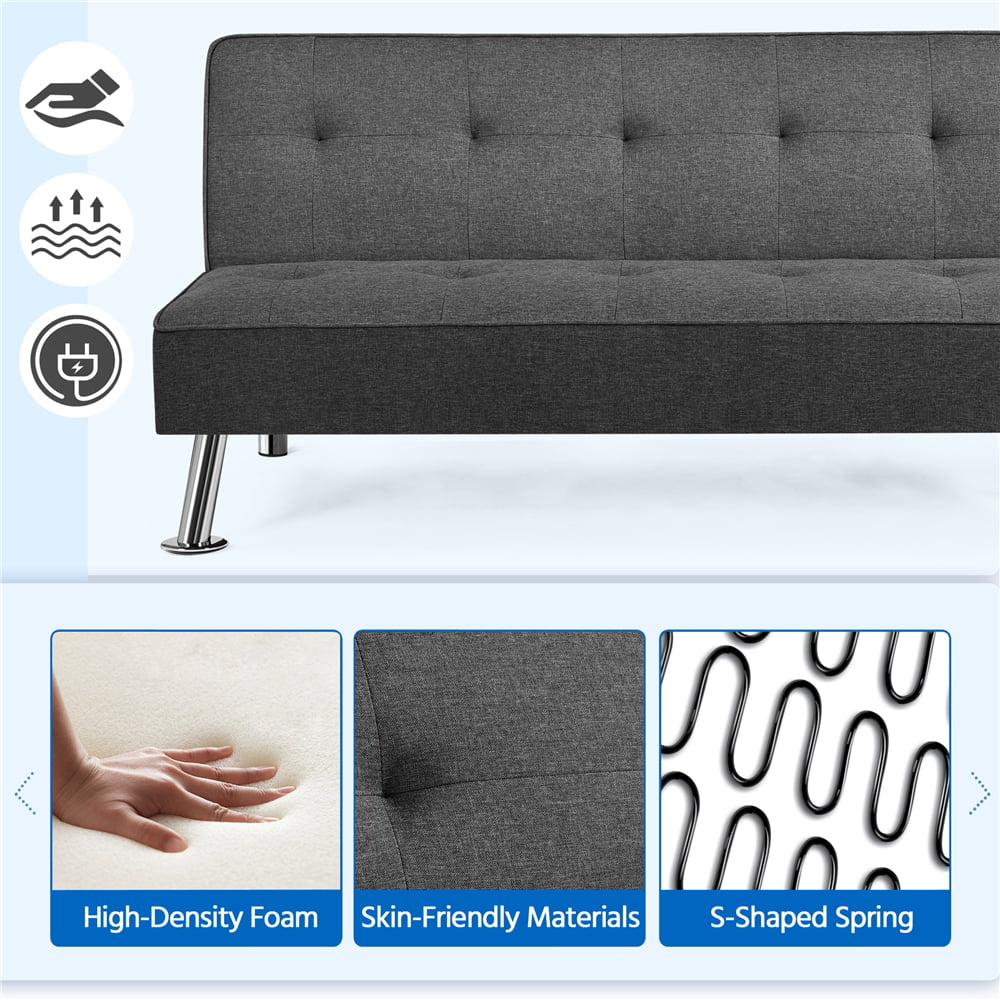 Best Choice Products Modern Linen Convertible Futon Sofa Bed w/ Removable Armrests. Metal Legs. Cupholders - Light Gray