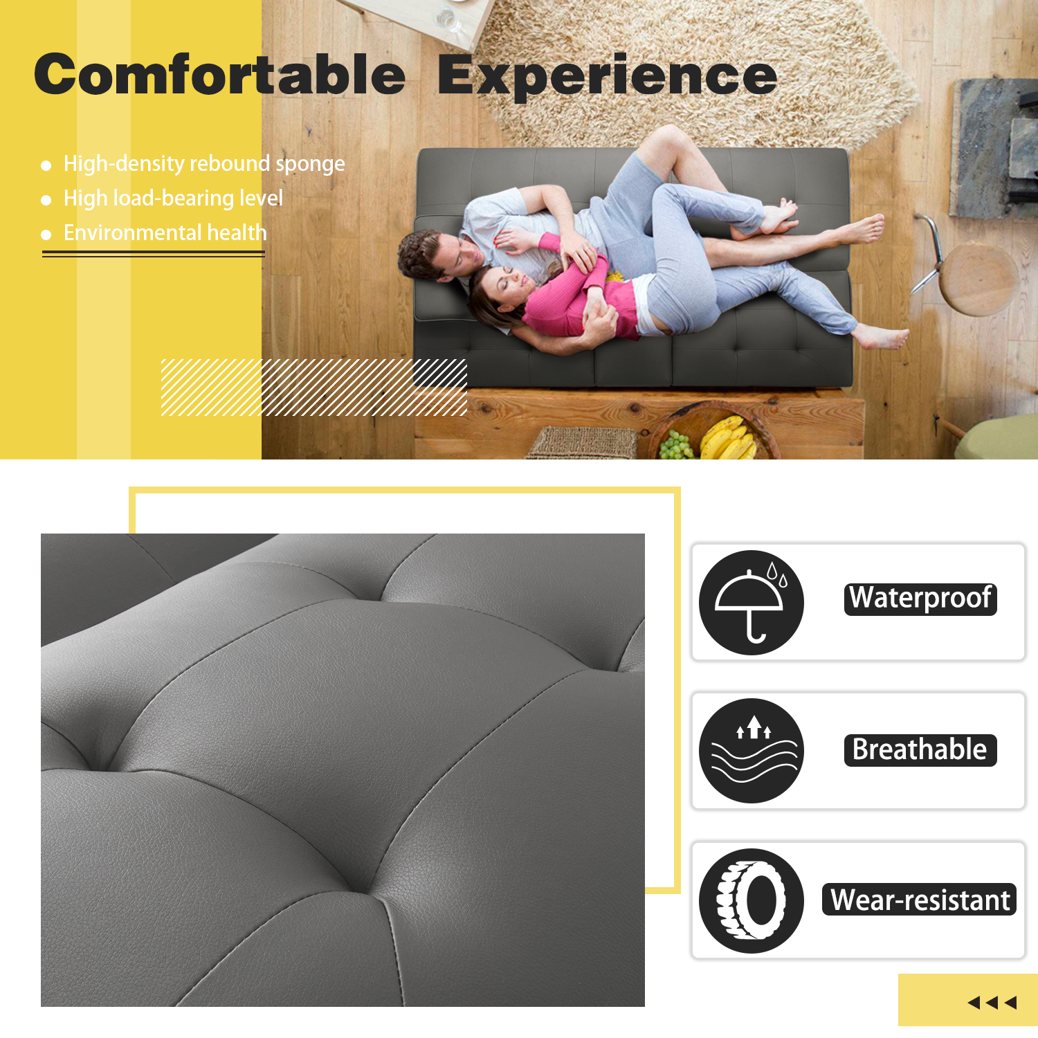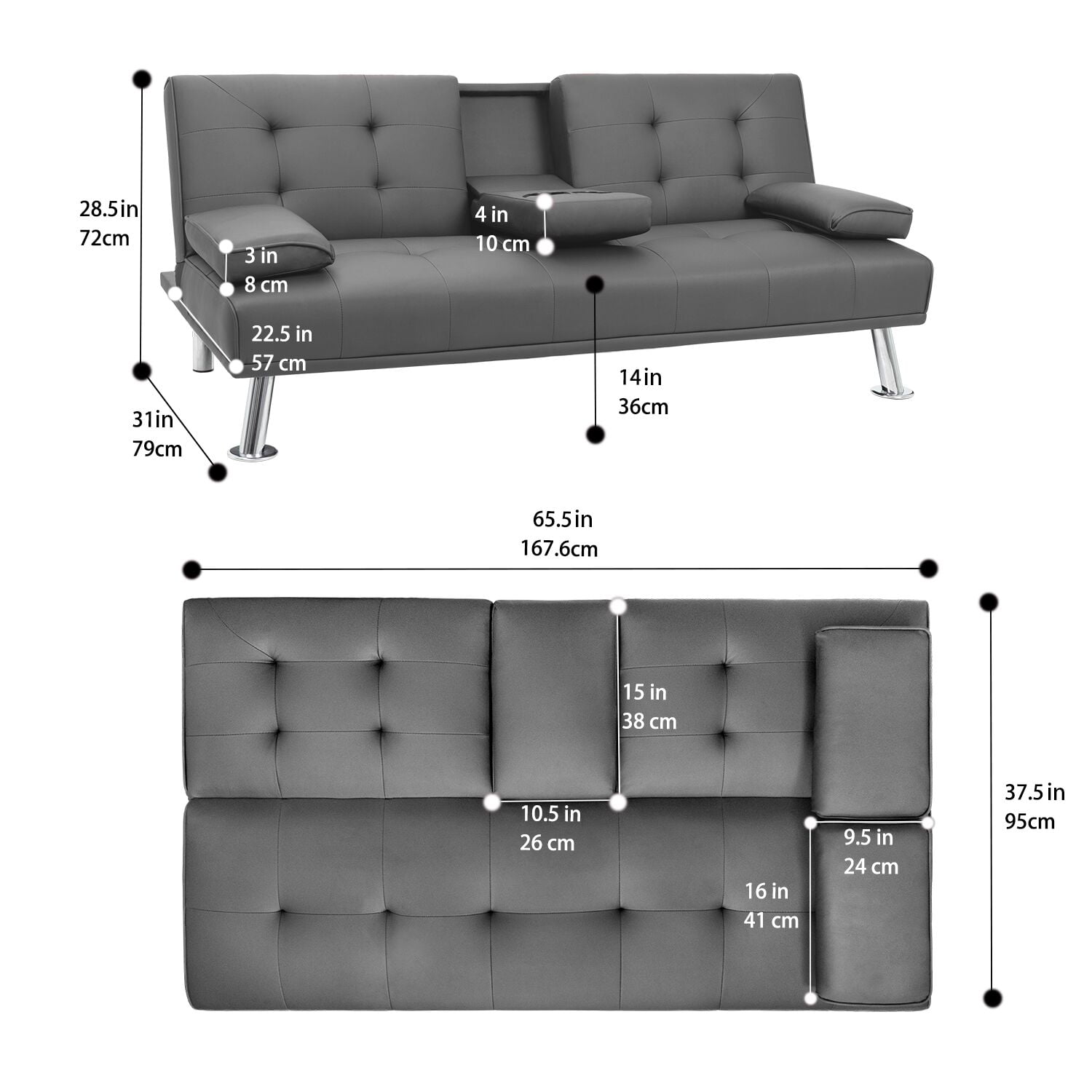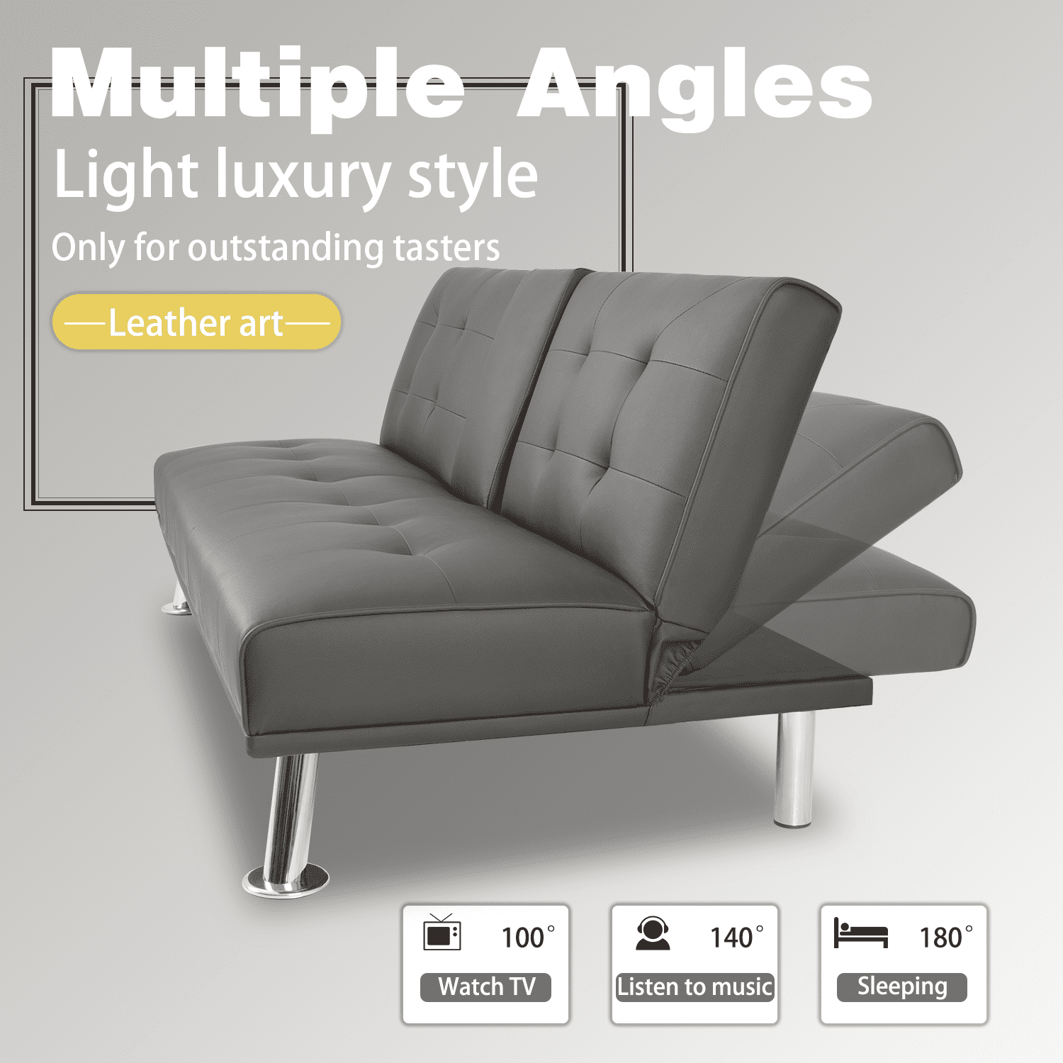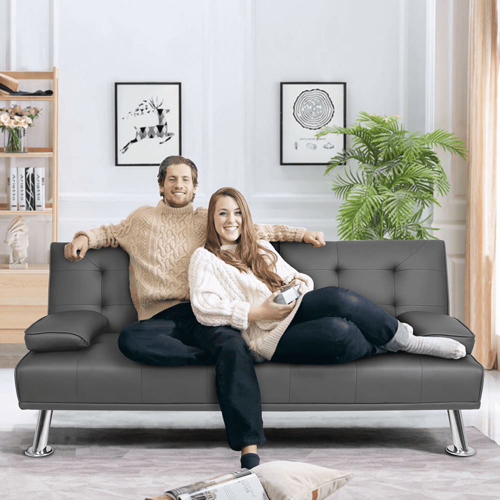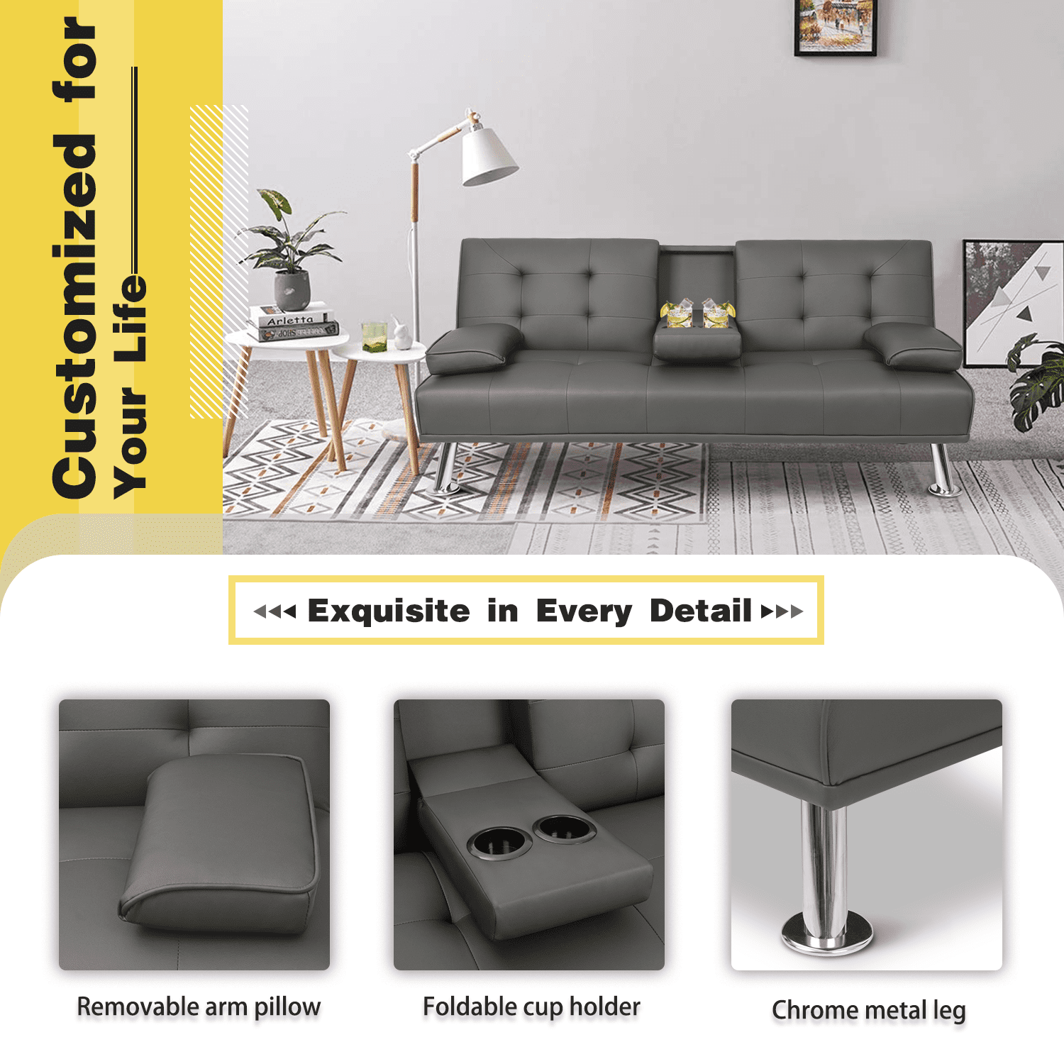 Lacoo Modern Faux Leather Convertible Futon with Cup Holders & Pillows. Grey