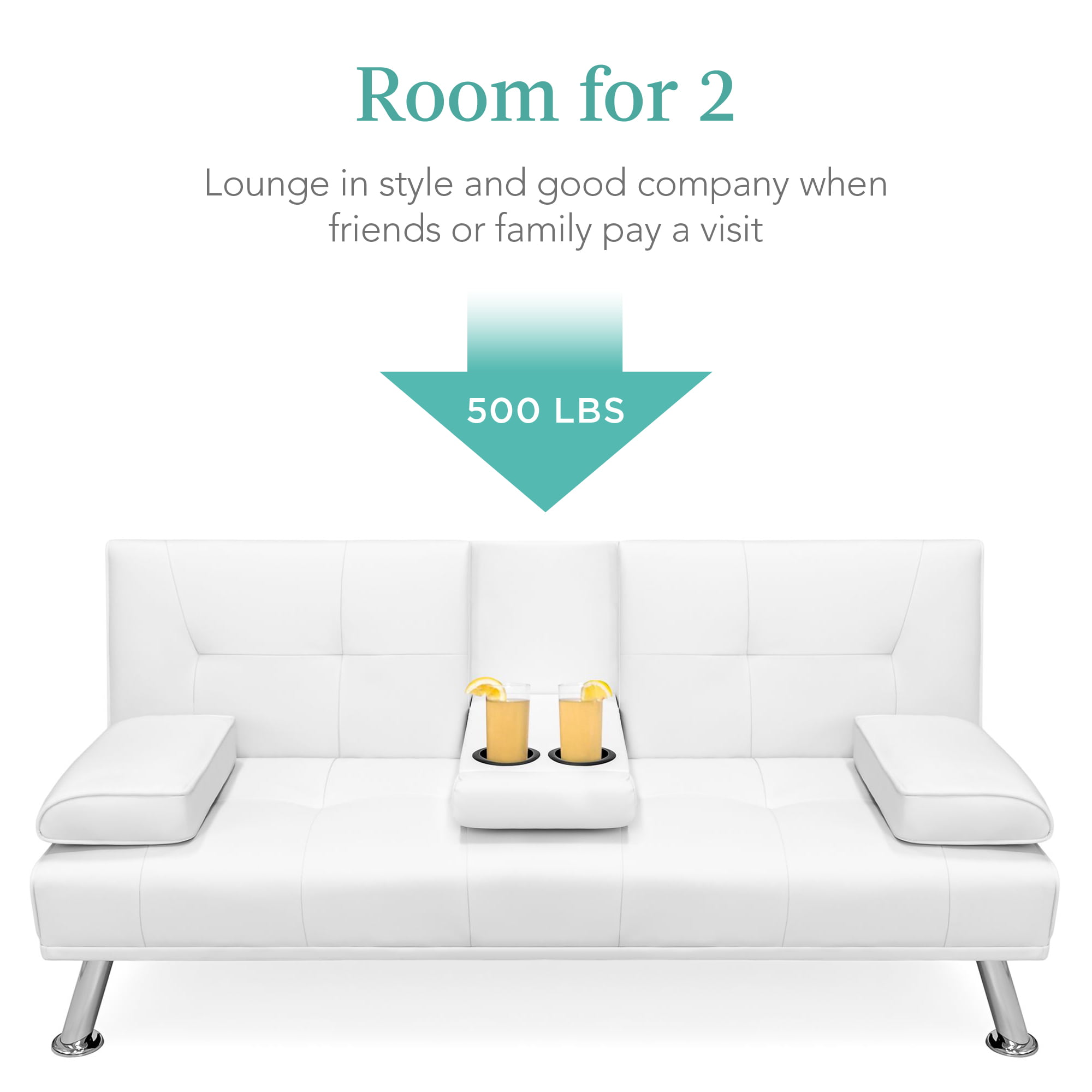 Best Choice Products Modern Faux Leather Convertible Futon Sofa w/ Removable Armrests. Metal Legs. 2 Cupholders - White