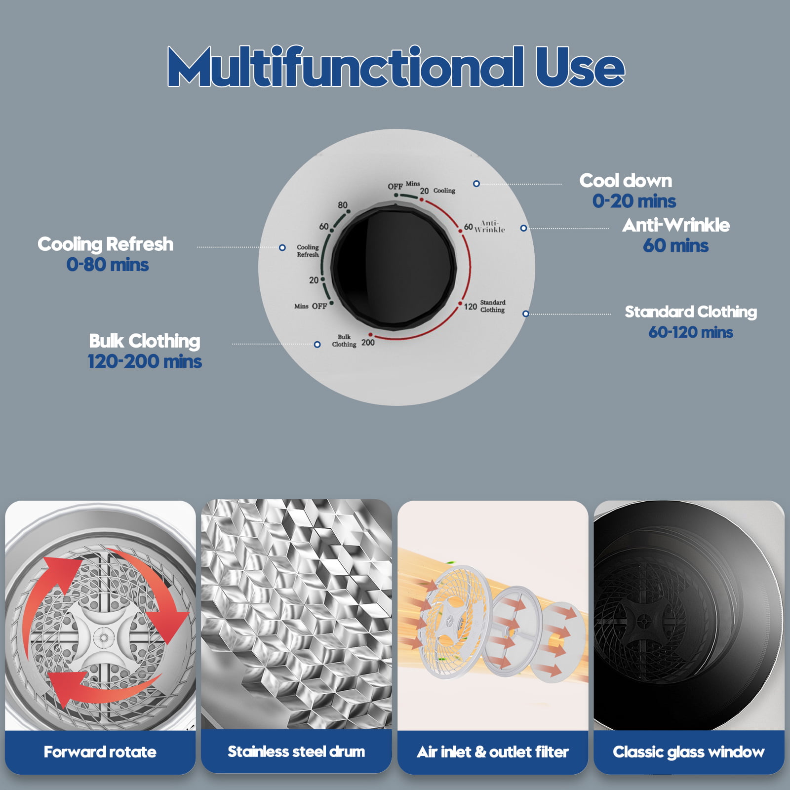 Auertech Electric Portable Tumble Compact Laundry Dryer with Stainless Steel Tub White