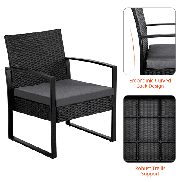 Easyfashion 3-Piece Bistro Set with Rattan Chairs for Outdoor Patio and Balcony. Black Cushions