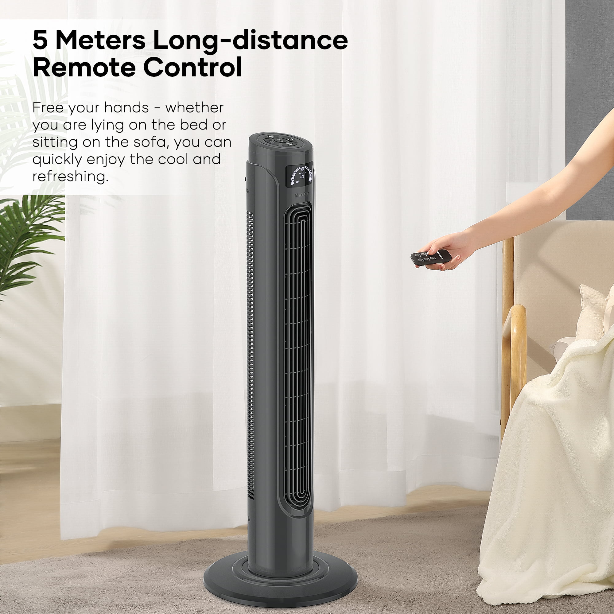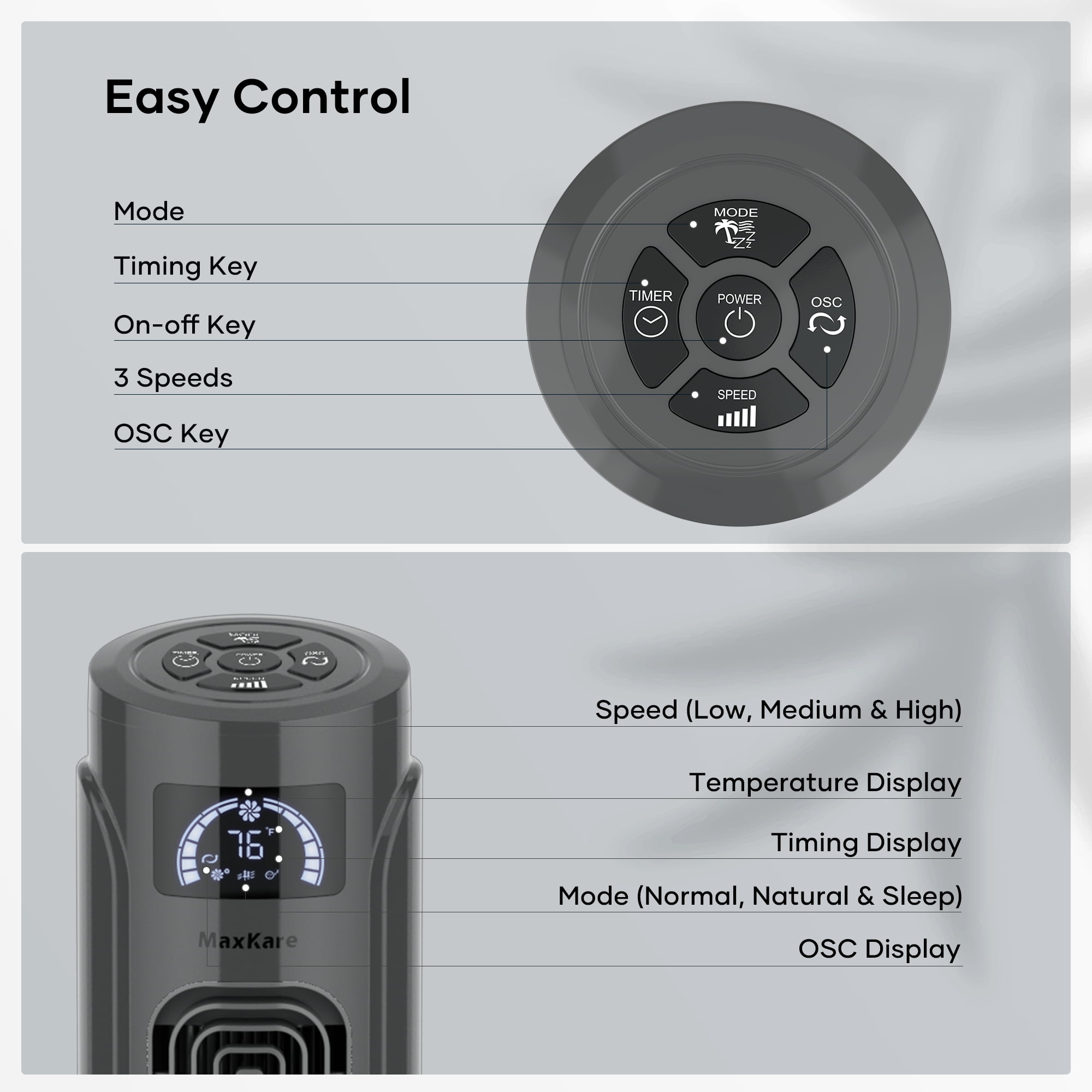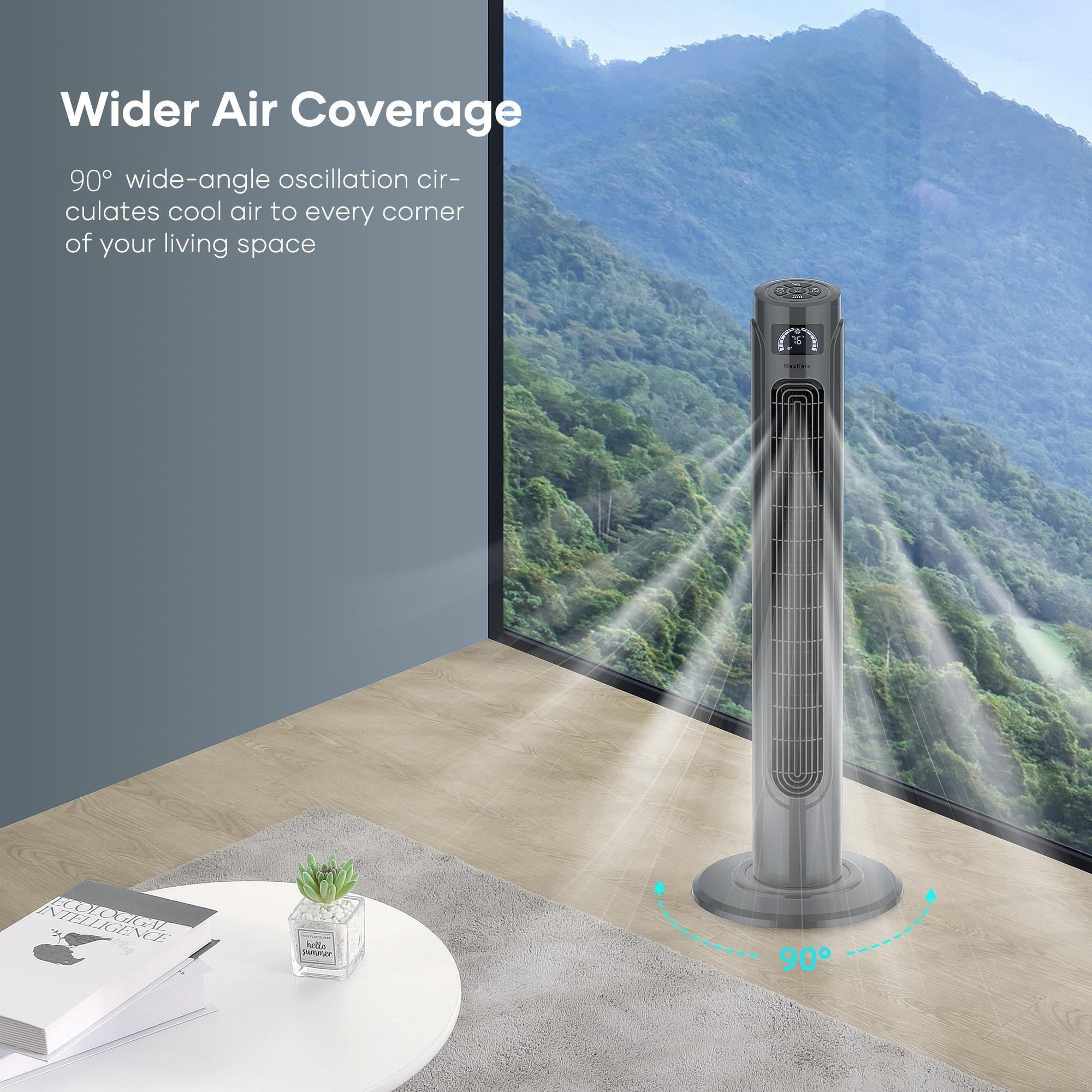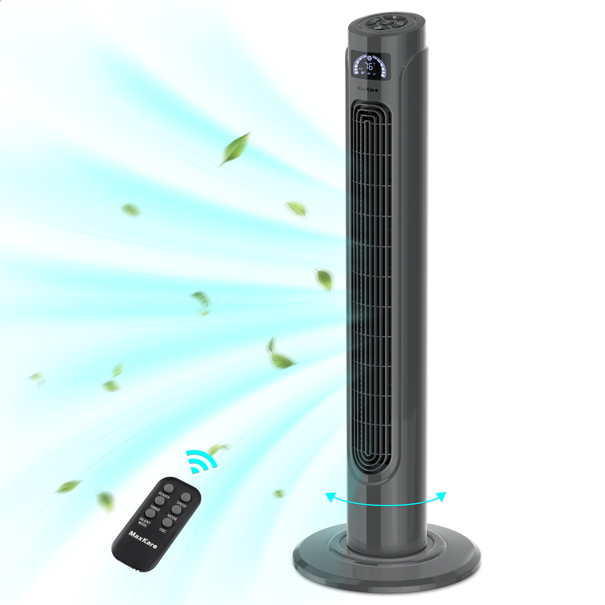 MaxKare 36″ Tower Fan with Remote Controller. 3 Speeds. 3 Modes. 15H Auto-off Timer. 90° Oscillating. LED Display. 60dB Quiet Fan. Grey