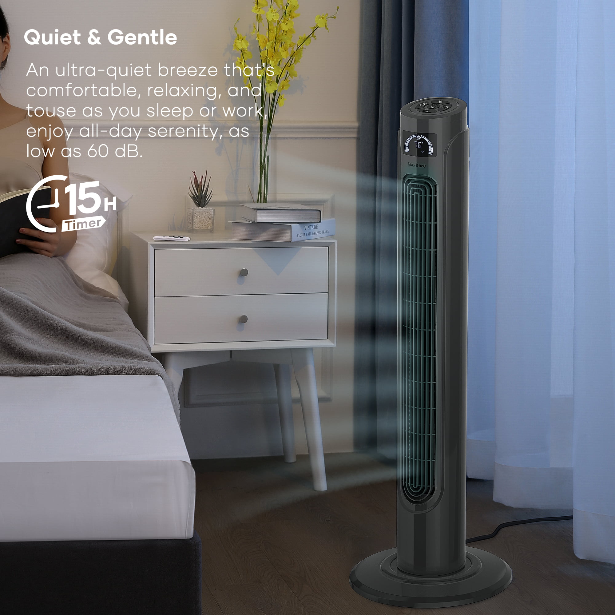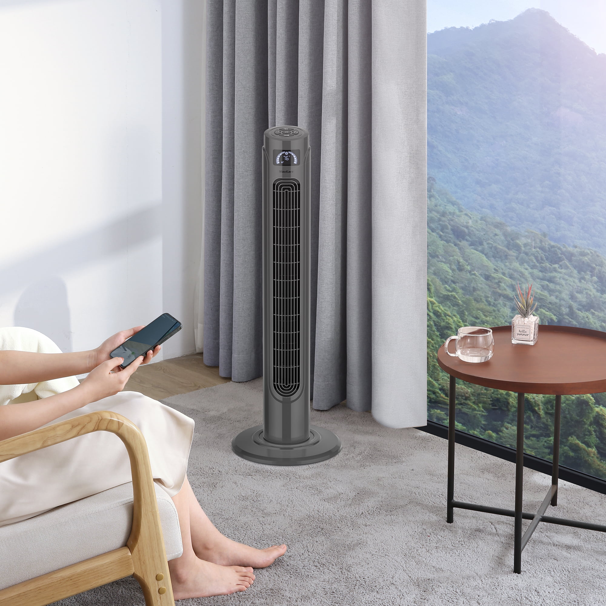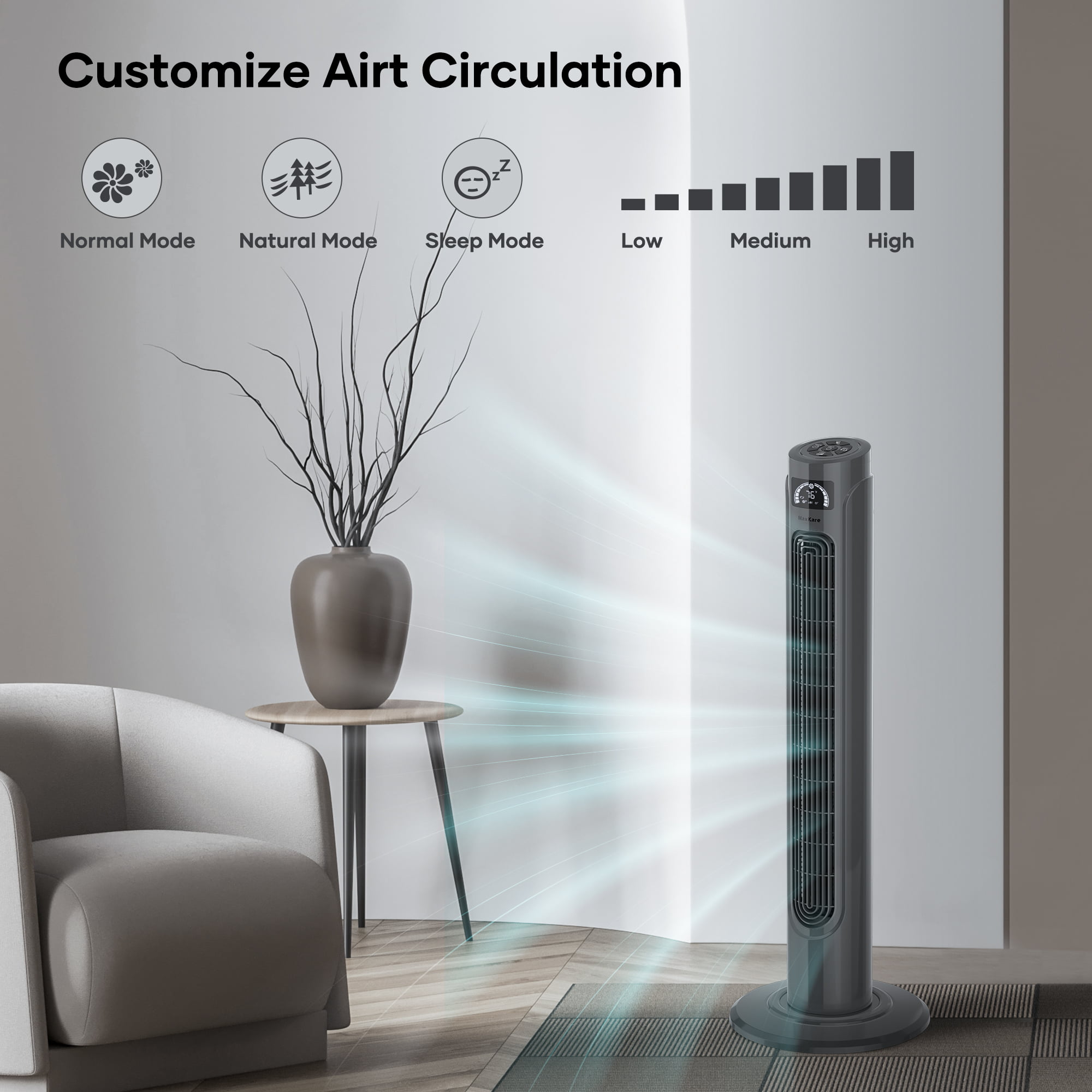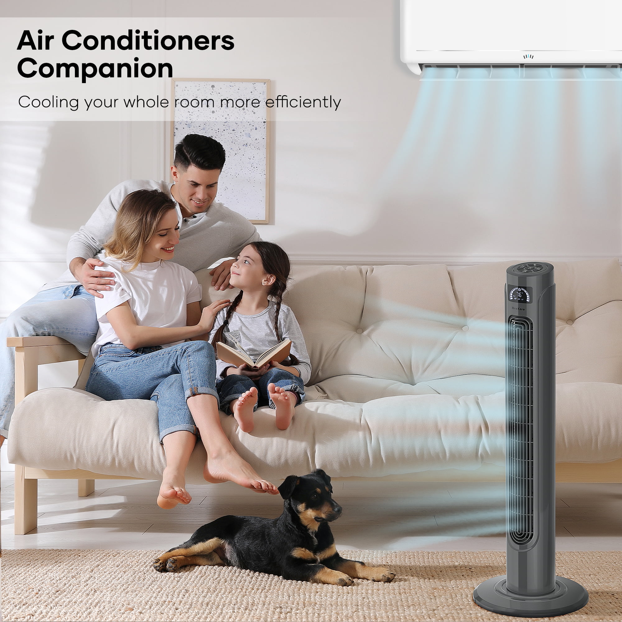MaxKare 36″ Tower Fan with Remote Controller. 3 Speeds. 3 Modes. 15H Auto-off Timer. 90° Oscillating. LED Display. 60dB Quiet Fan. Grey