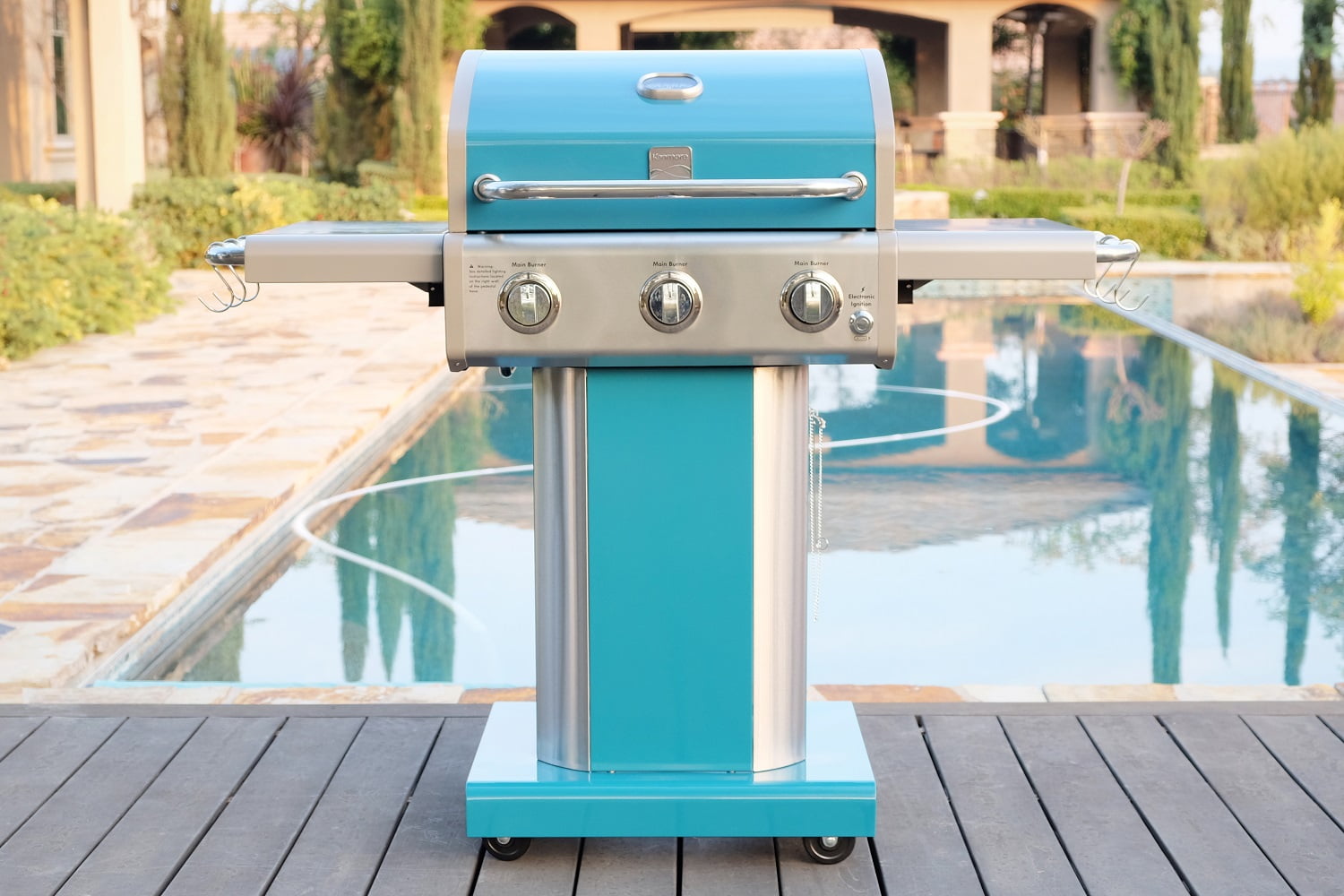 Kenmore 3-Burner Outdoor BBQ Propane Gas Grill with Foldable Sides. Azure Blue
