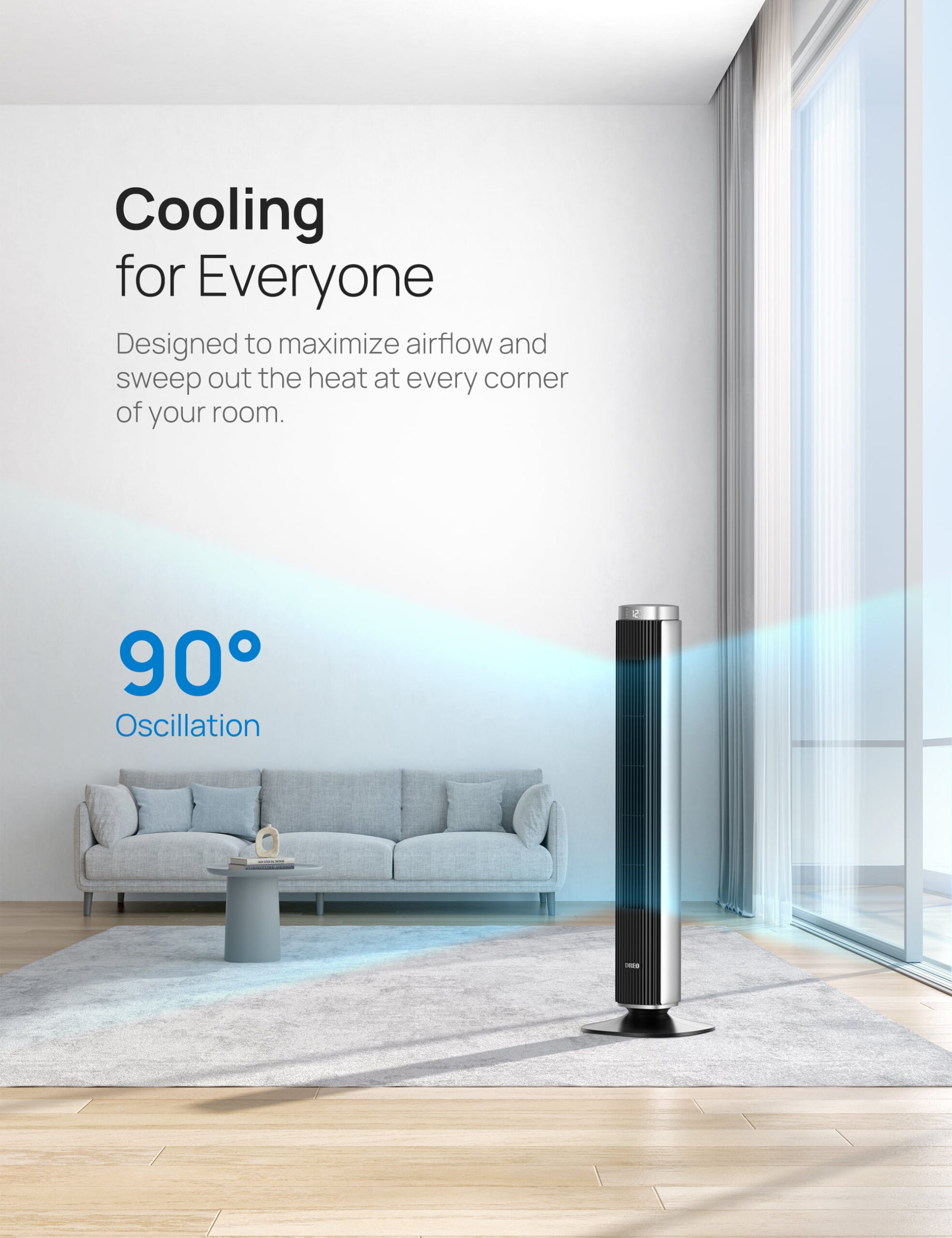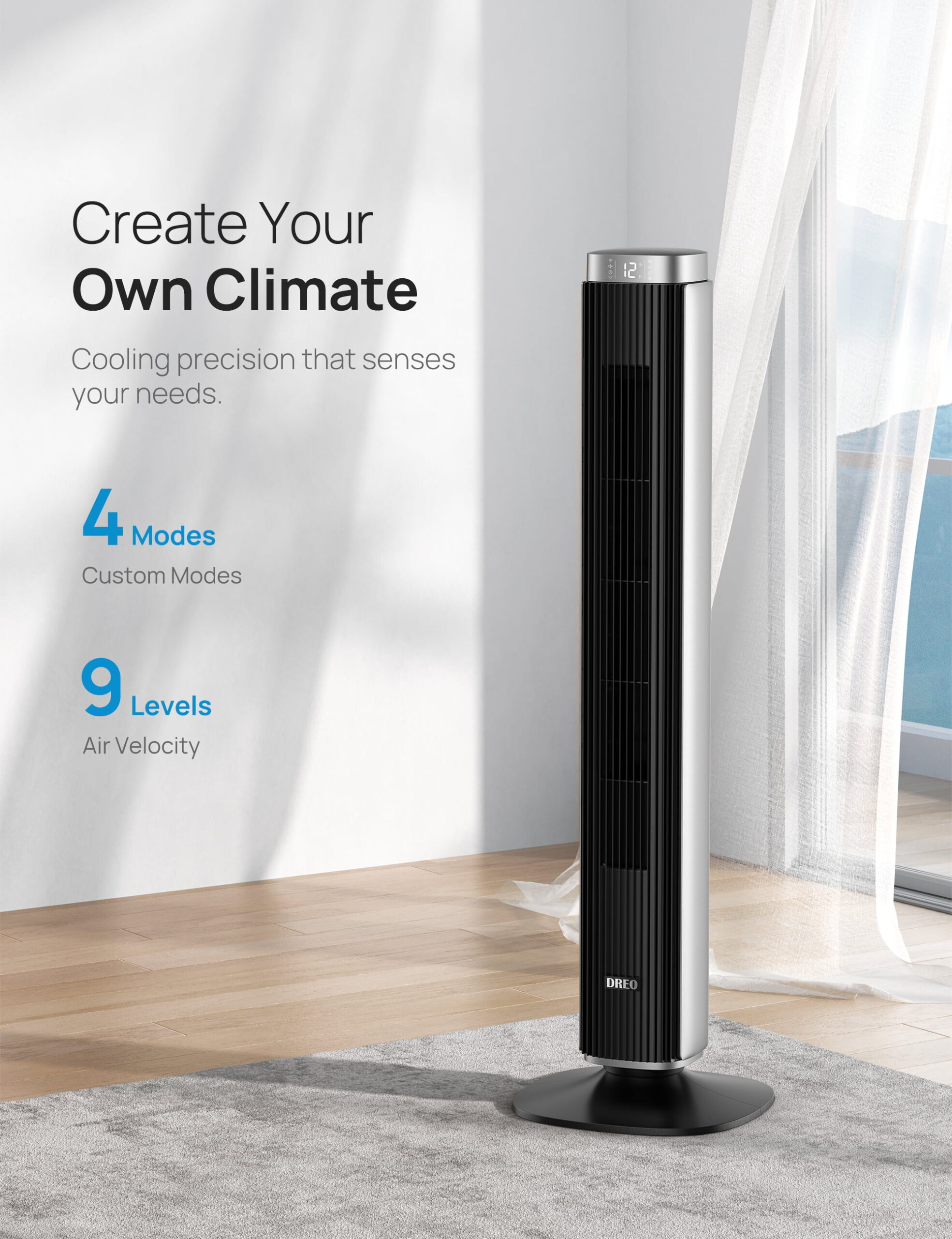 Dreo 42″ Tower Fan for bedroom. 25 DB Quiet DC Bladeless Fans. 90° Oscillating Fan with Remote. LED Display. 12H Timer. 9 Speeds.4 Modes. Standing Floor Fans for Room Home Office. Pilot Pro
