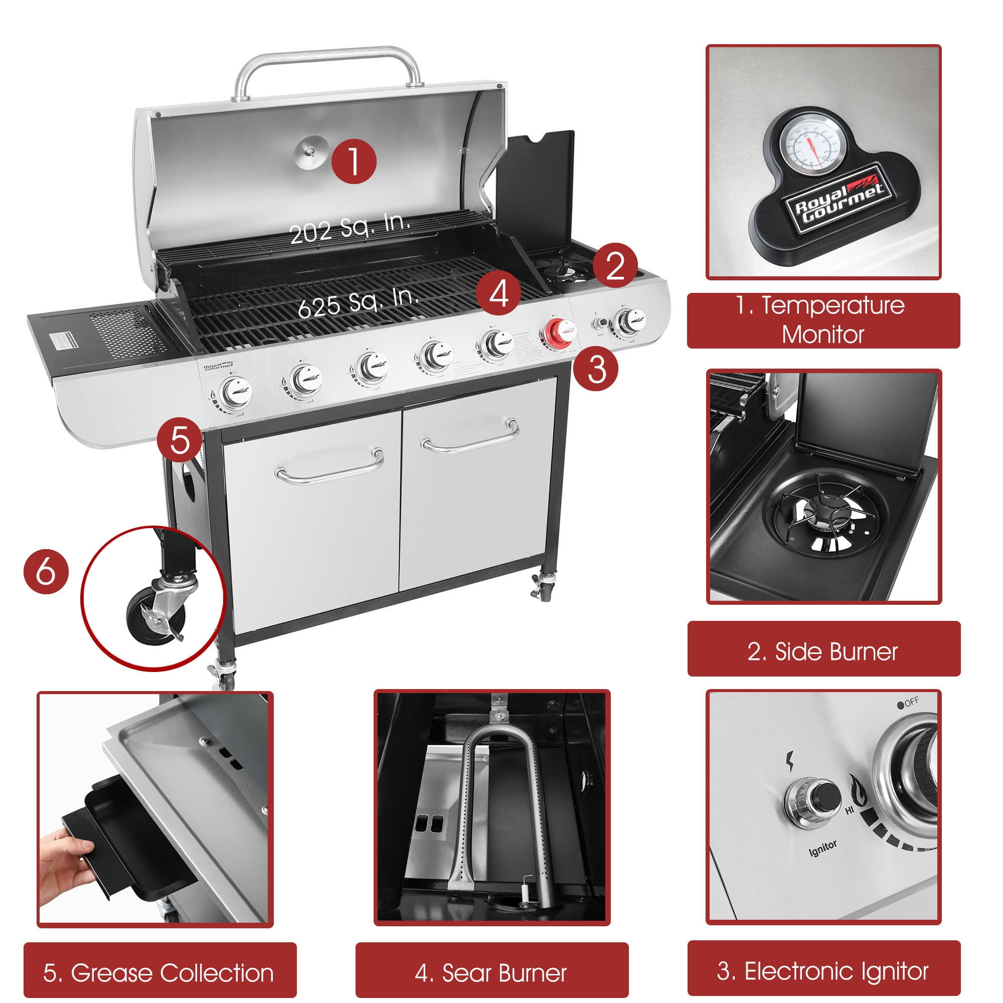 Royal Gourmet SG6002 Classic 6-Burner 71000-BTU LP Gas Grill with Sear Burner and Side Burner. Stainless Steel