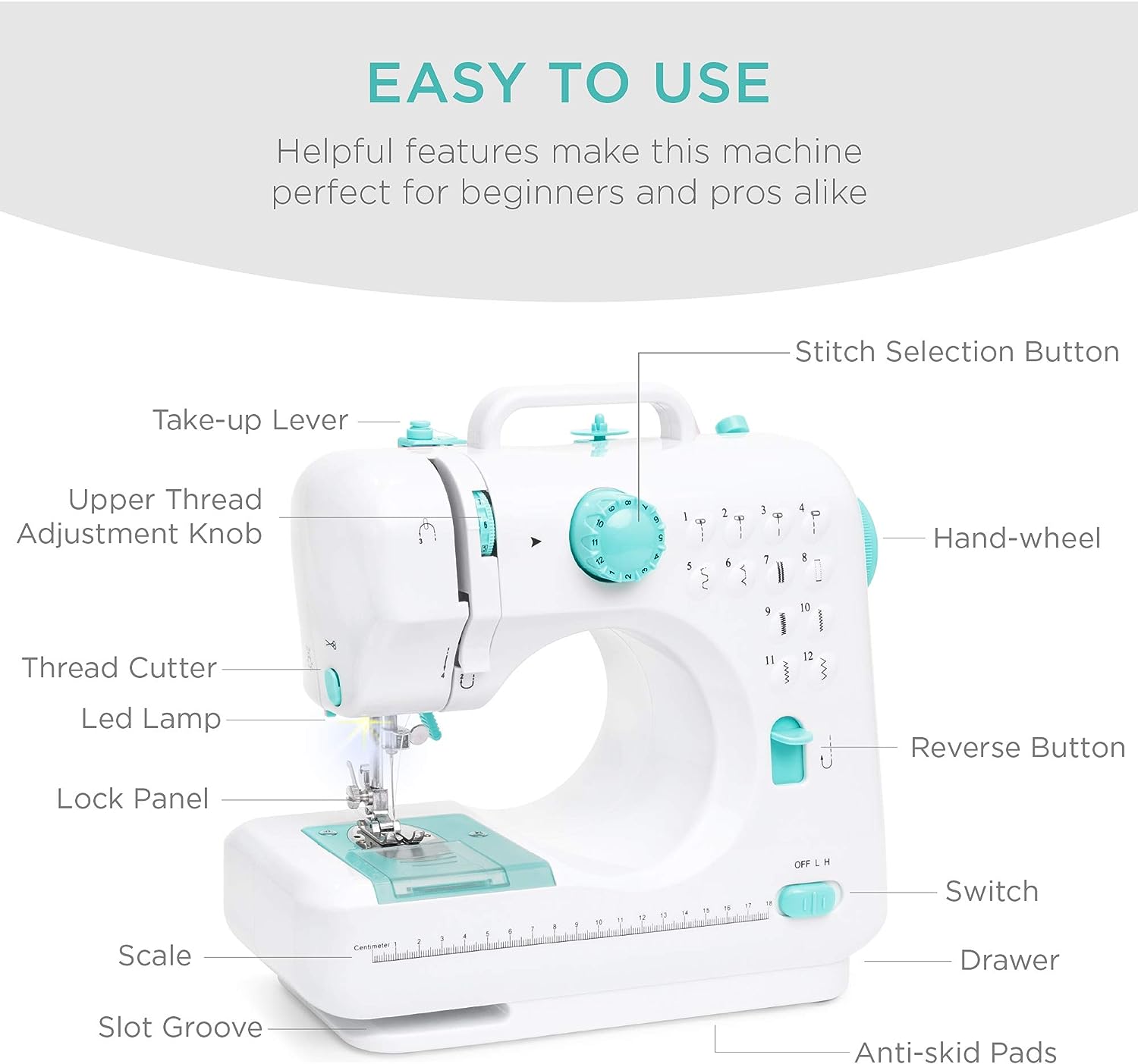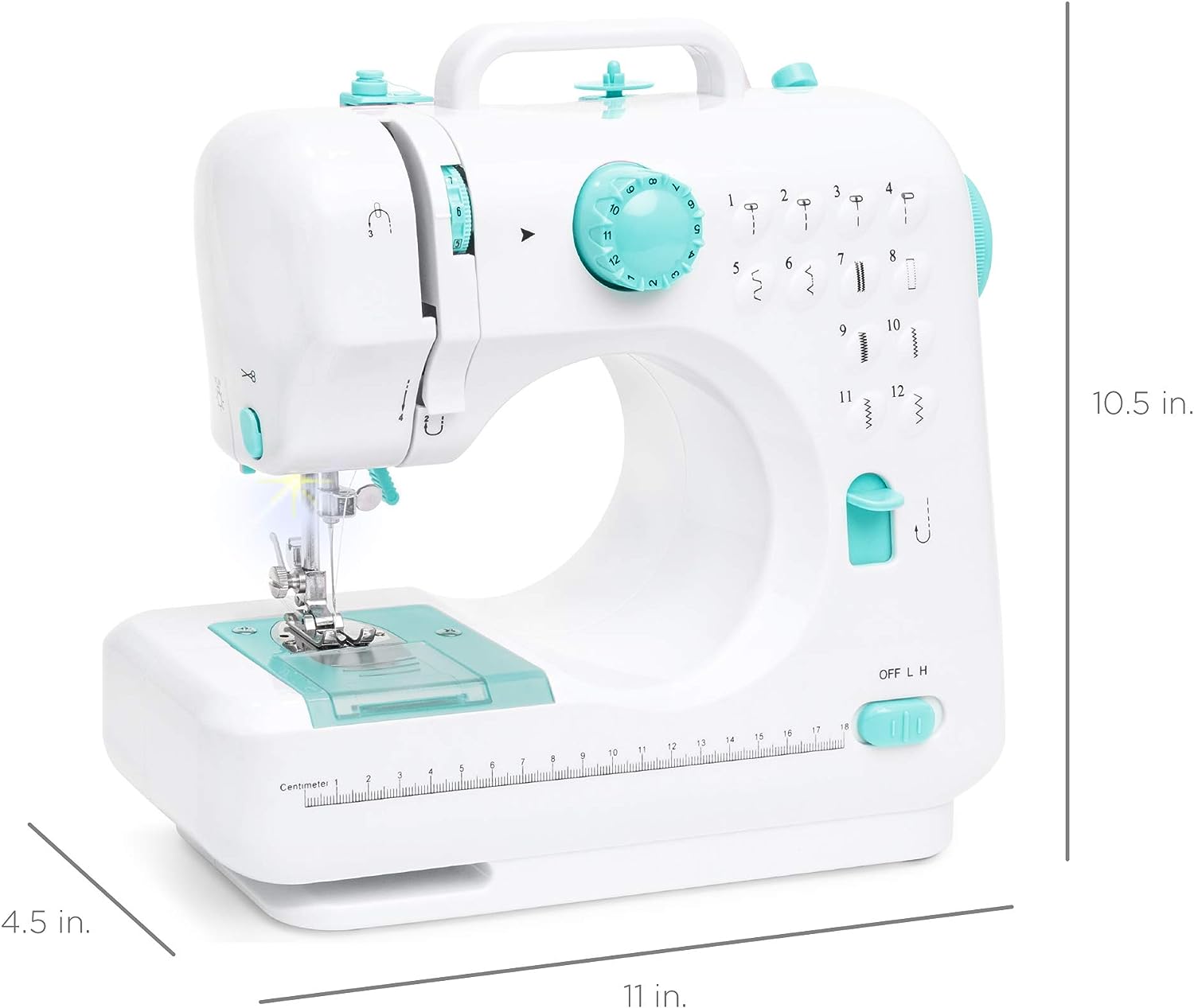 Best Choice Products Compact Sewing Machine. 42-Piece Beginners Kit. Multifunctional Portable 6V Beginner Sewing Machine w/ 12 Stitch Patterns. Light. Foot Pedal. Storage Drawer - Teal/White