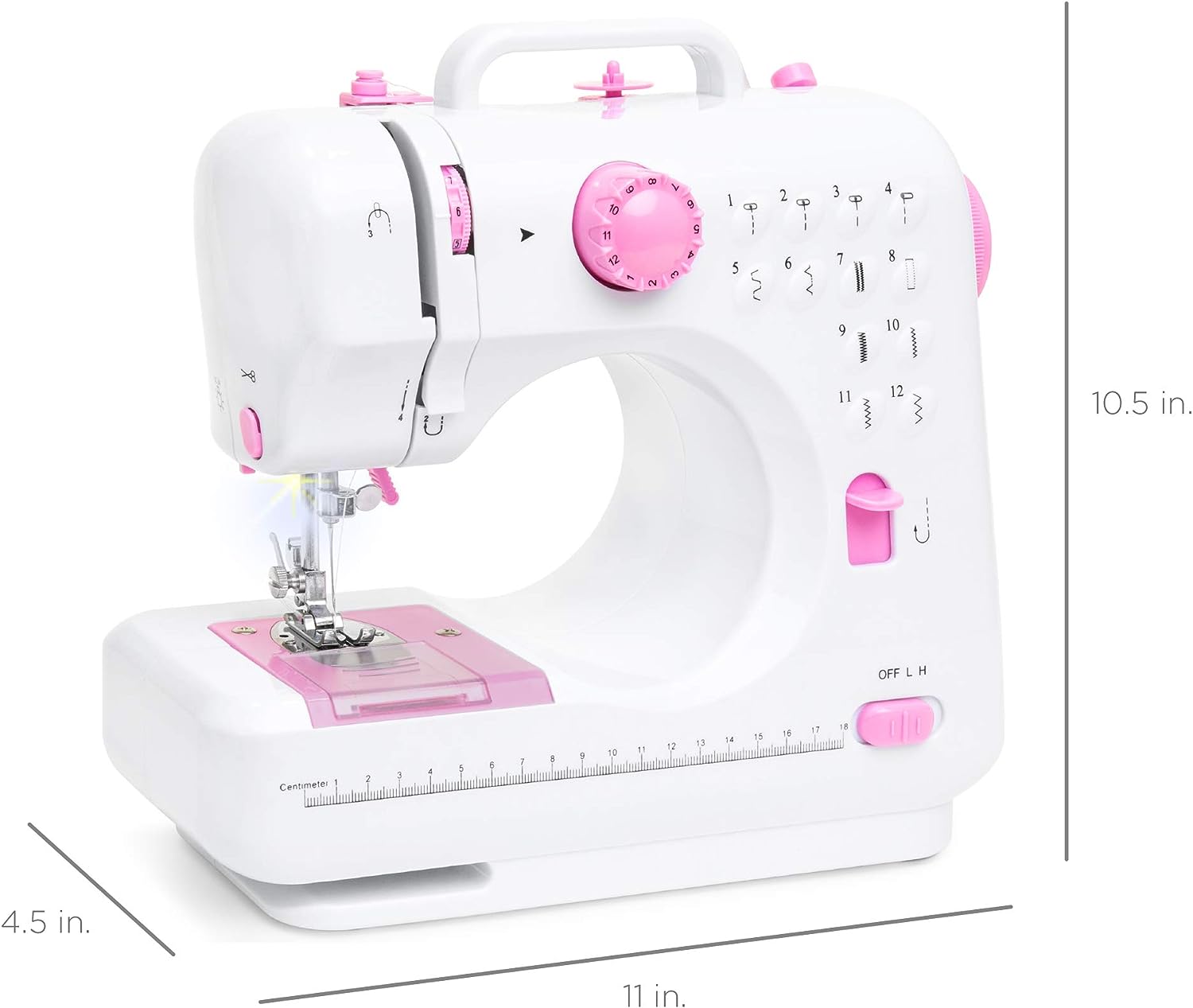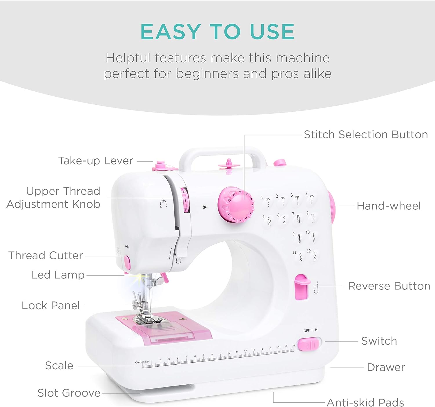 Best Choice Products Compact Sewing Machine. 42-Piece Beginners Kit. Multifunctional Portable 6V Beginner Sewing Machine w/ 12 Stitch Patterns. Light. Foot Pedal. Storage Drawer - Pink/White