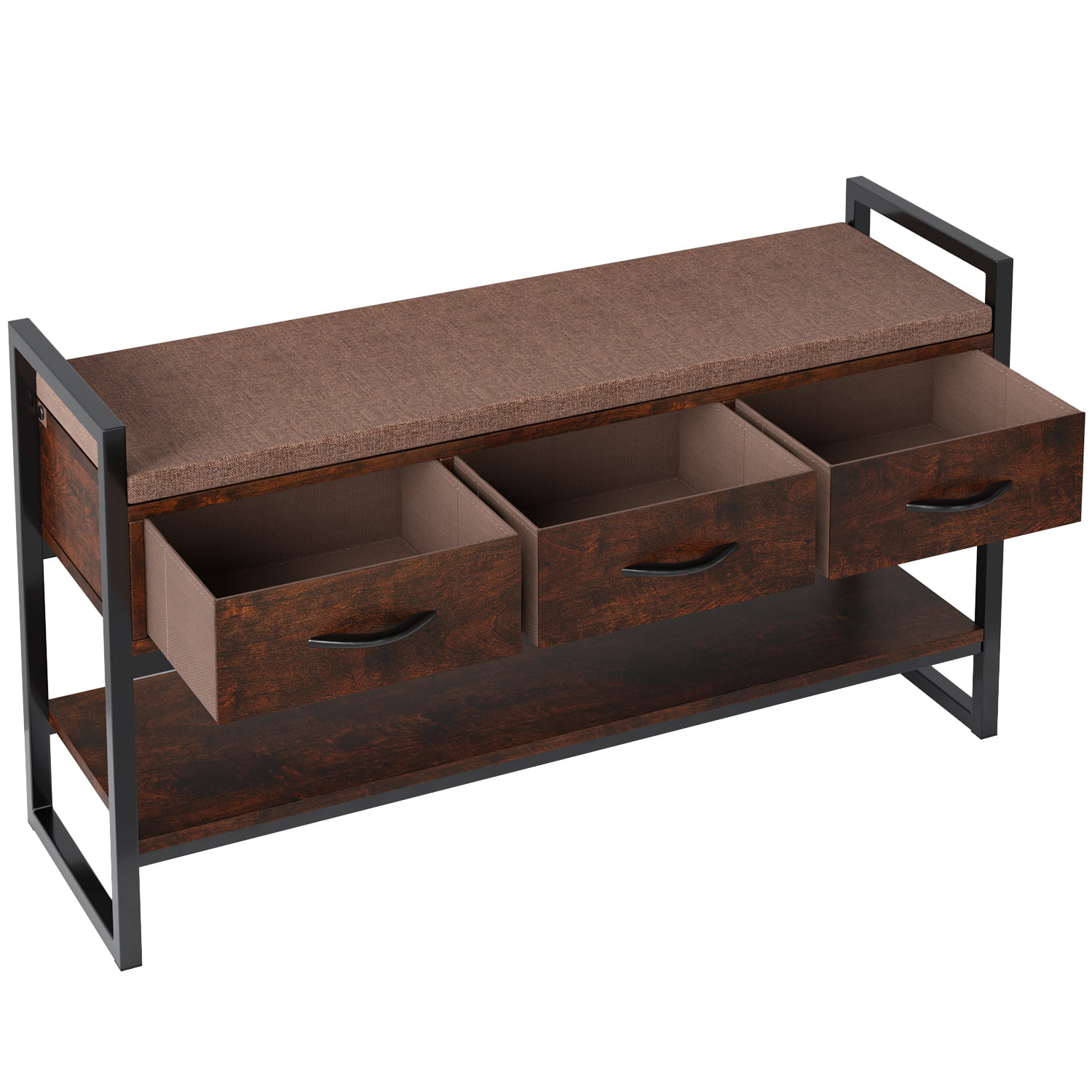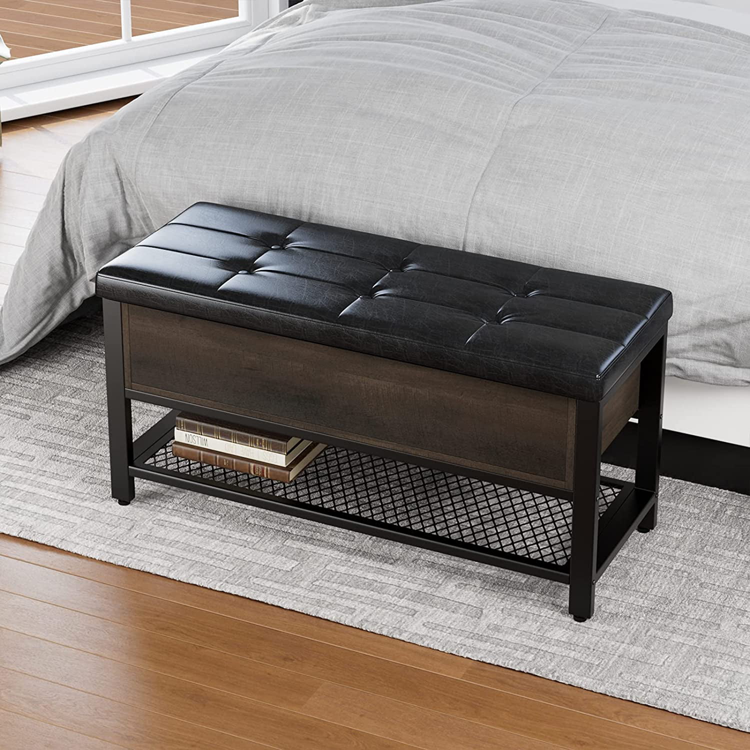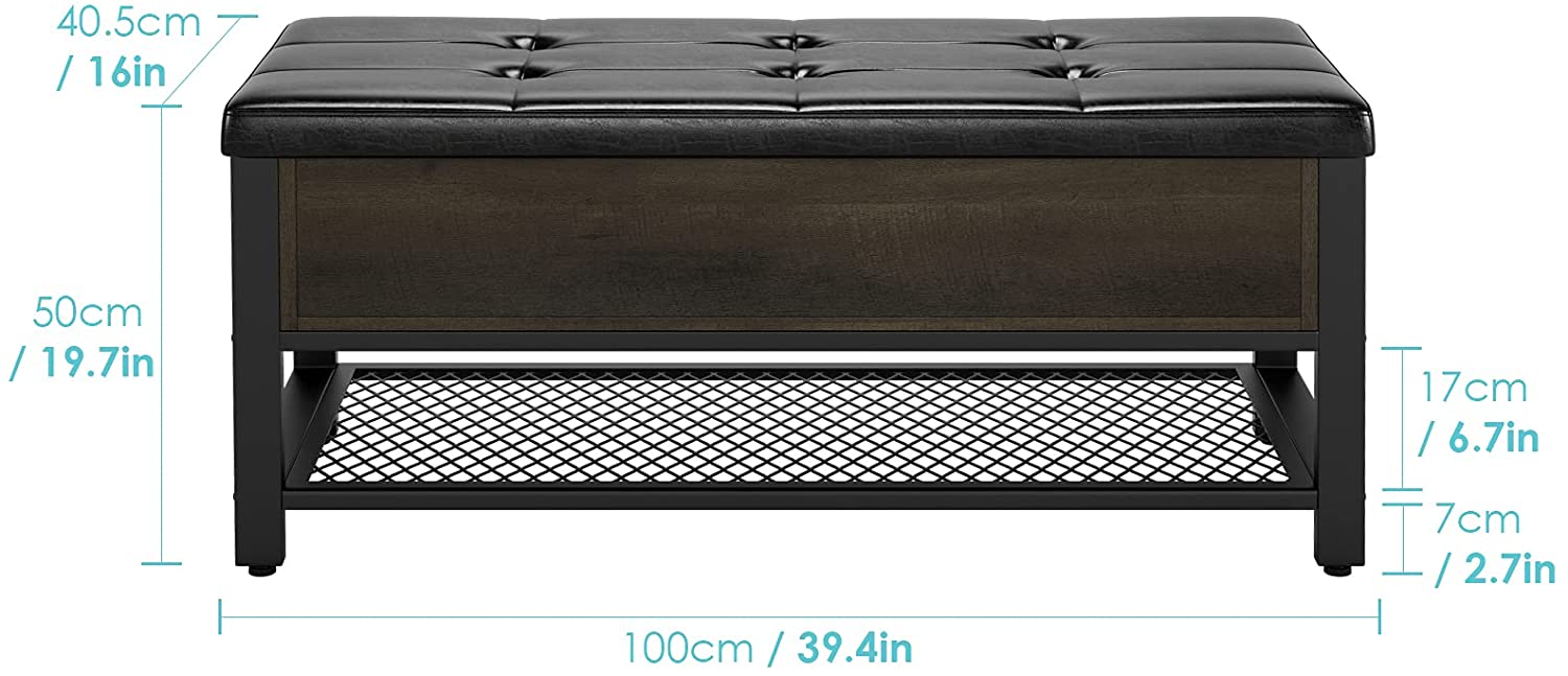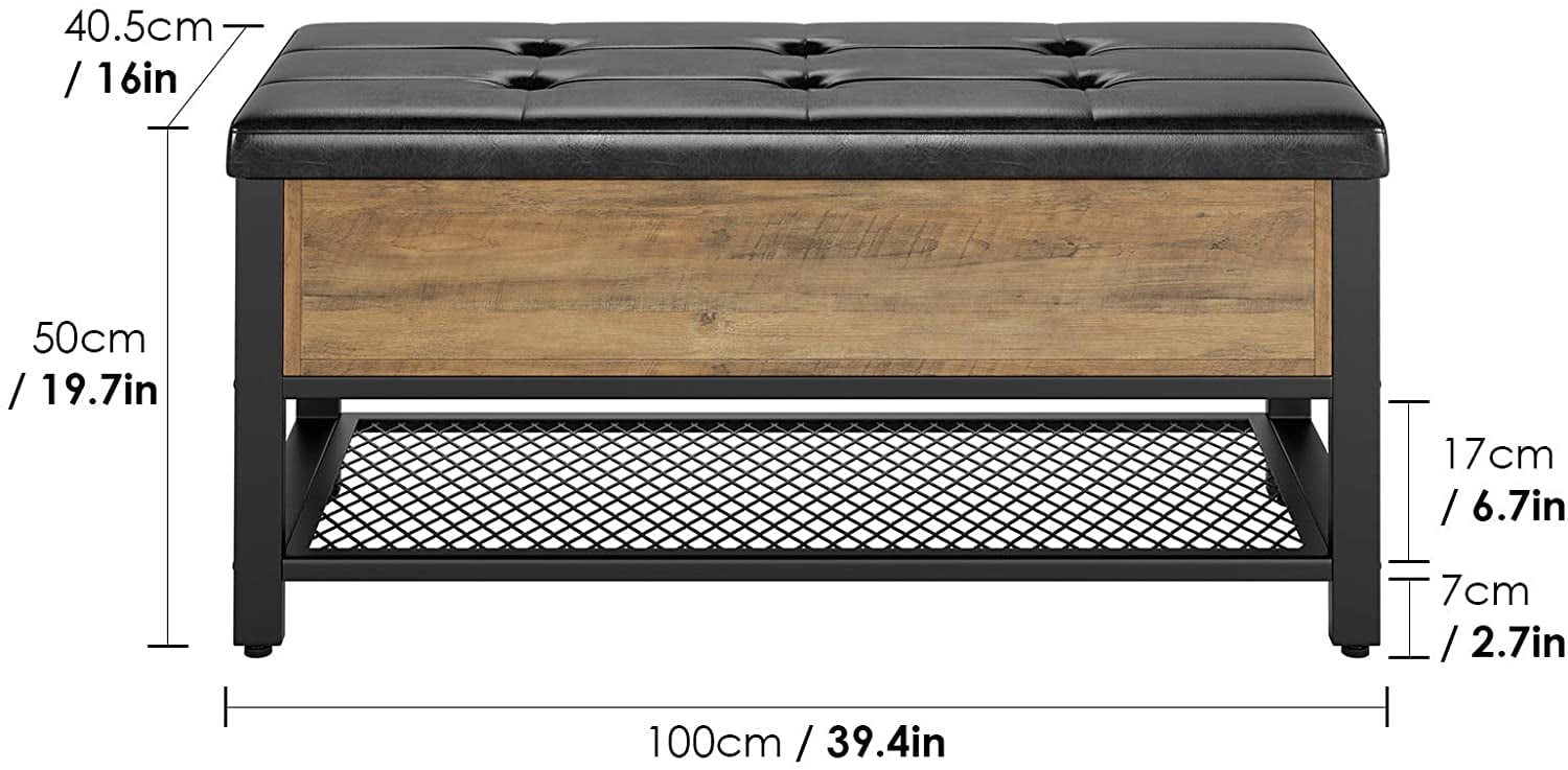 Homfa Storage Bench with Storage. Long Shoe Bench with Flip Top and Leather Padded Seat and Bottom Steel Shelf for Hallway. Living Room. Bedroom. Rustic Brown and Black