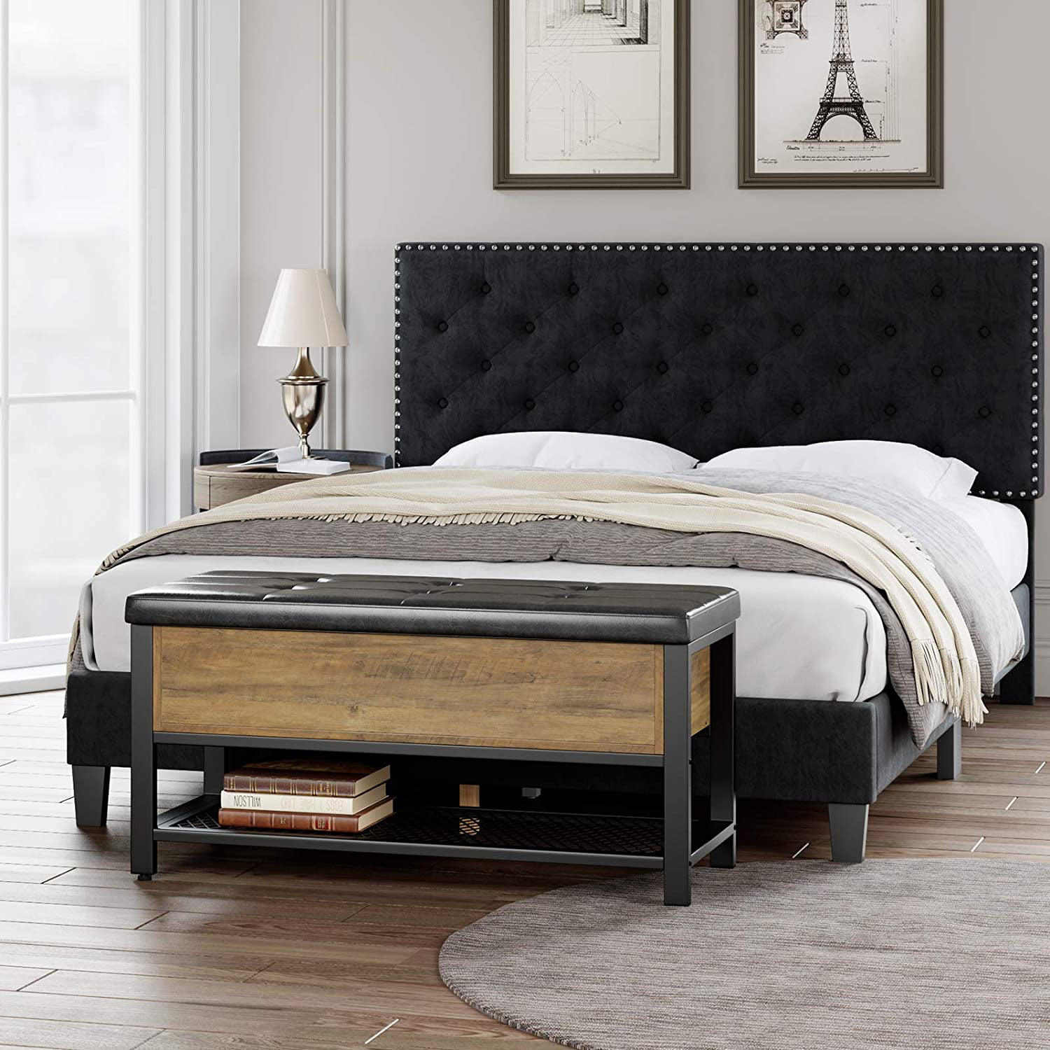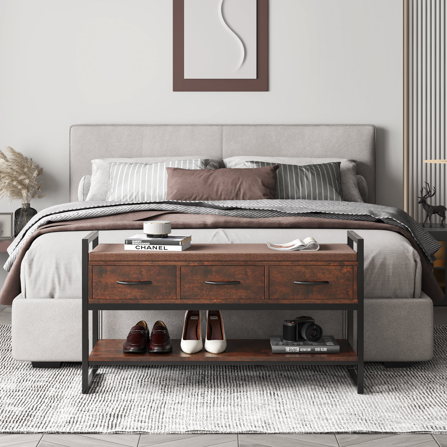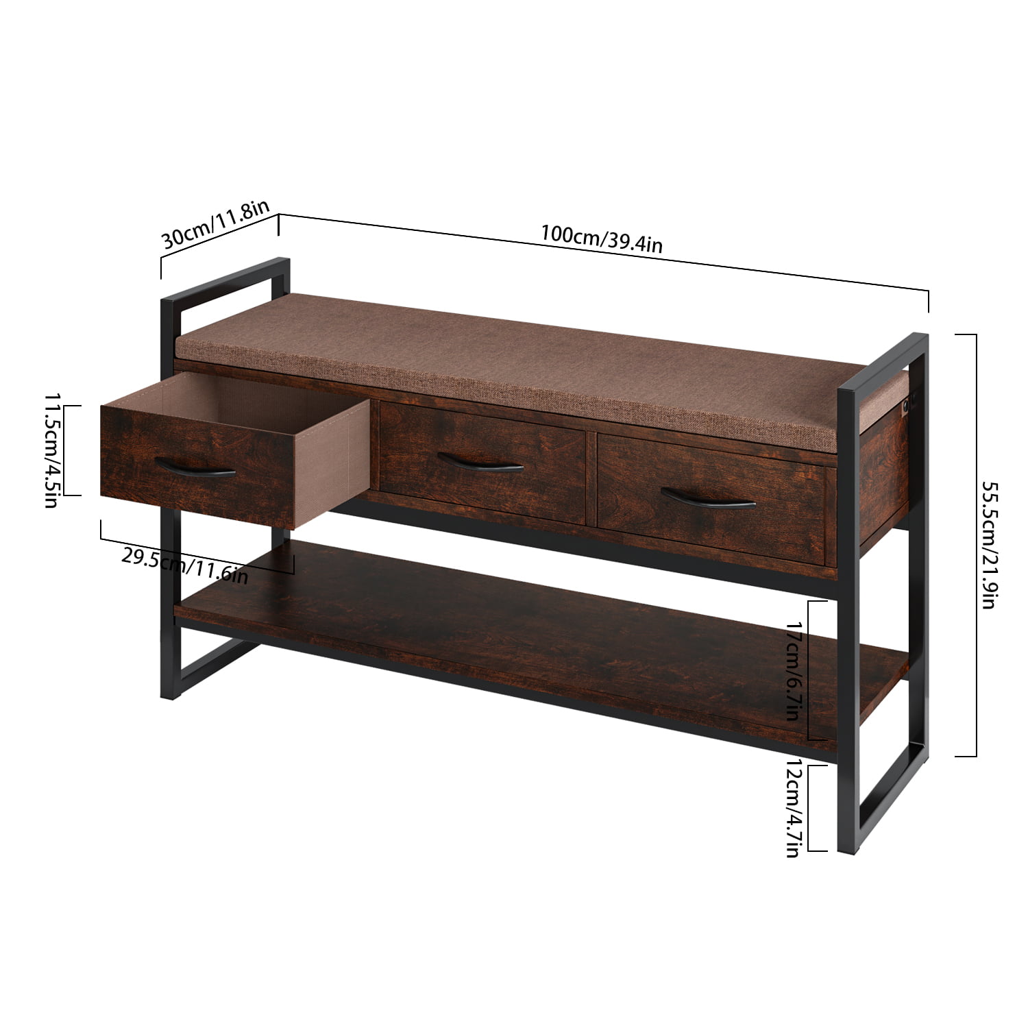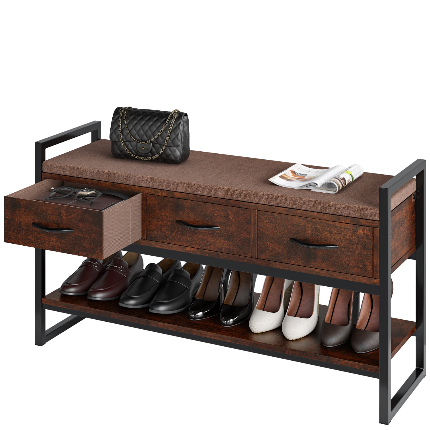 Homfa Storage Bench with Storage. Long Shoe Bench with Flip Top and Leather Padded Seat and Bottom Steel Shelf for Hallway. Living Room. Bedroom. Rustic Brown and Black