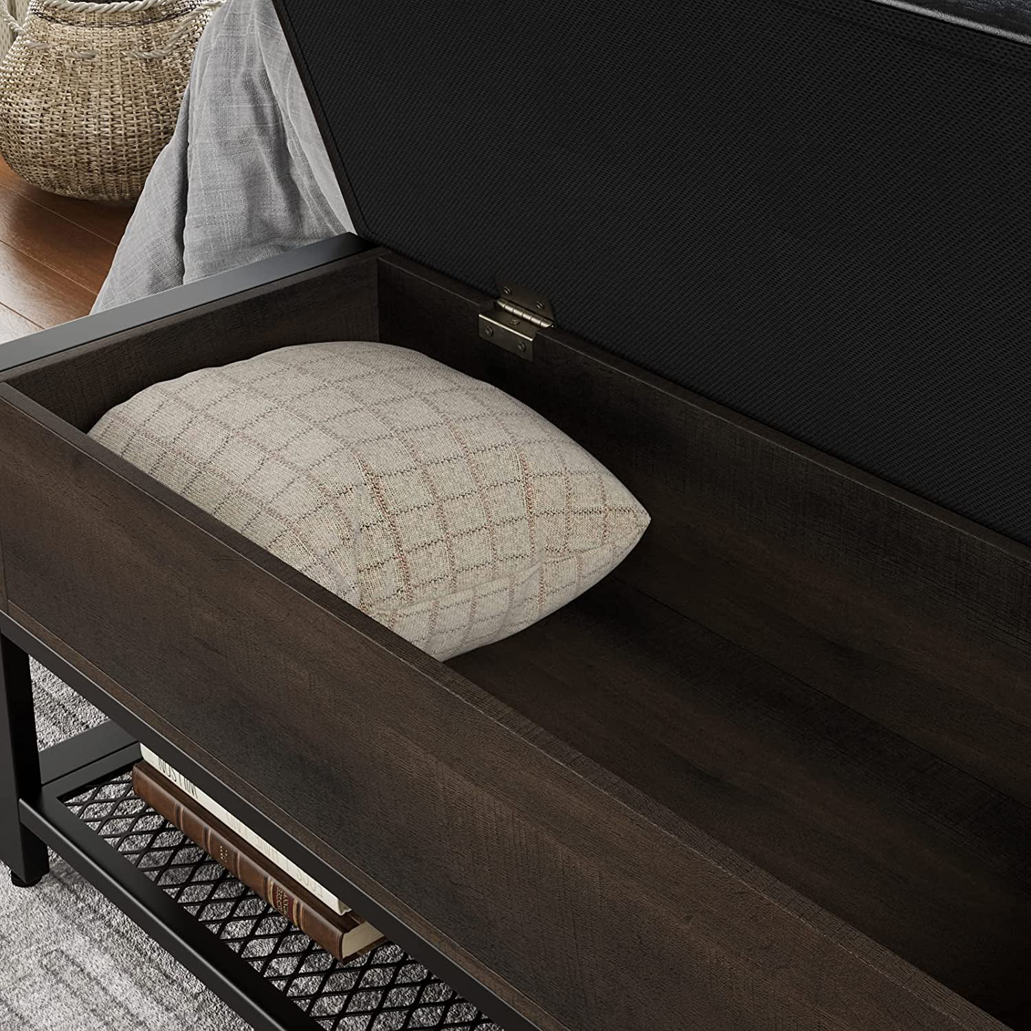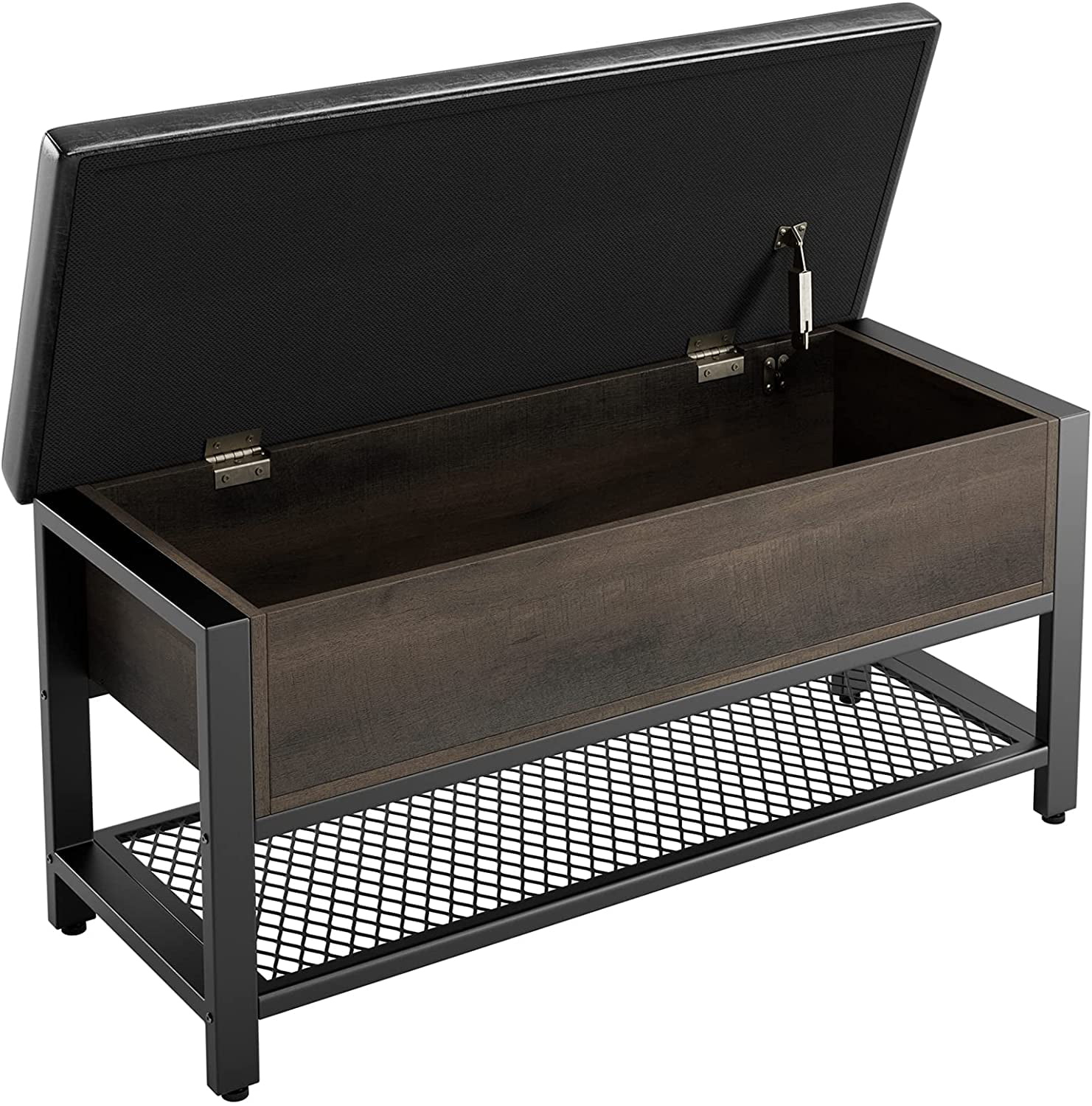 Industrial Storage Bench. Flip Top Long Shoe Bench. Bed End Stool with Leather Padded Seat and Steel Shelf. for Hallway. Foyer. Living Room. Bedroom. Dark Brown and Black Finish
