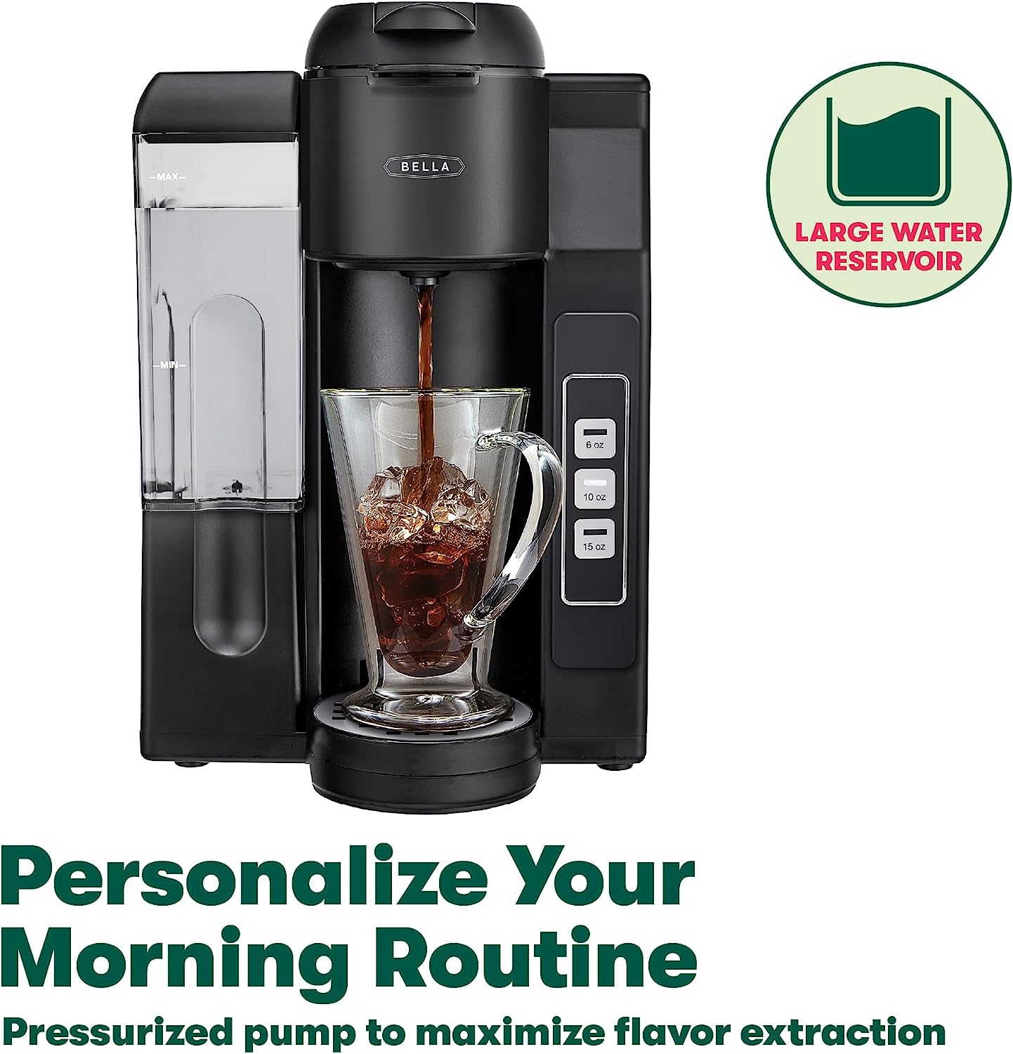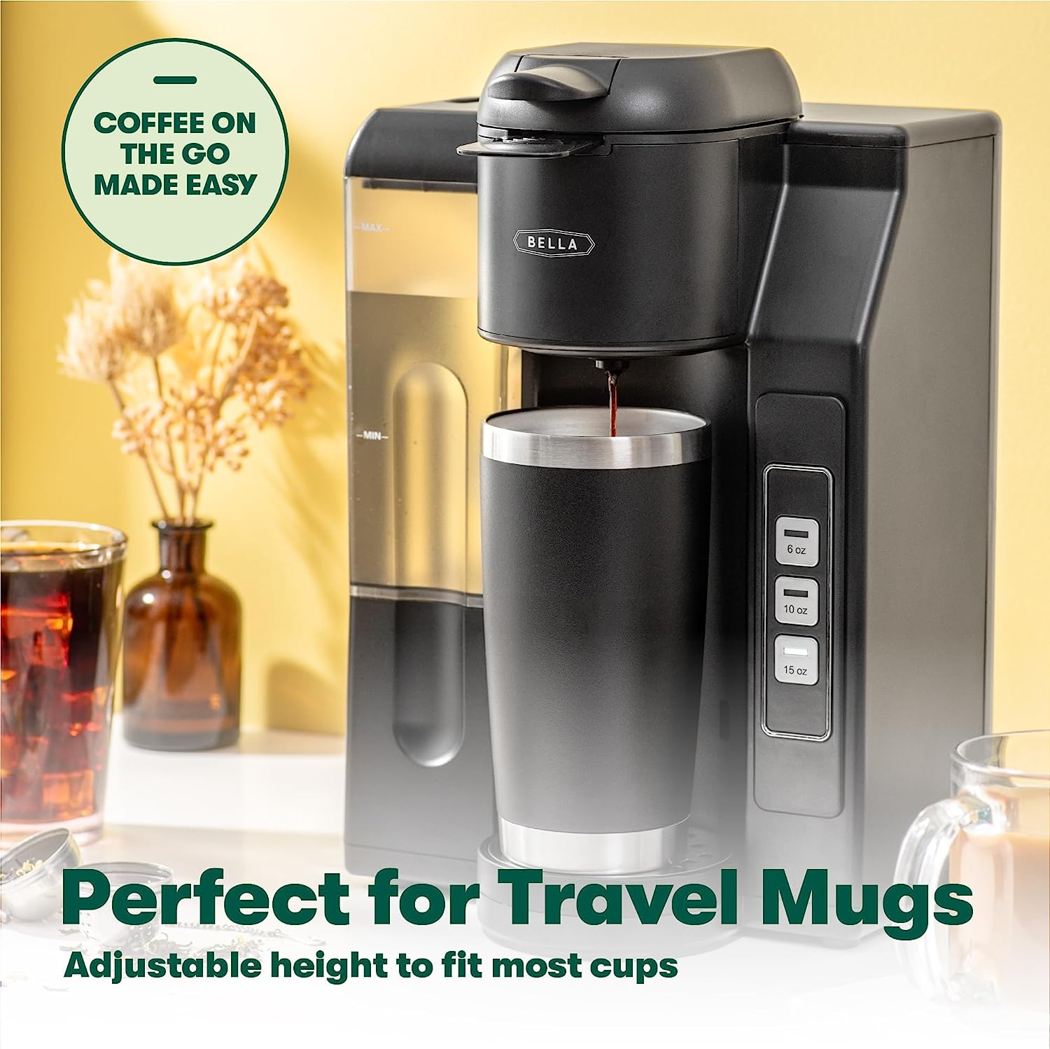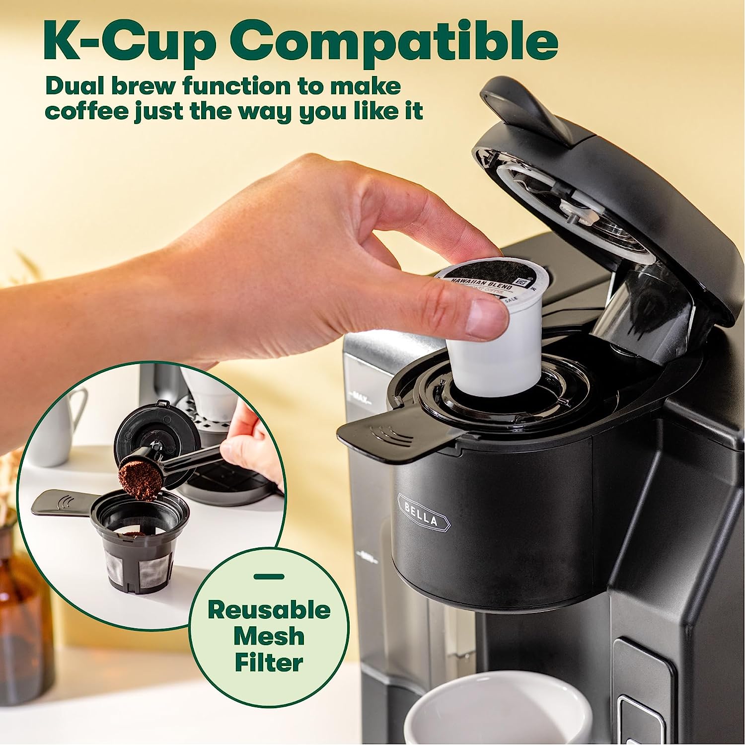 BELLA Single Serve Coffee Maker. Dual Brew. K-cup Compatible - Ground Coffee Brewer with Removable Water Tank & Adjustable Drip Tray. Perfect for Travel