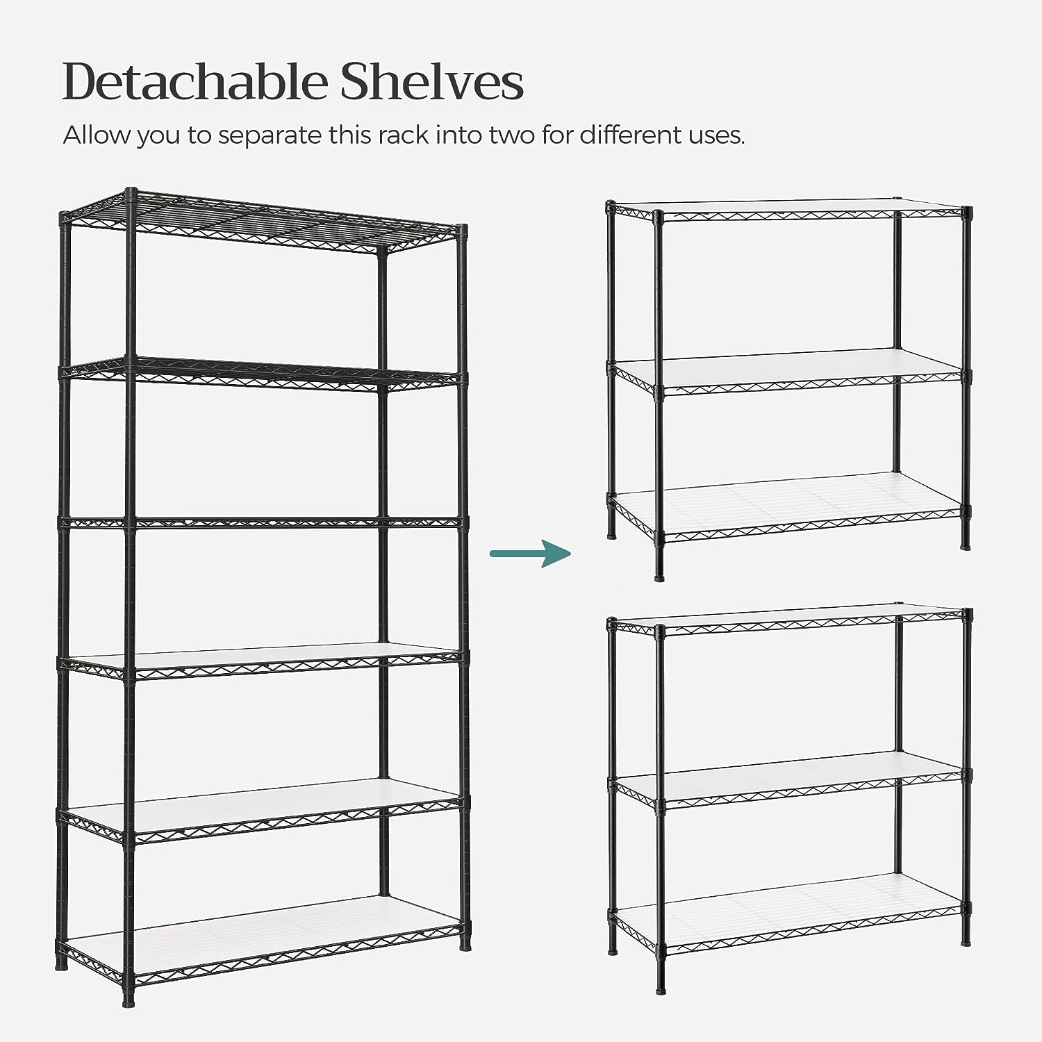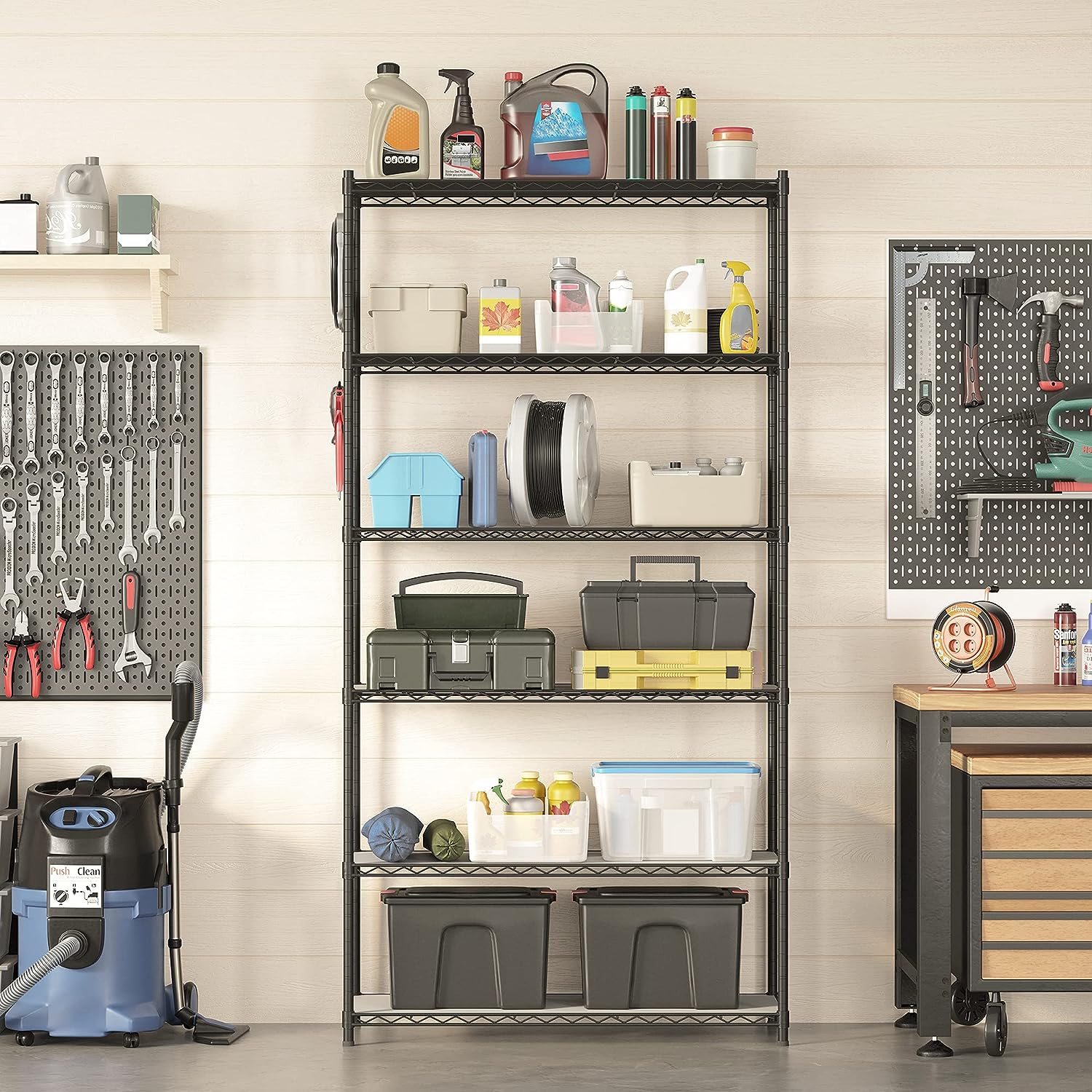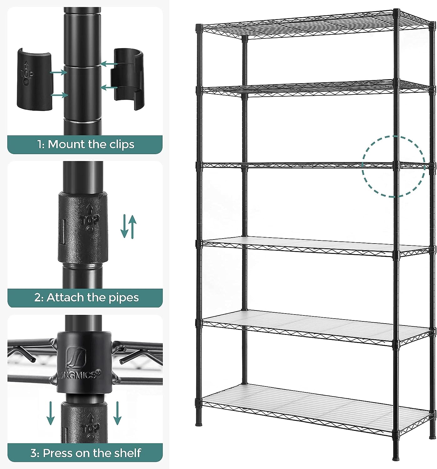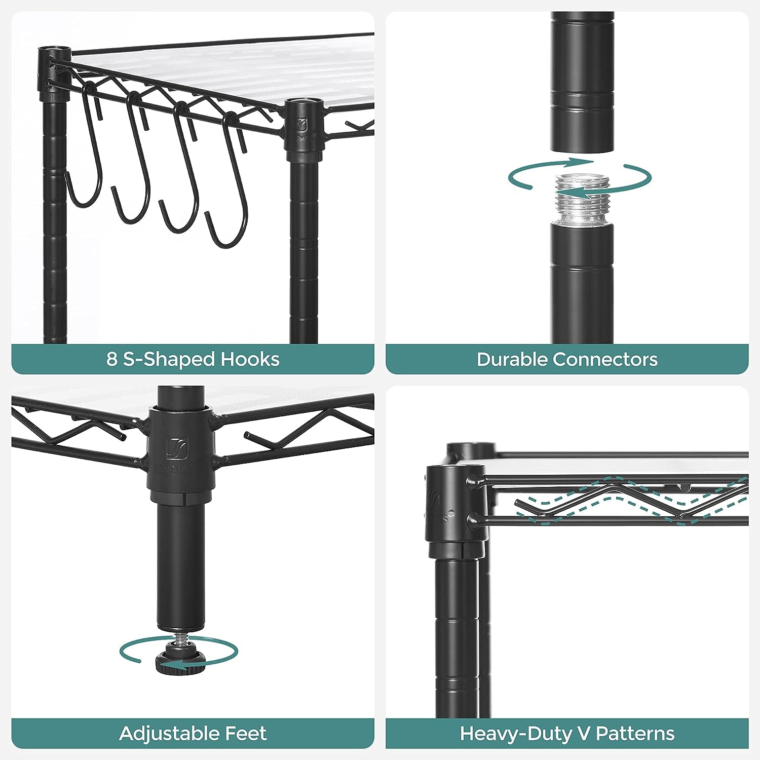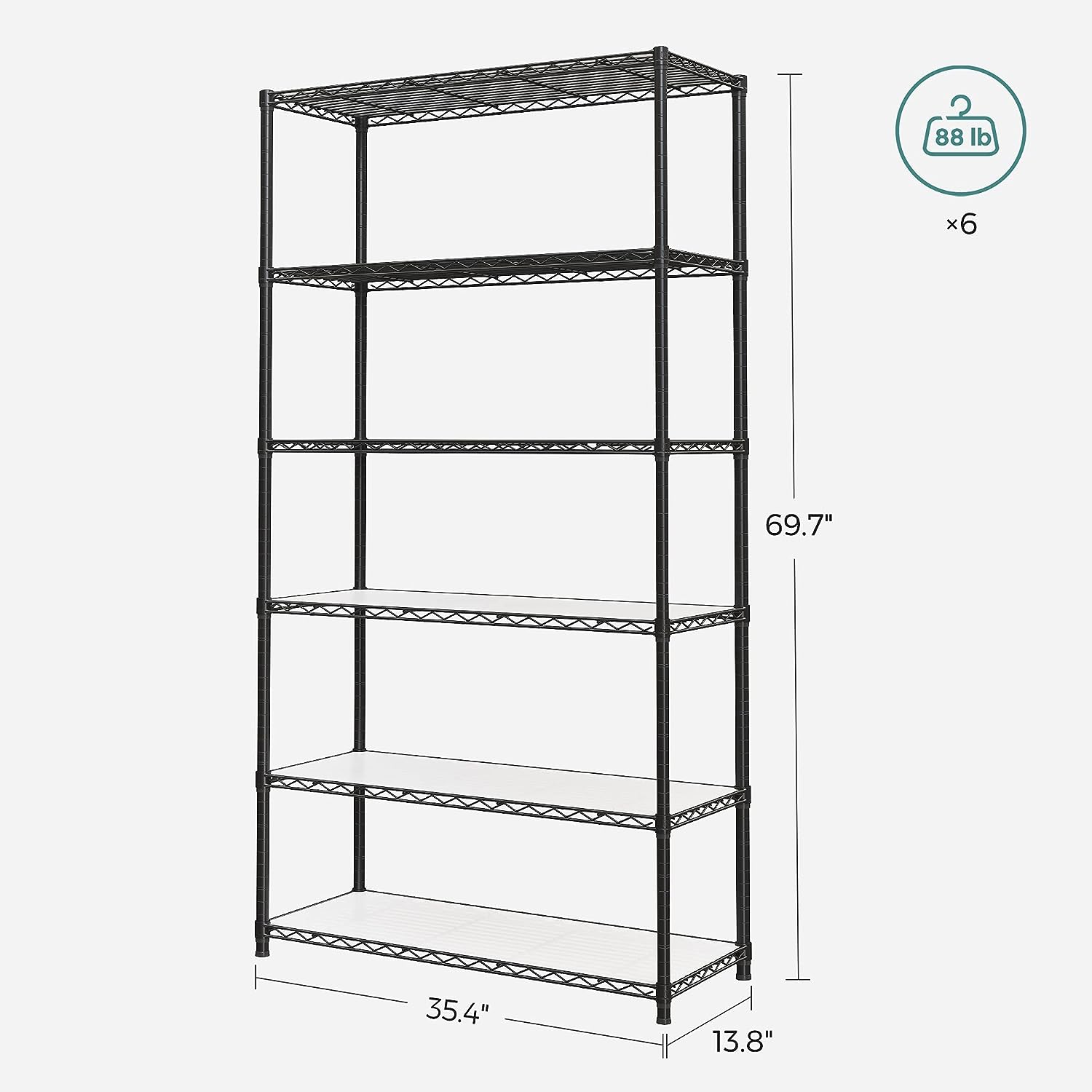 SONGMICS Garage Shelving. 6-Tier Wire Shelving Unit. Kitchen Storage Rack with Adjustable Shelves. Shelf Liners. 8 Hooks. Total Max. Load 528 lb. for Living Room. Garage. Black ULGR096B01