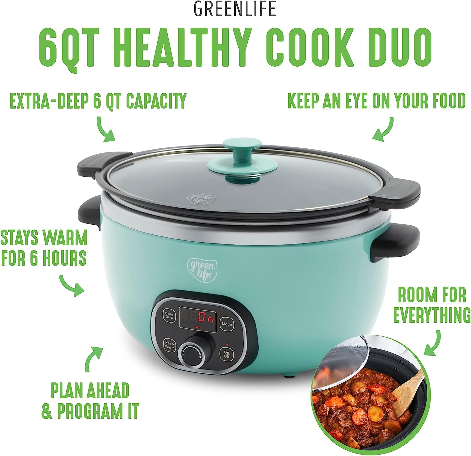 GreenLife Cook Duo Healthy Ceramic Nonstick Programmable 6 Quart Family-Sized Slow Cooker. PFAS-Free. Removable Lid and Pot. Digital Timer. Dishwasher Safe Parts. Turquoise