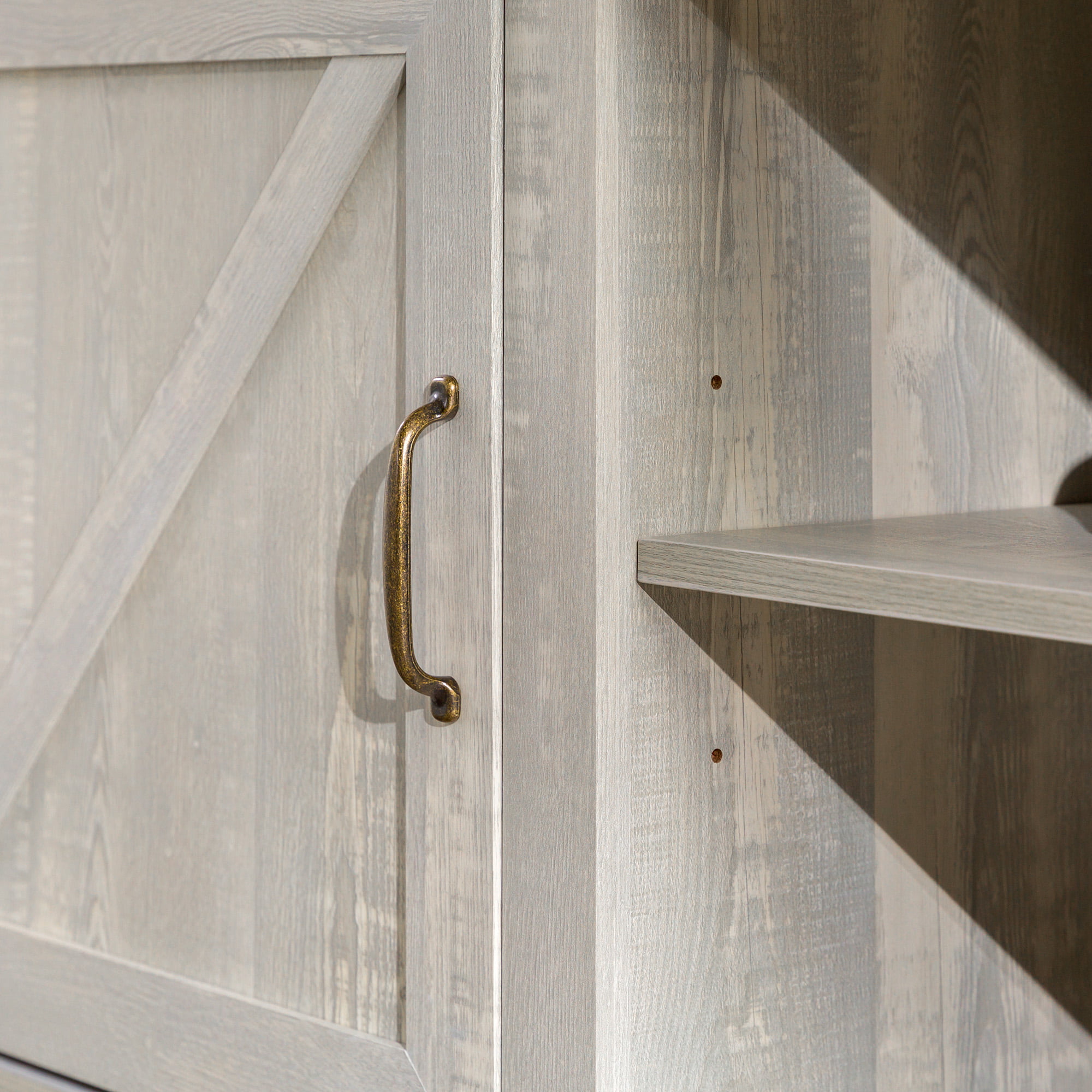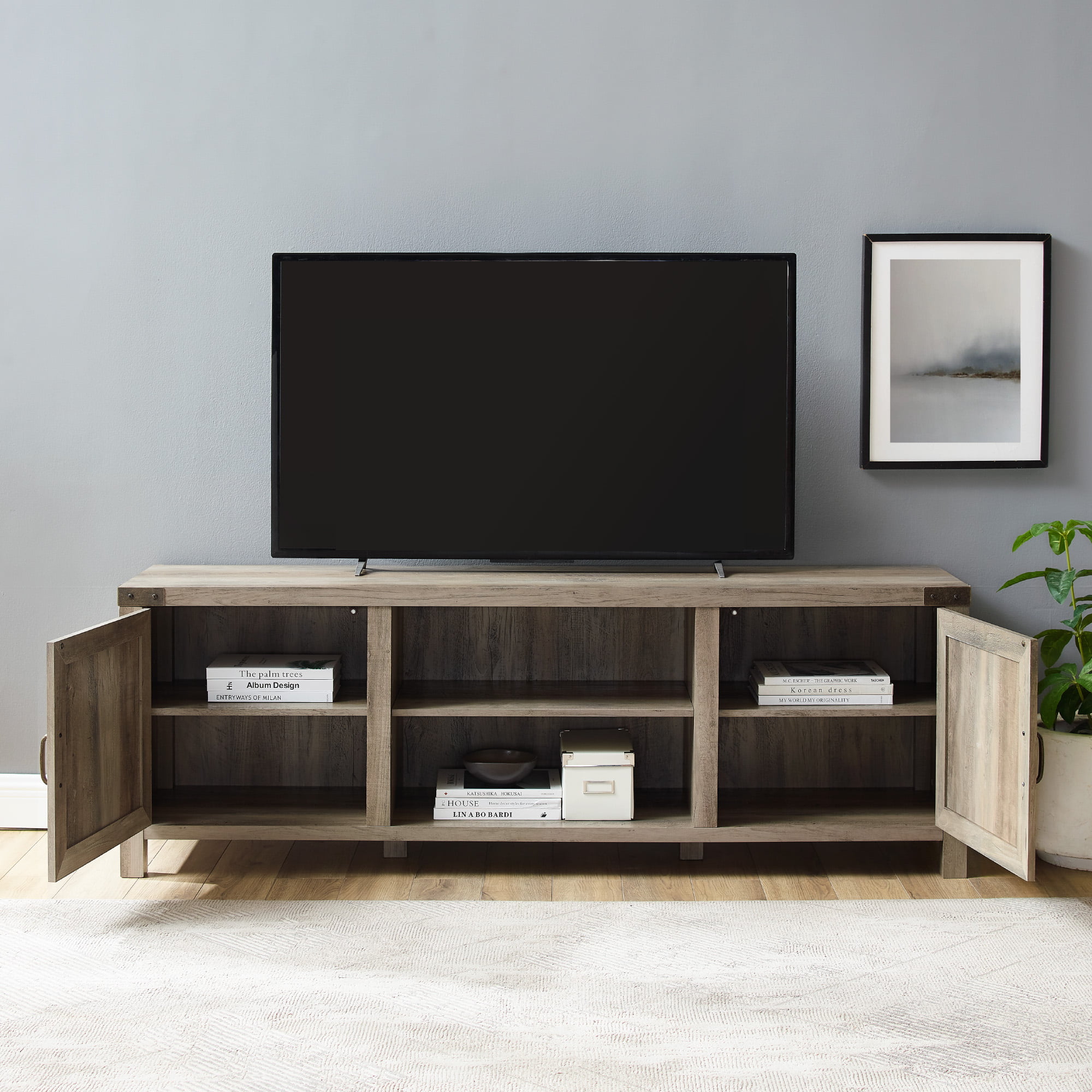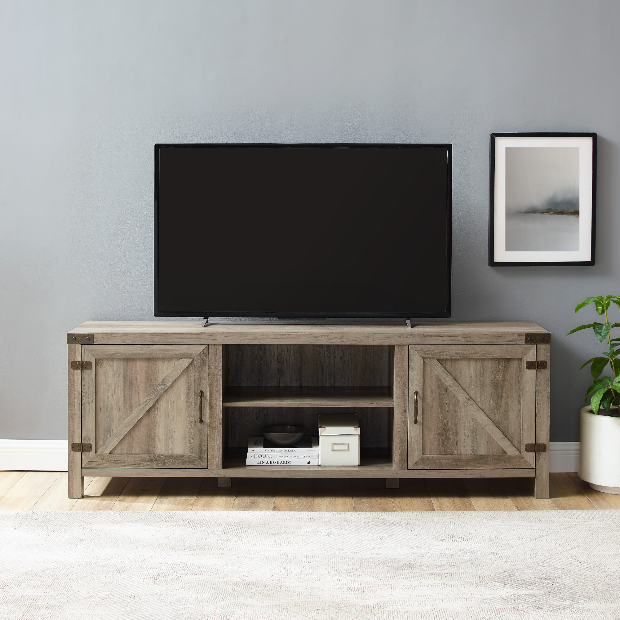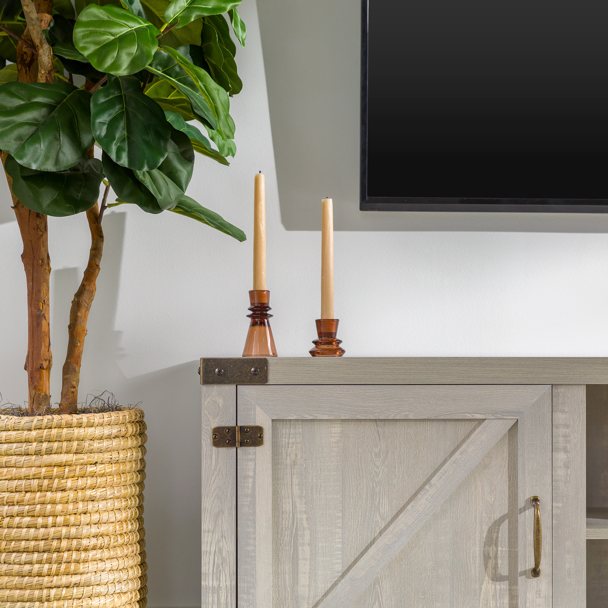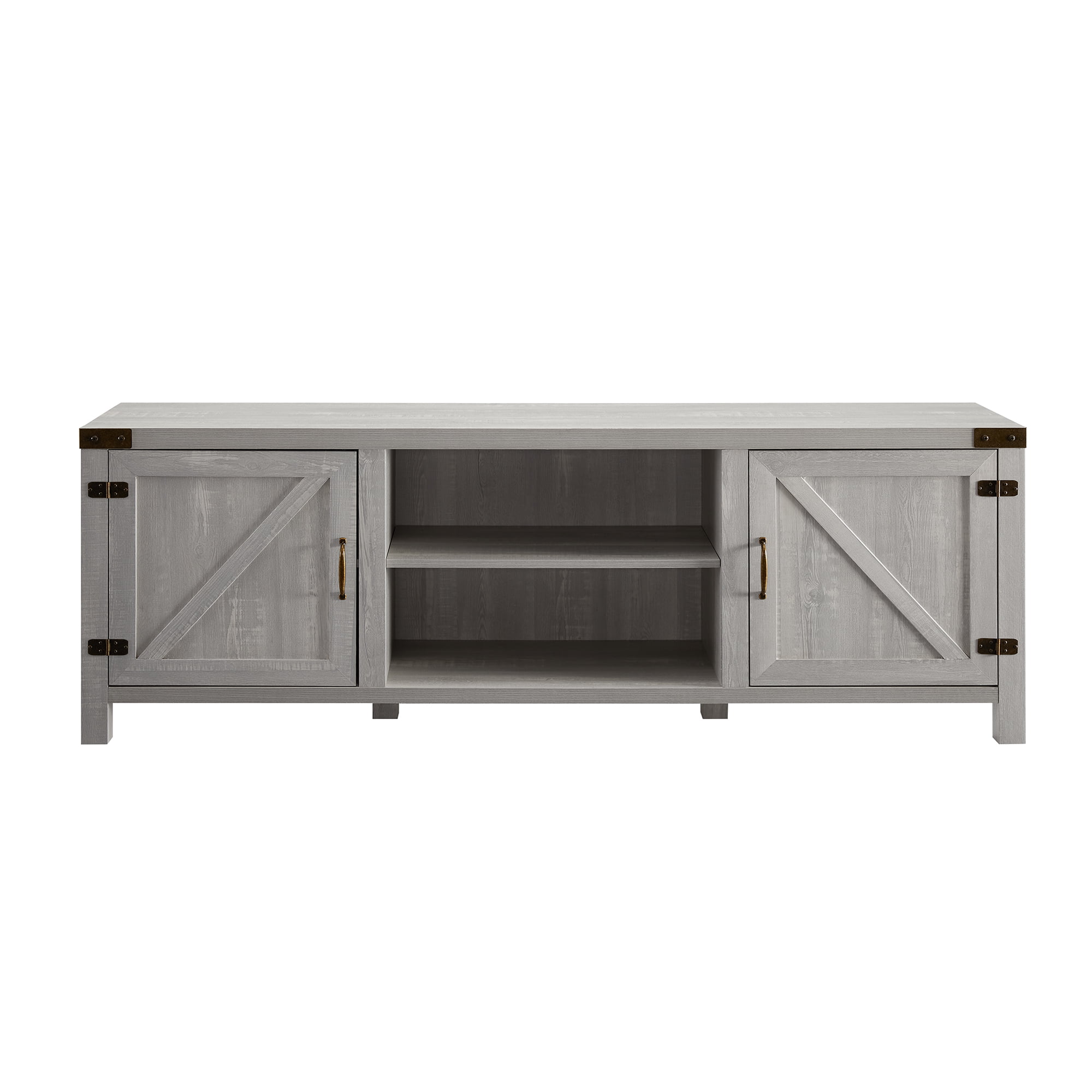 Woven Paths Farmhouse Barn Door TV Stand for TVs up to 80″. Grey Wash