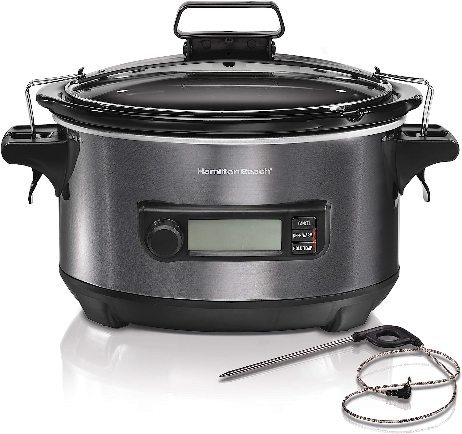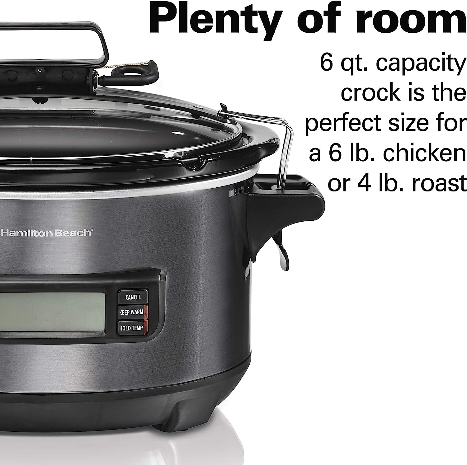 Hamilton Beach Portable 6 Quart Set & Forget Digital Programmable Slow Cooker with Lid Lock. Temperature Probe. Dishwasher Safe Crock & Lid. Black Stainless (33866)