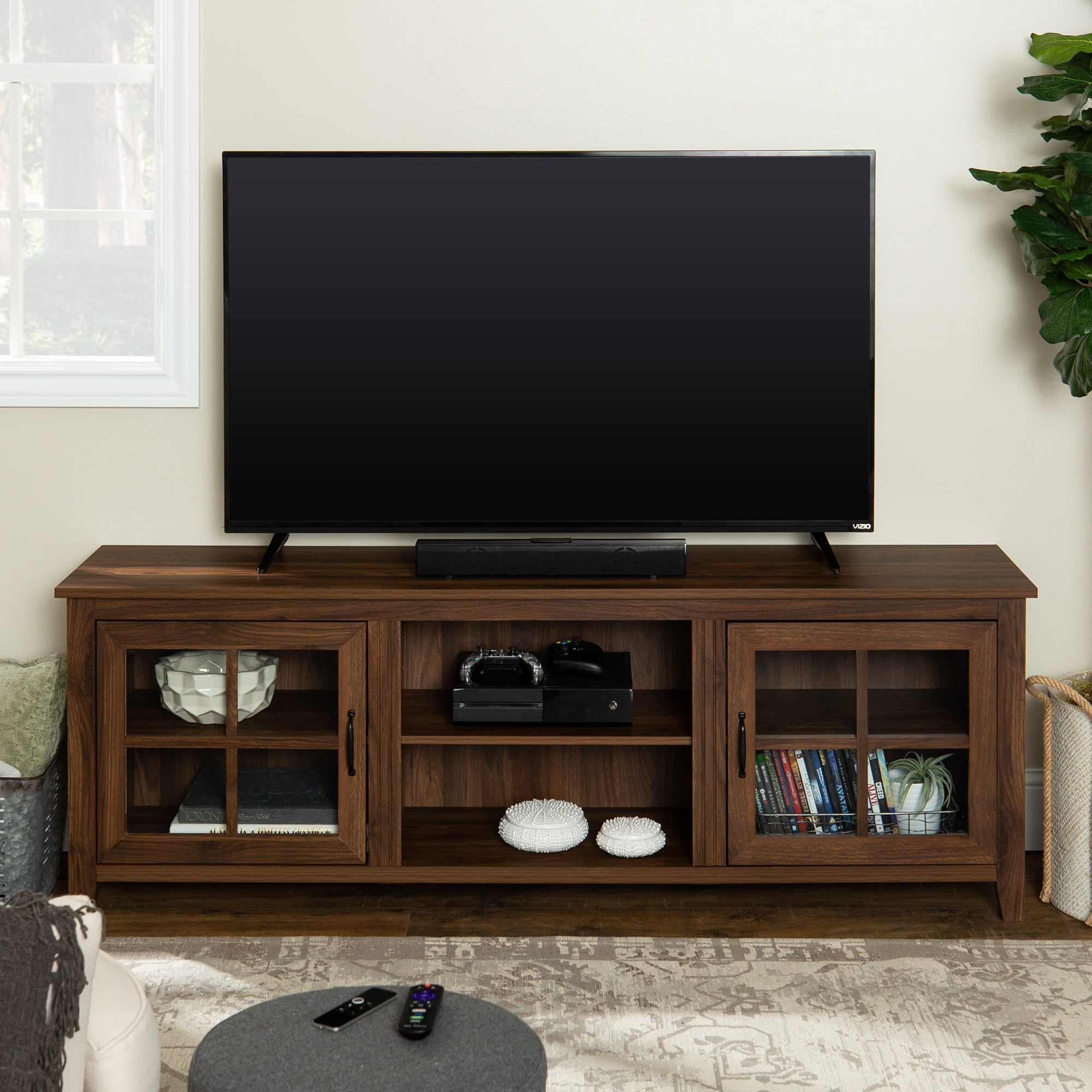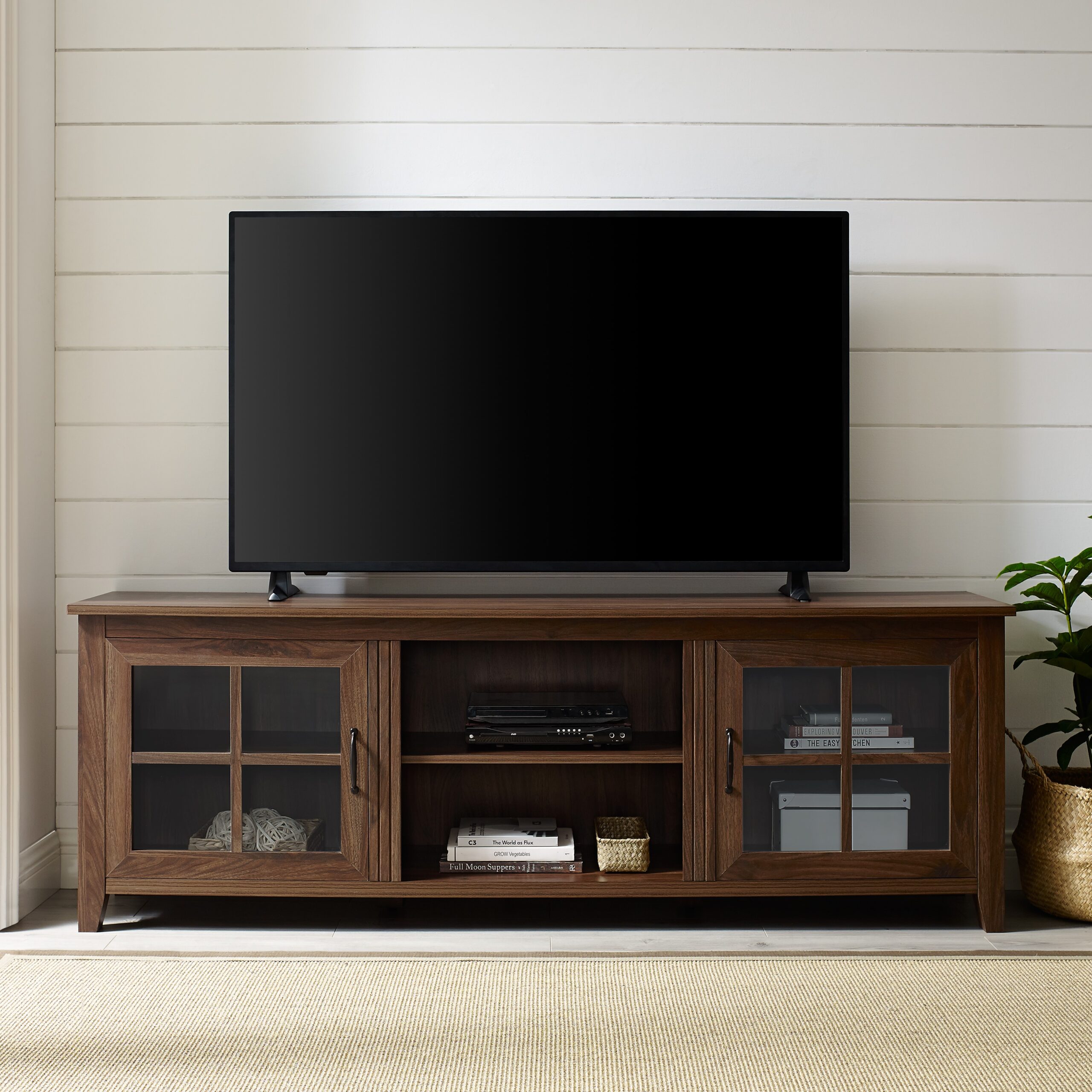 Manor Park Modern Farmhouse TV Stand for TVs Up to 78″. Dark Walnut