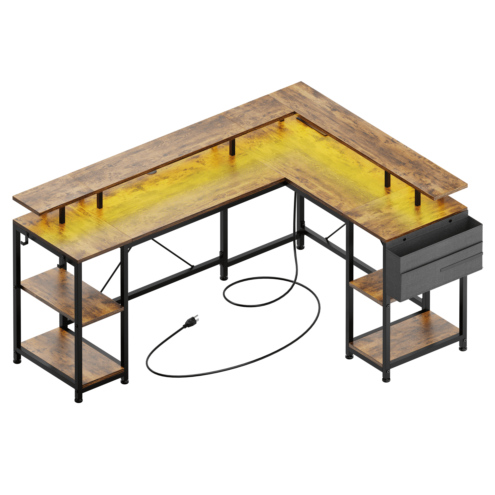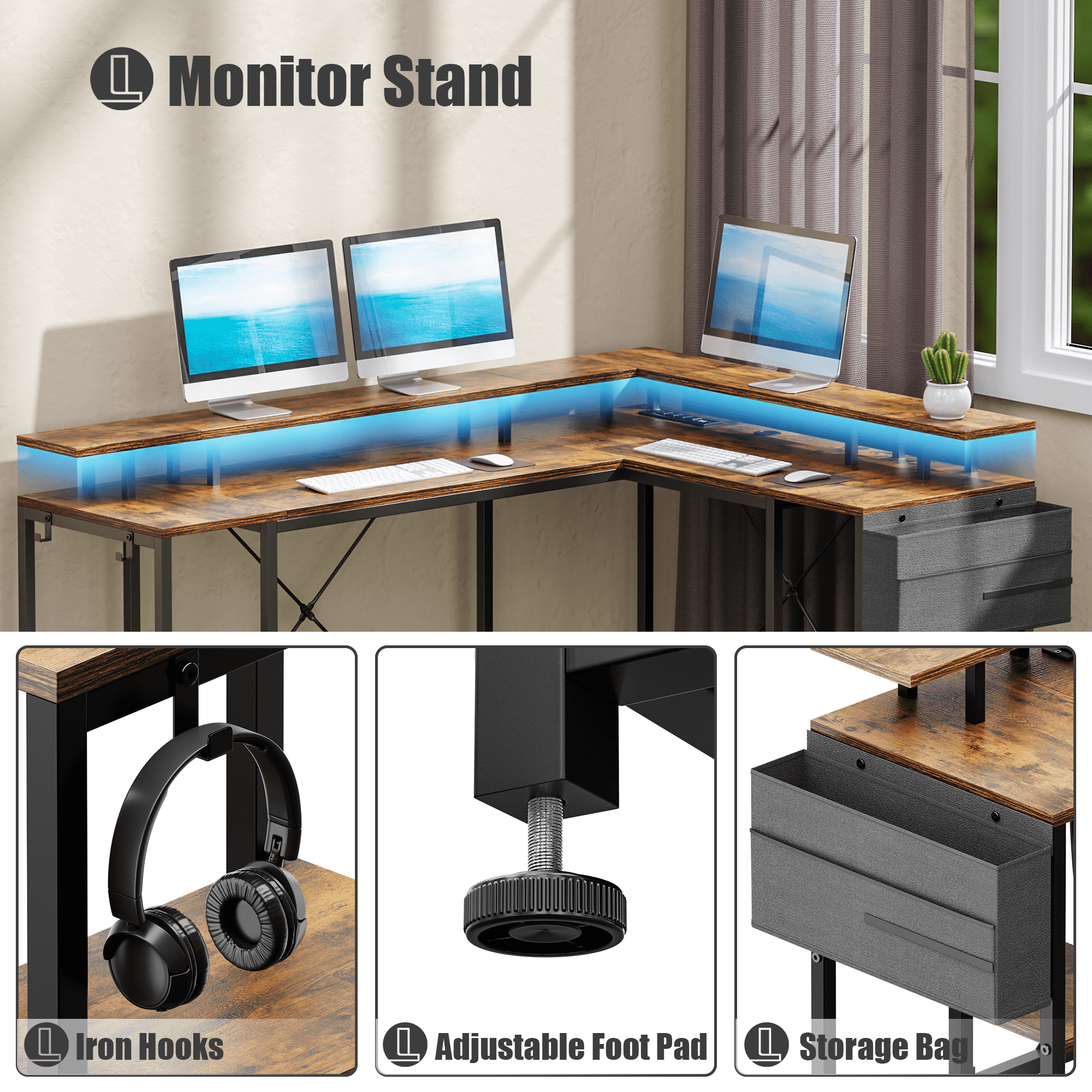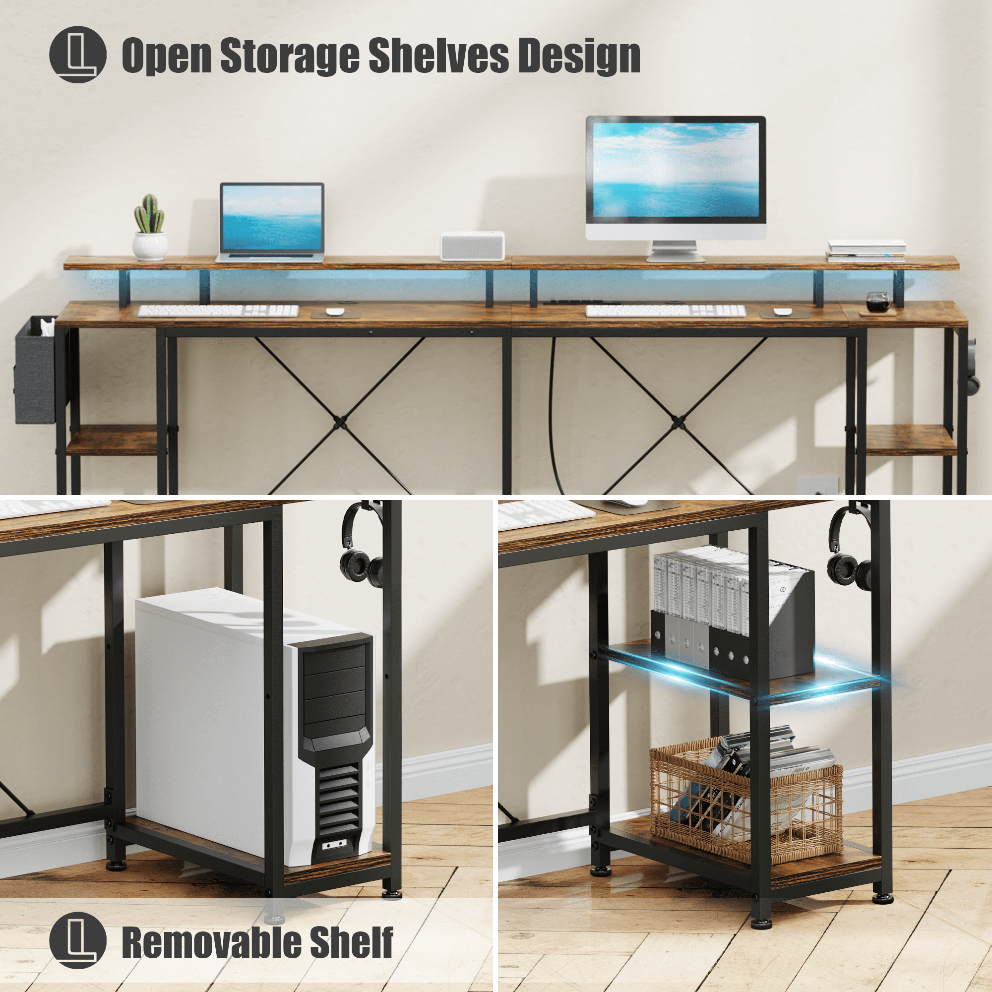 Lulive L Shaped Desk with LED Light and Power Outlet. 95″ Reversible Corner Computer Desk with Monitor Stand and Storage Shelf. Modern L- Shaped Gaming Desk. Brown