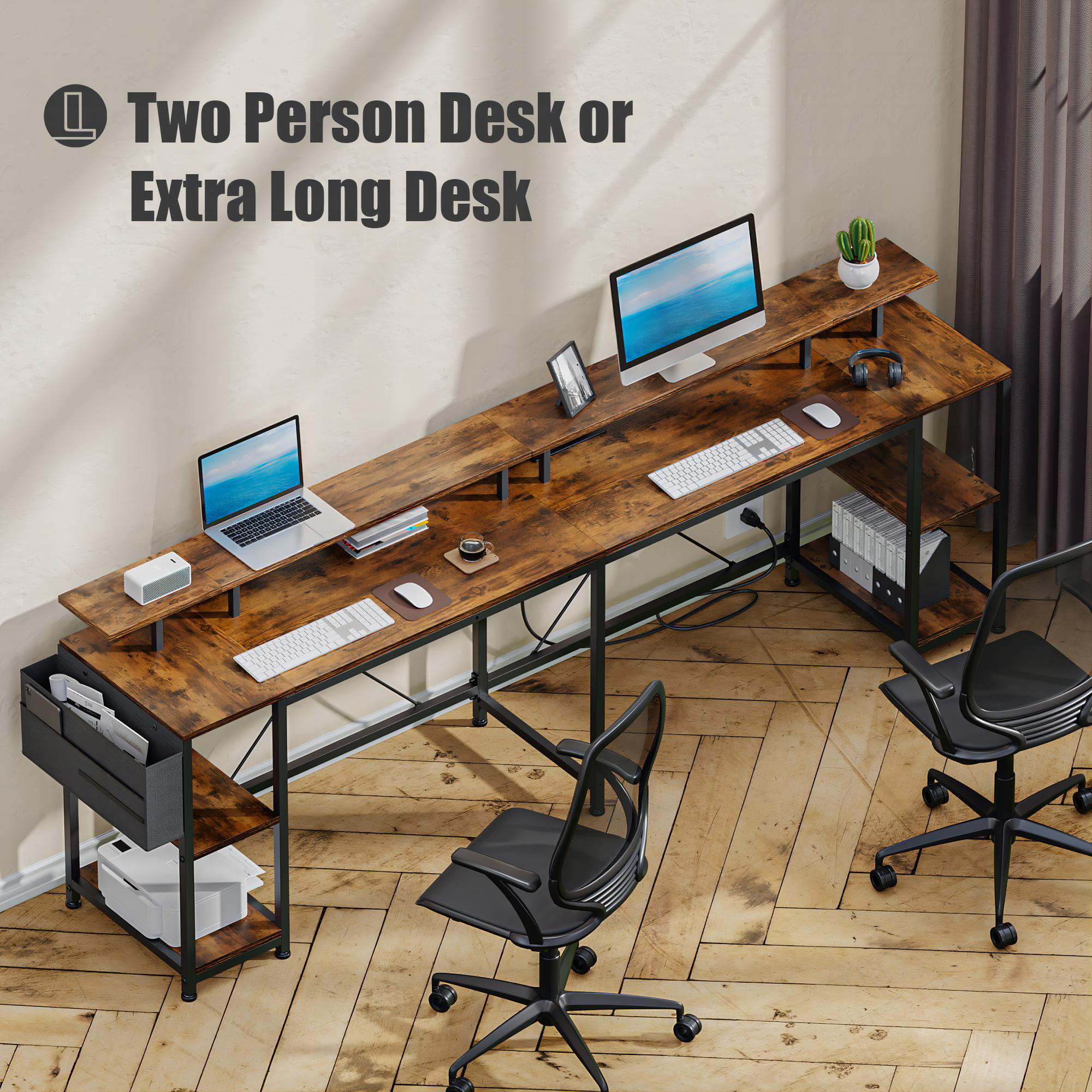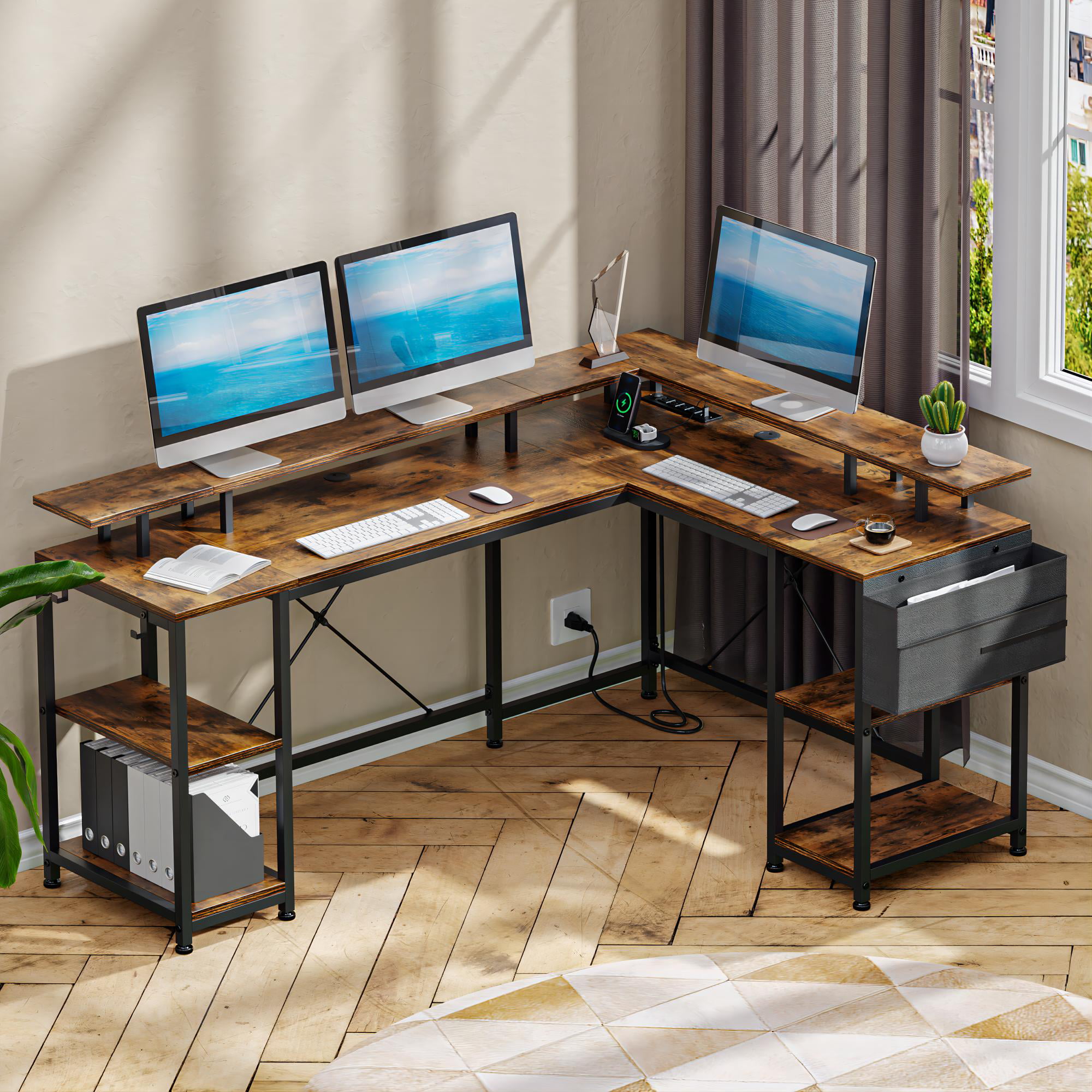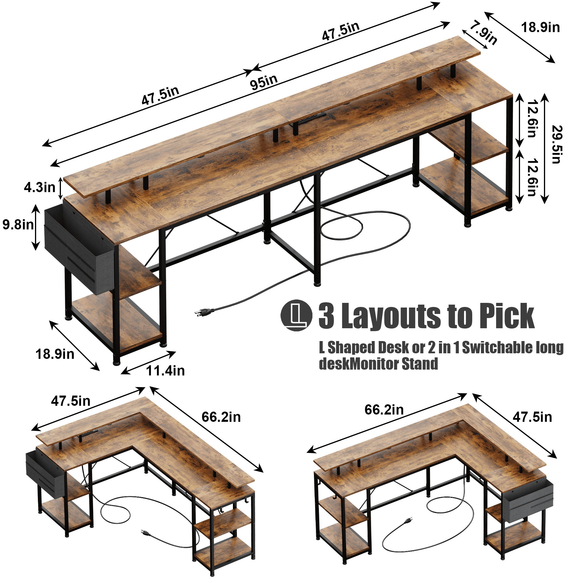 Lulive L Shaped Desk with LED Light and Power Outlet. 95″ Reversible Corner Computer Desk with Monitor Stand and Storage Shelf. Modern L- Shaped Gaming Desk. Brown