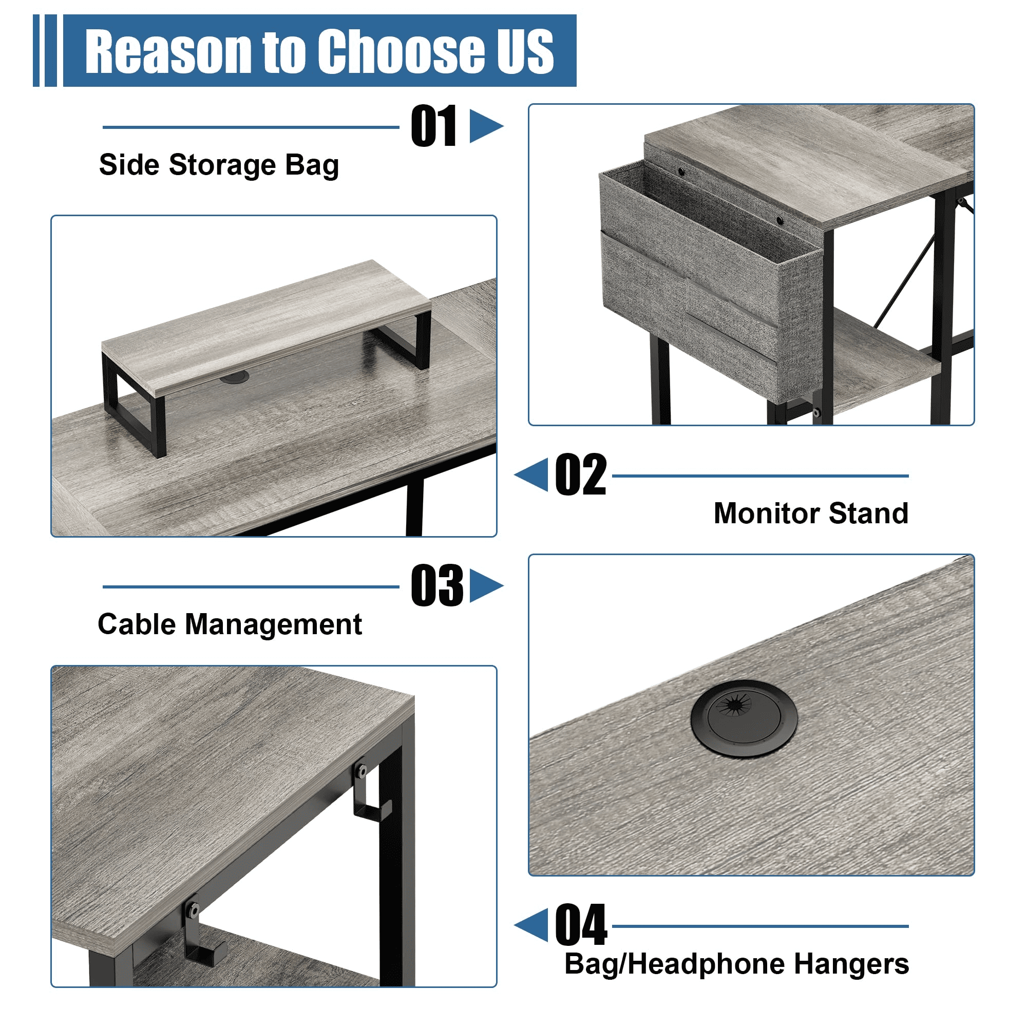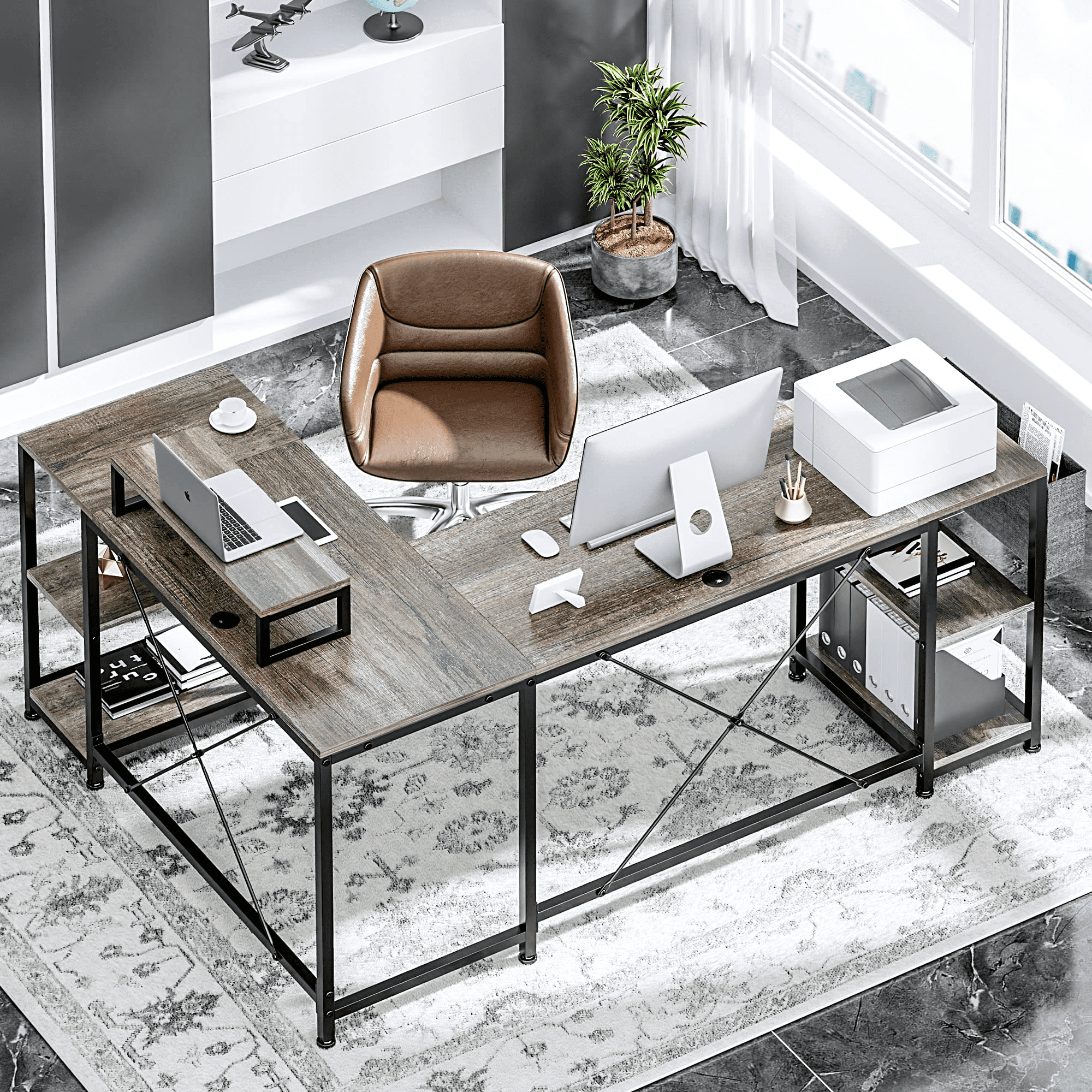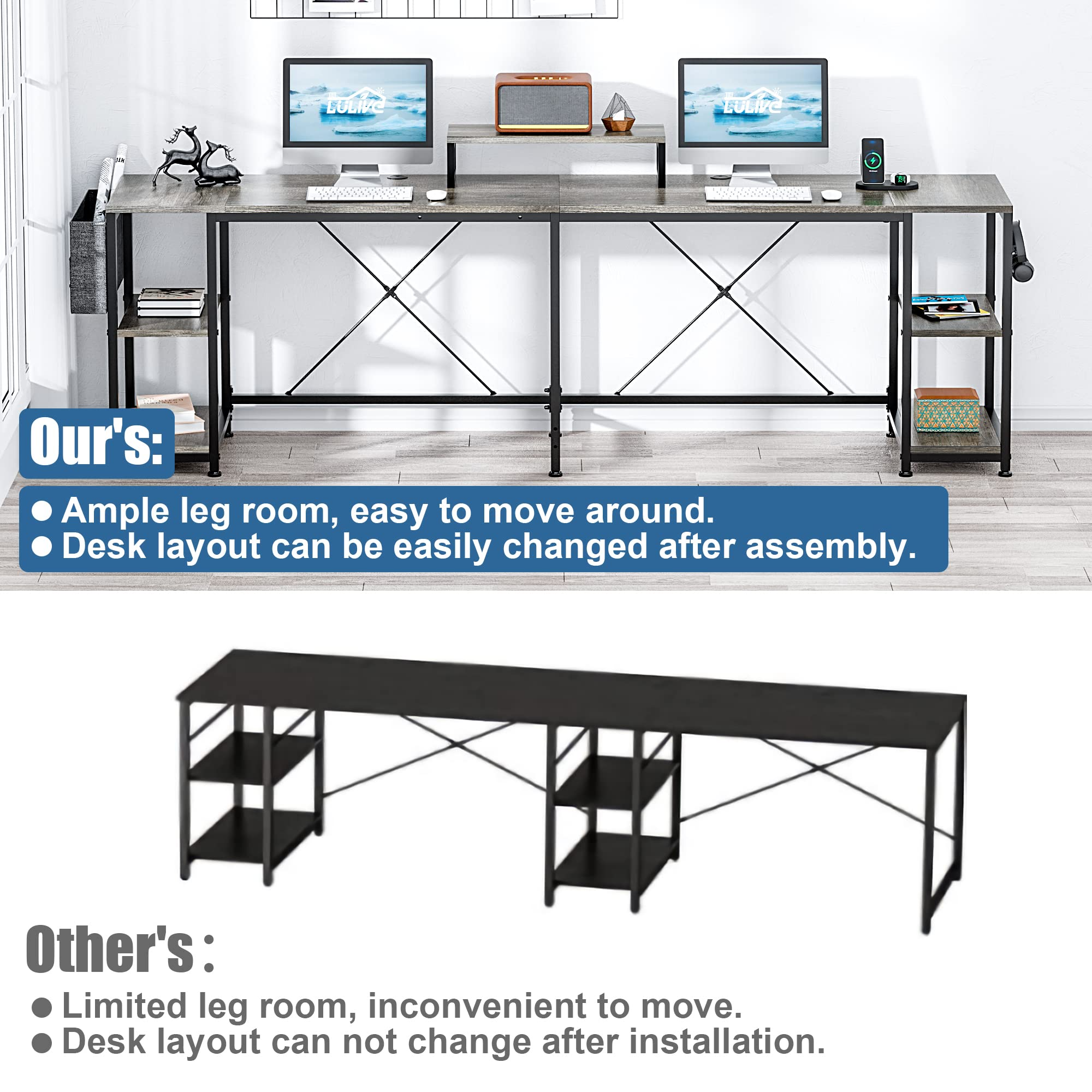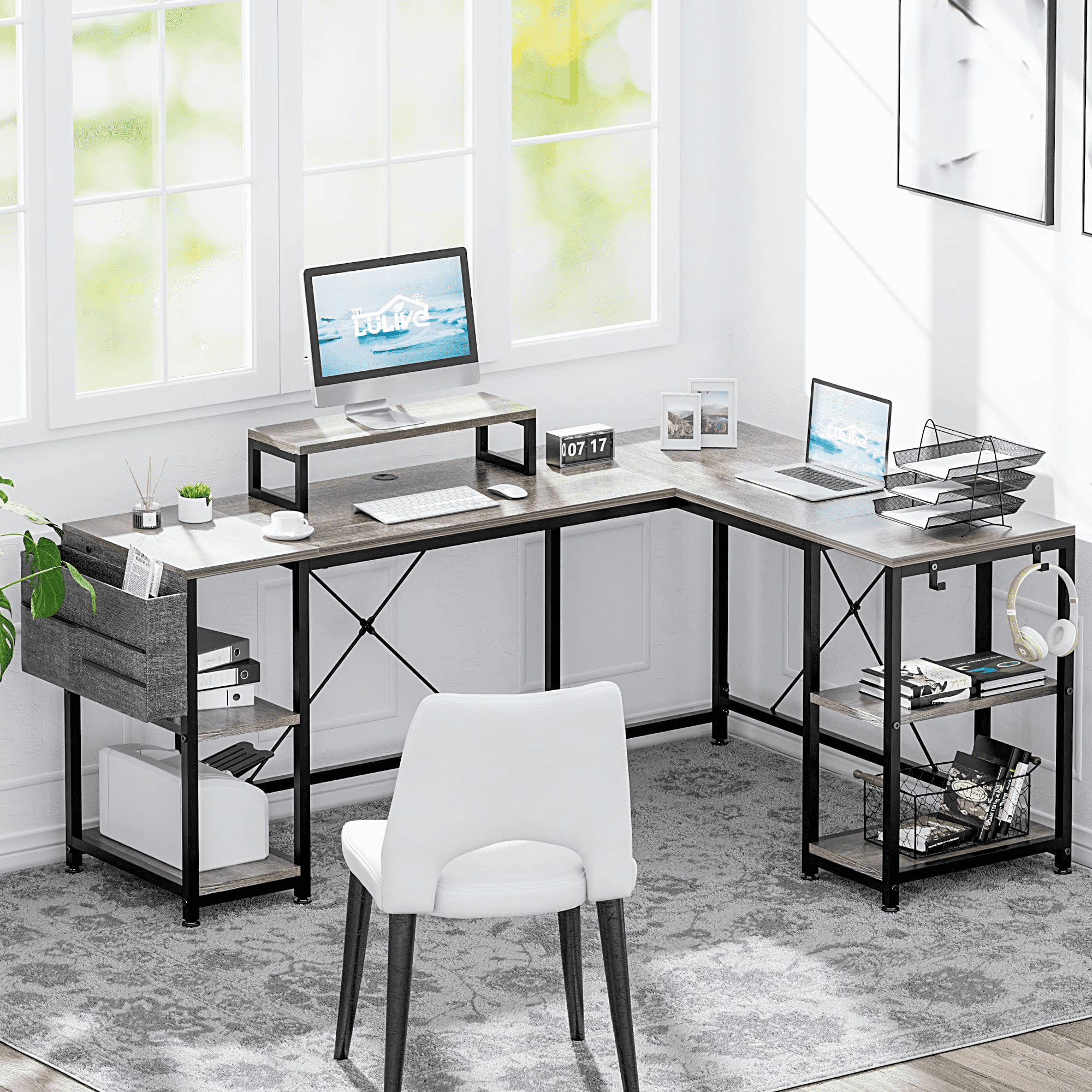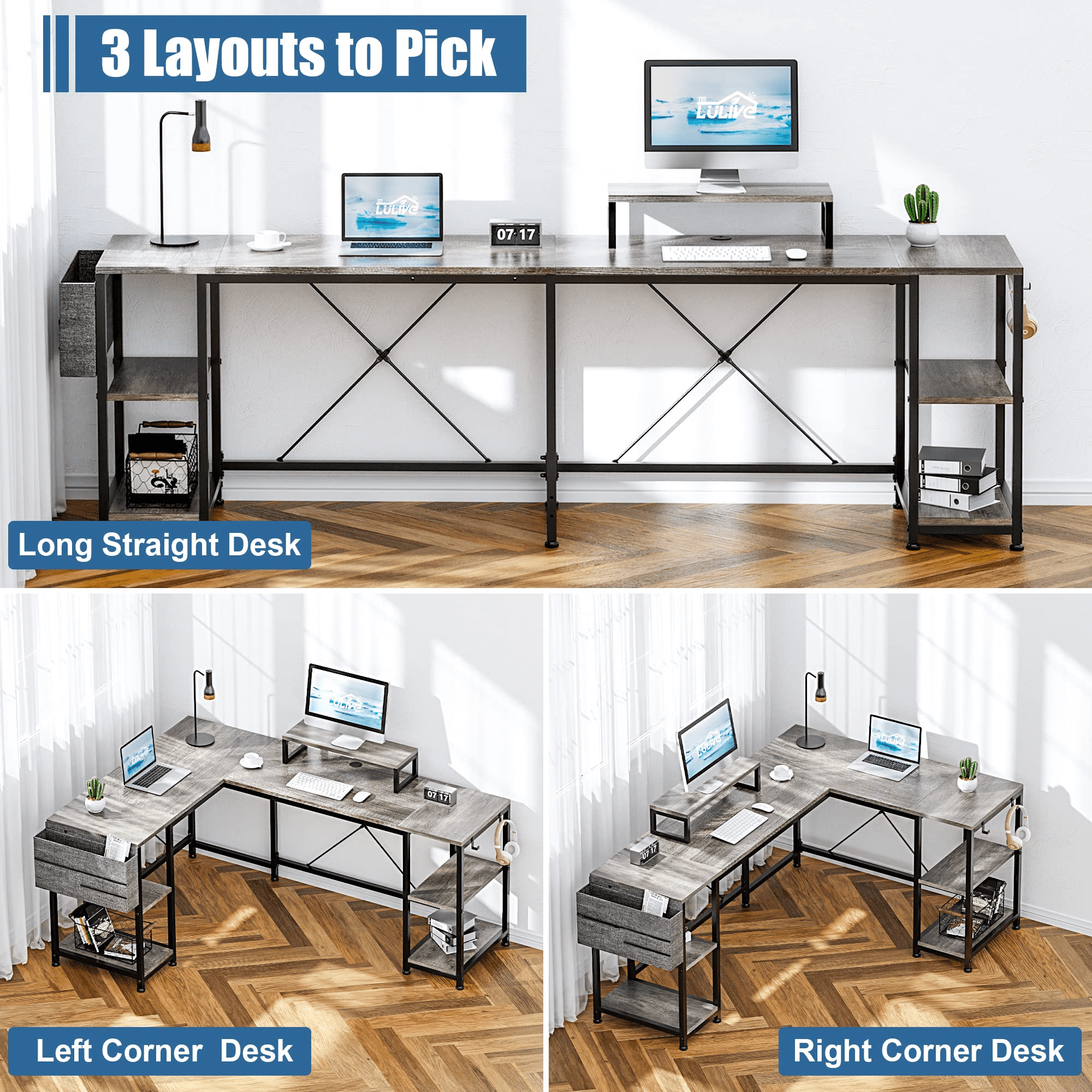 Lulive 95″ Reversible Computer Desk. L Shaped Desk Office Desk with 4 Shelves/ Monitor Stand/ Storage Bag/ Hooks for Home Office. Grey
