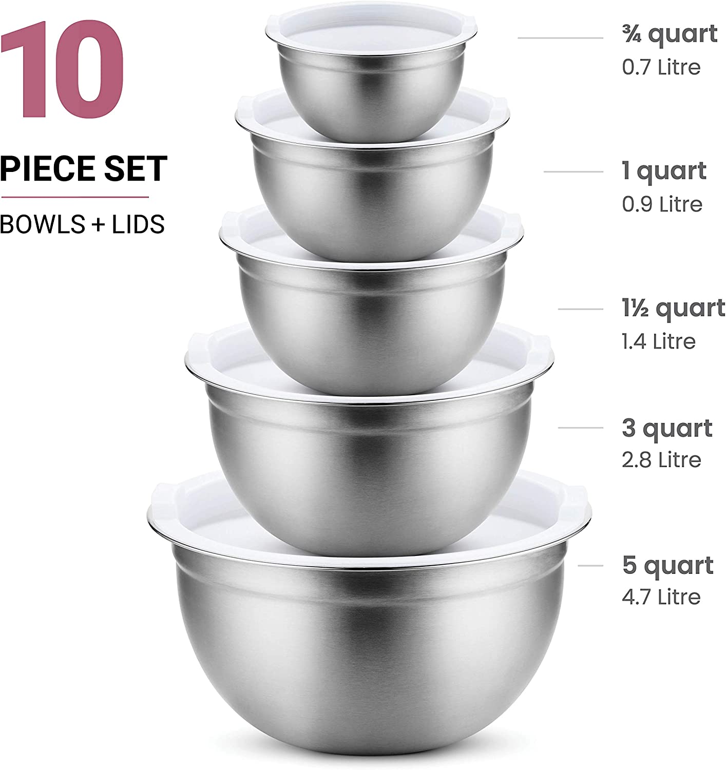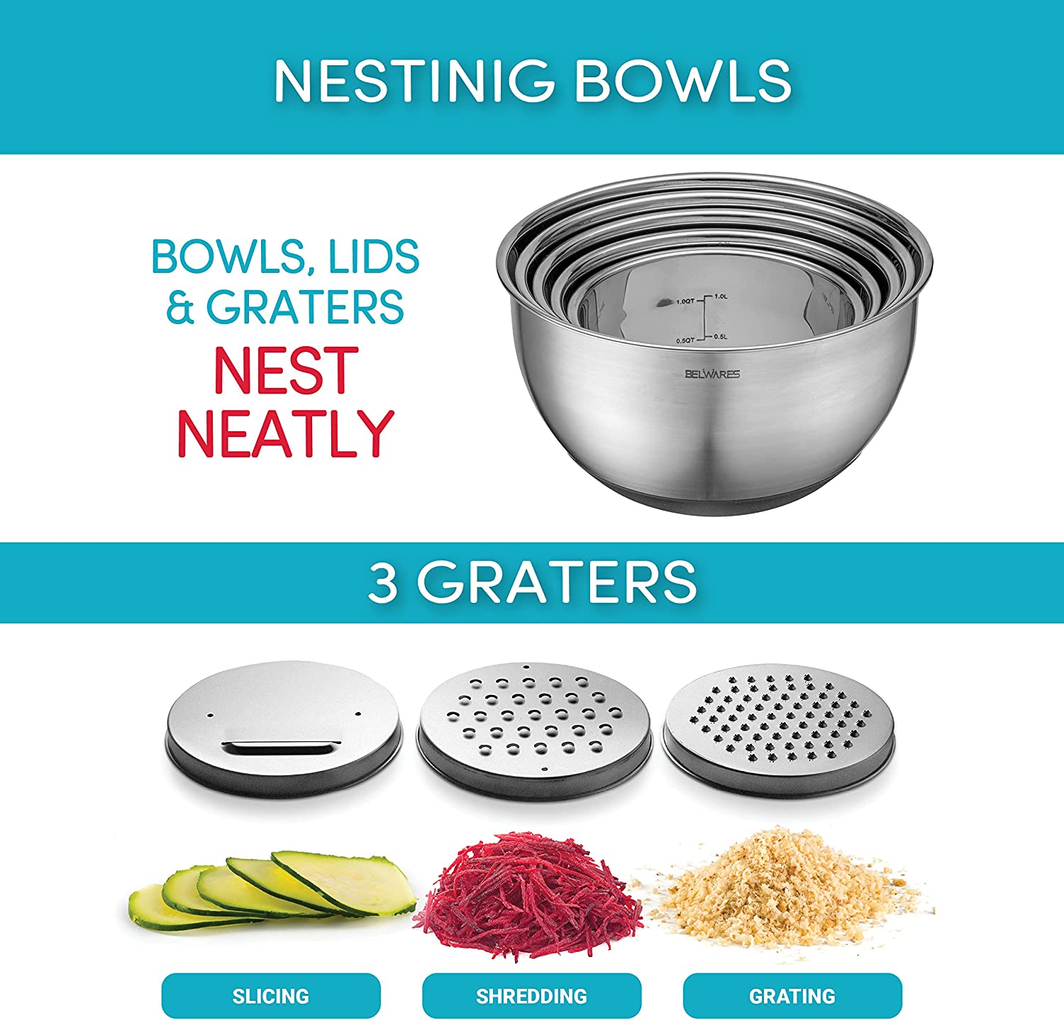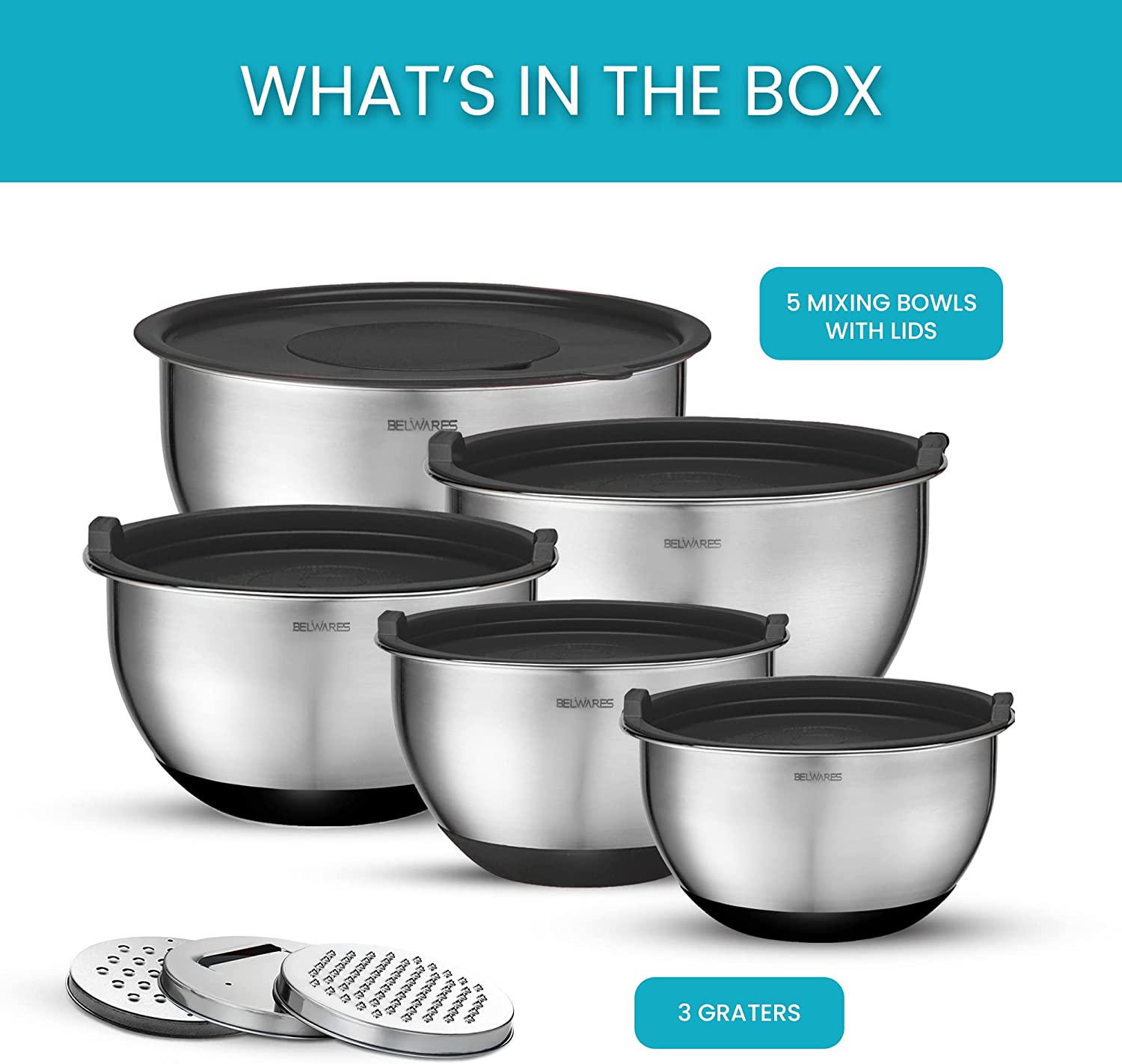 Belwares Mixing Bowls with Lids Set – Stainless Steel Mixing Bowl Set Including Airtight Lids and Graters – Stainless Steel Bowls that Nest – 5 Non-Slip Metal Bowls for Kitchen with Pour Spouts