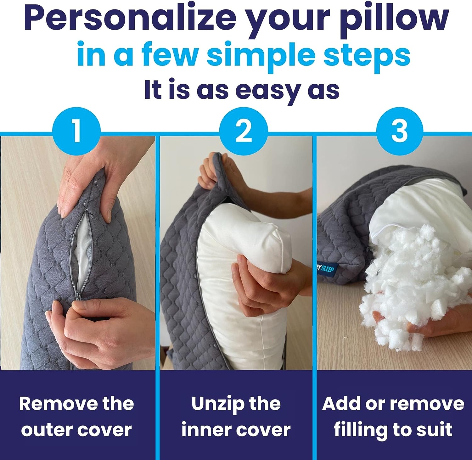 Sidney Sleep Bed Pillow for Side and Back Sleepers - Adjustable Filling - Memory Foam Pillow for Neck and Shoulder Pain - Customizable Loft - Queen Size - Additional Foam Bag Included (Queen. Grey)