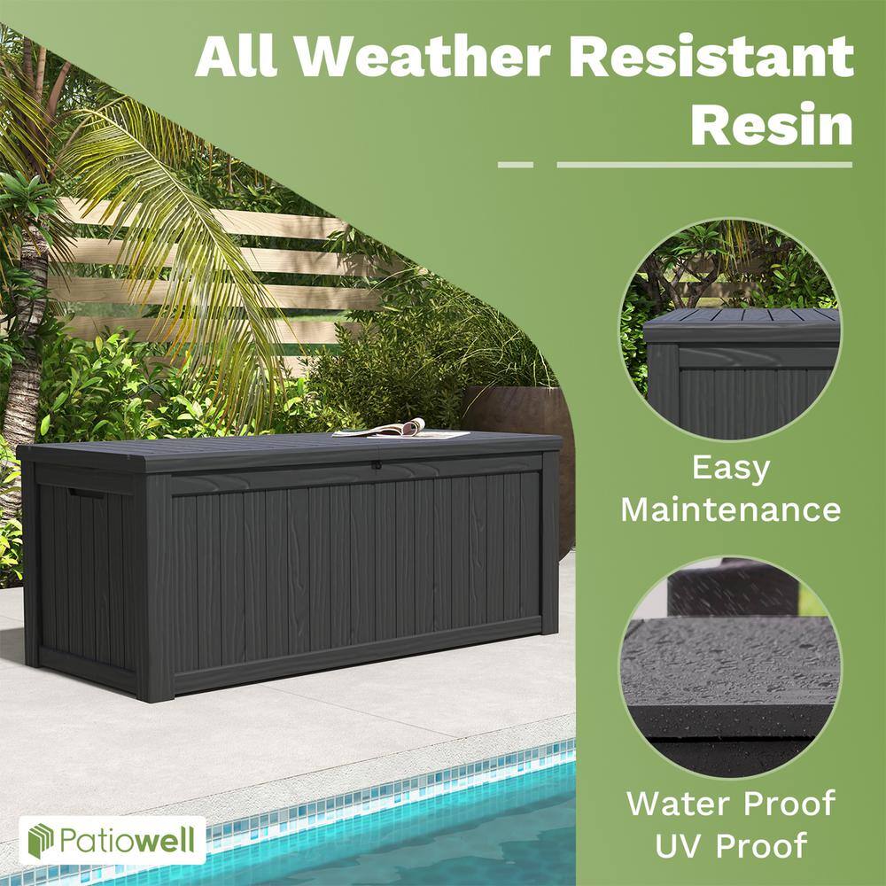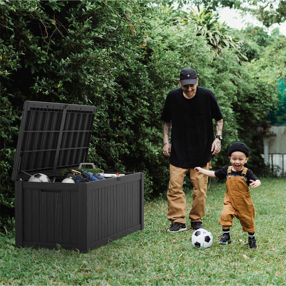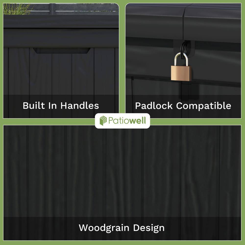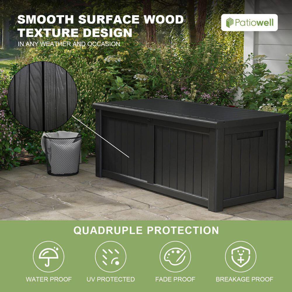 Patiowell PASB150-0 150 Gal. Outdoor Storage Resin Wood-Grain Deck Box in Black. 2 Large Storage Spaces for Patio Furniture