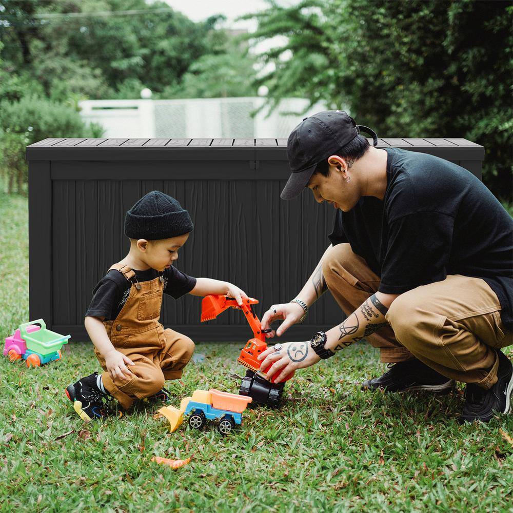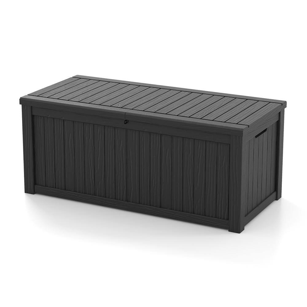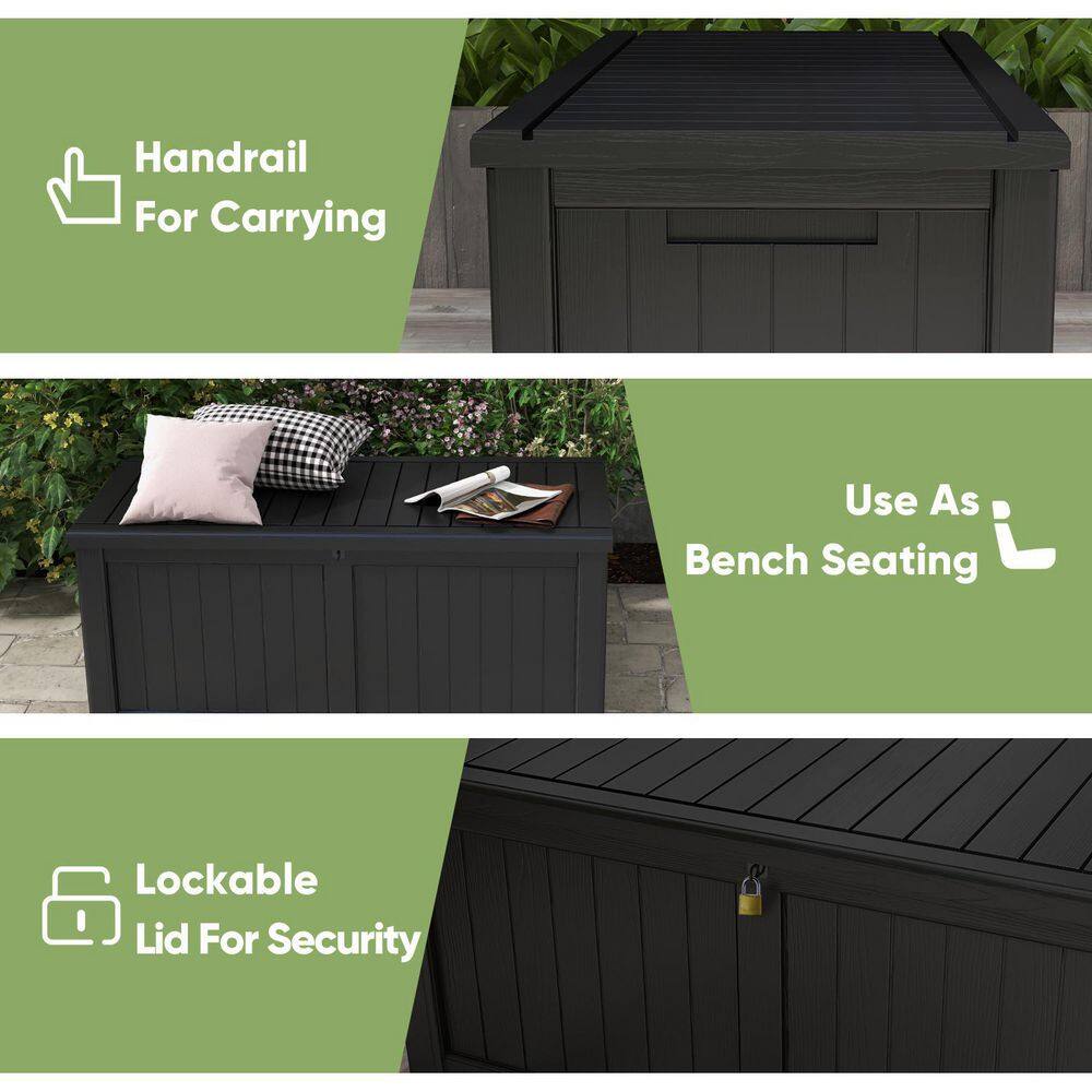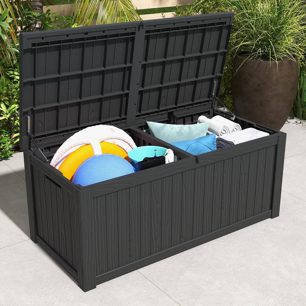 Patiowell PASB150-0 150 Gal. Outdoor Storage Resin Wood-Grain Deck Box in Black. 2 Large Storage Spaces for Patio Furniture