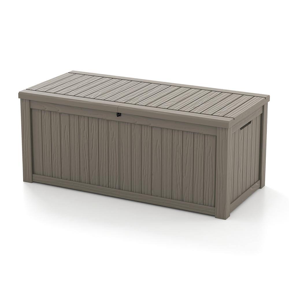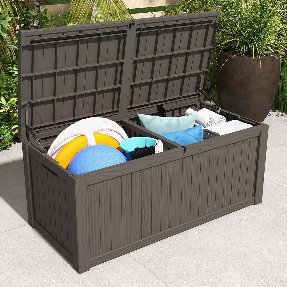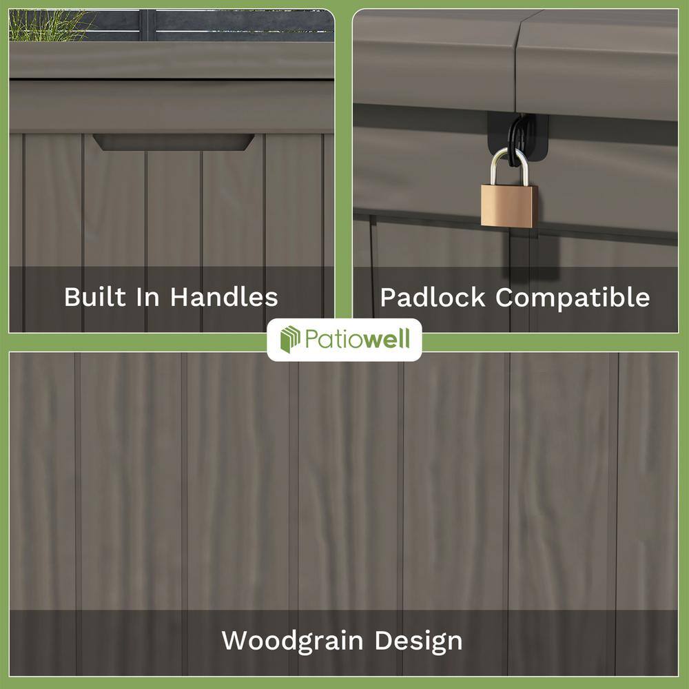 Patiowell PASB150-WGY 150 Gal. Outdoor Storage Resin Wood-Grain Deck Box in Brown. 2 Large Storage Spaces for Patio Furniture