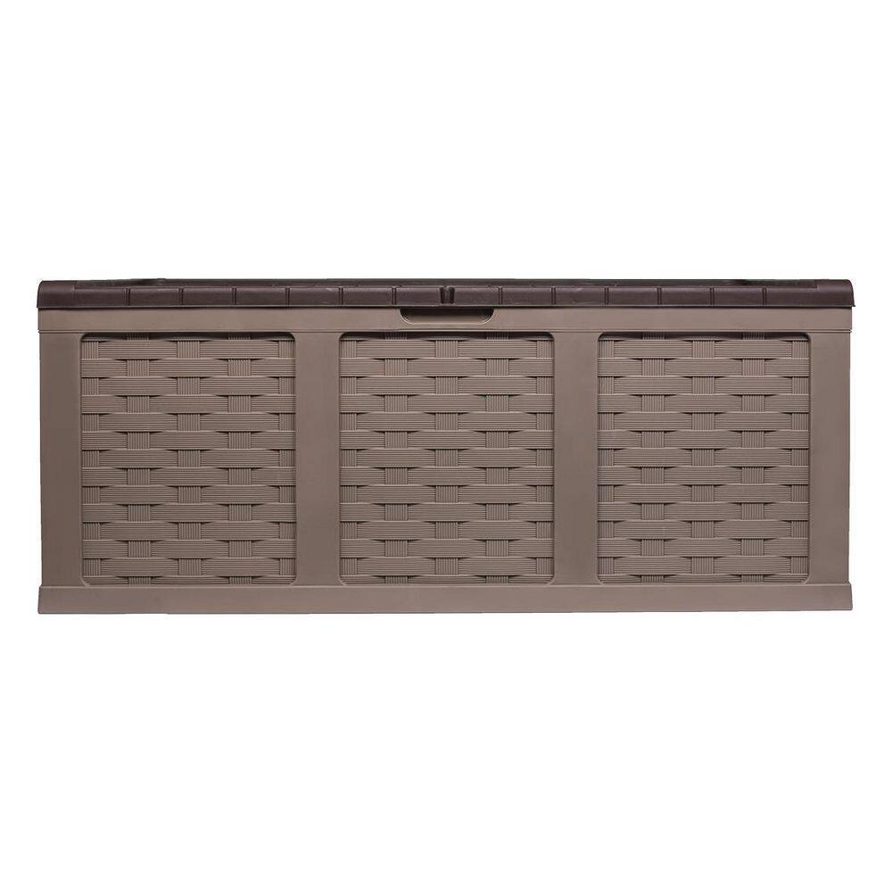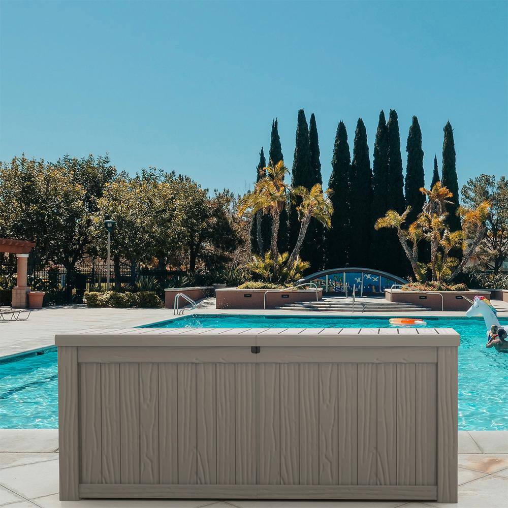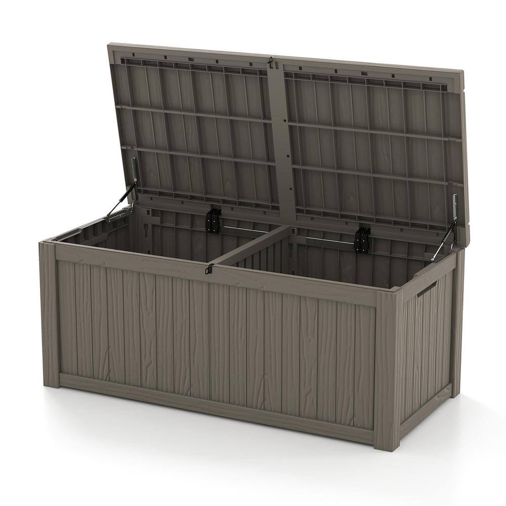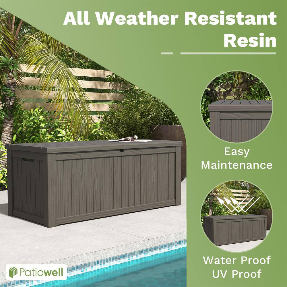 Patiowell PASB150-WGY 150 Gal. Outdoor Storage Resin Wood-Grain Deck Box in Brown. 2 Large Storage Spaces for Patio Furniture