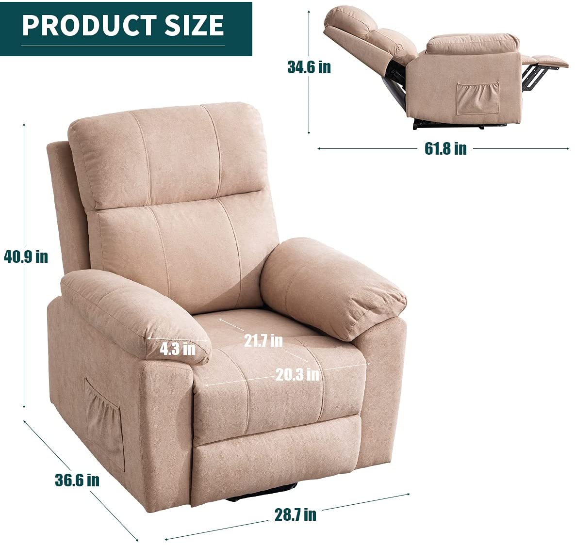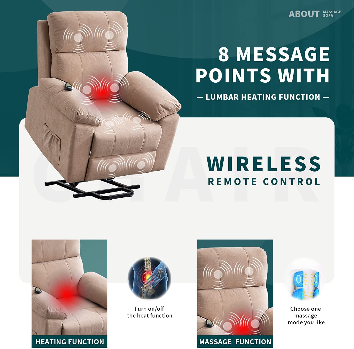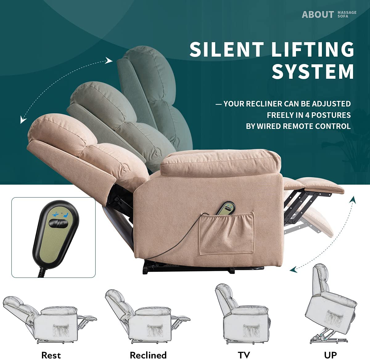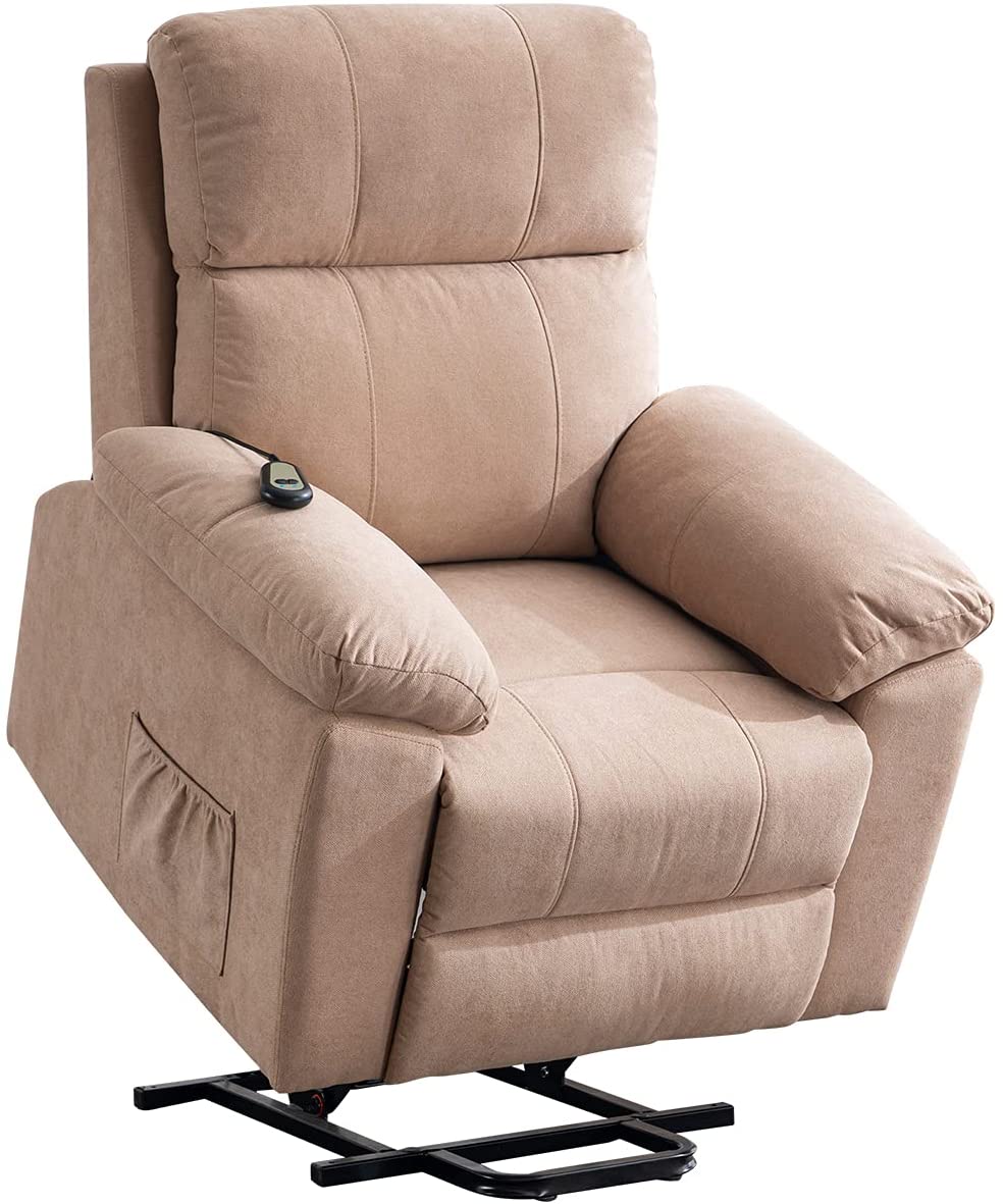 Erommy Power Lift Recliner Chair with Massage and Heat. Fabric Sofa Chairs with Wireless Remote Control and Side Pocket. Linen Camel