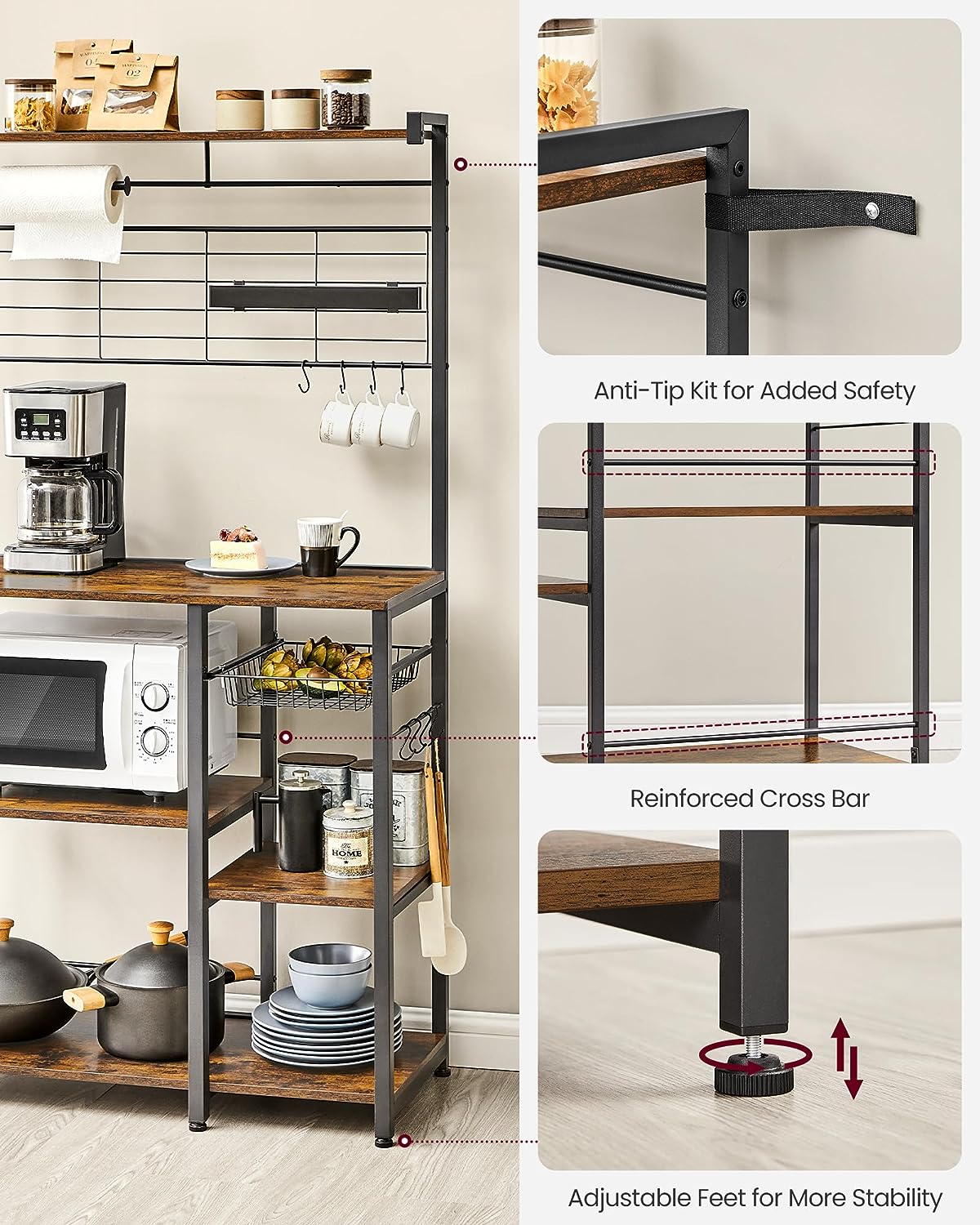 VASAGLE Bakers Rack with Magnetic Knife Holder. Paper Holder. Wire Basket. 8 Hooks. Organizers and Storage. Rustic Brown and Black UKKS026B01