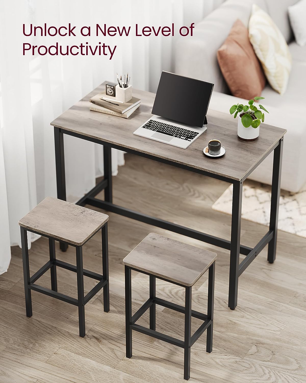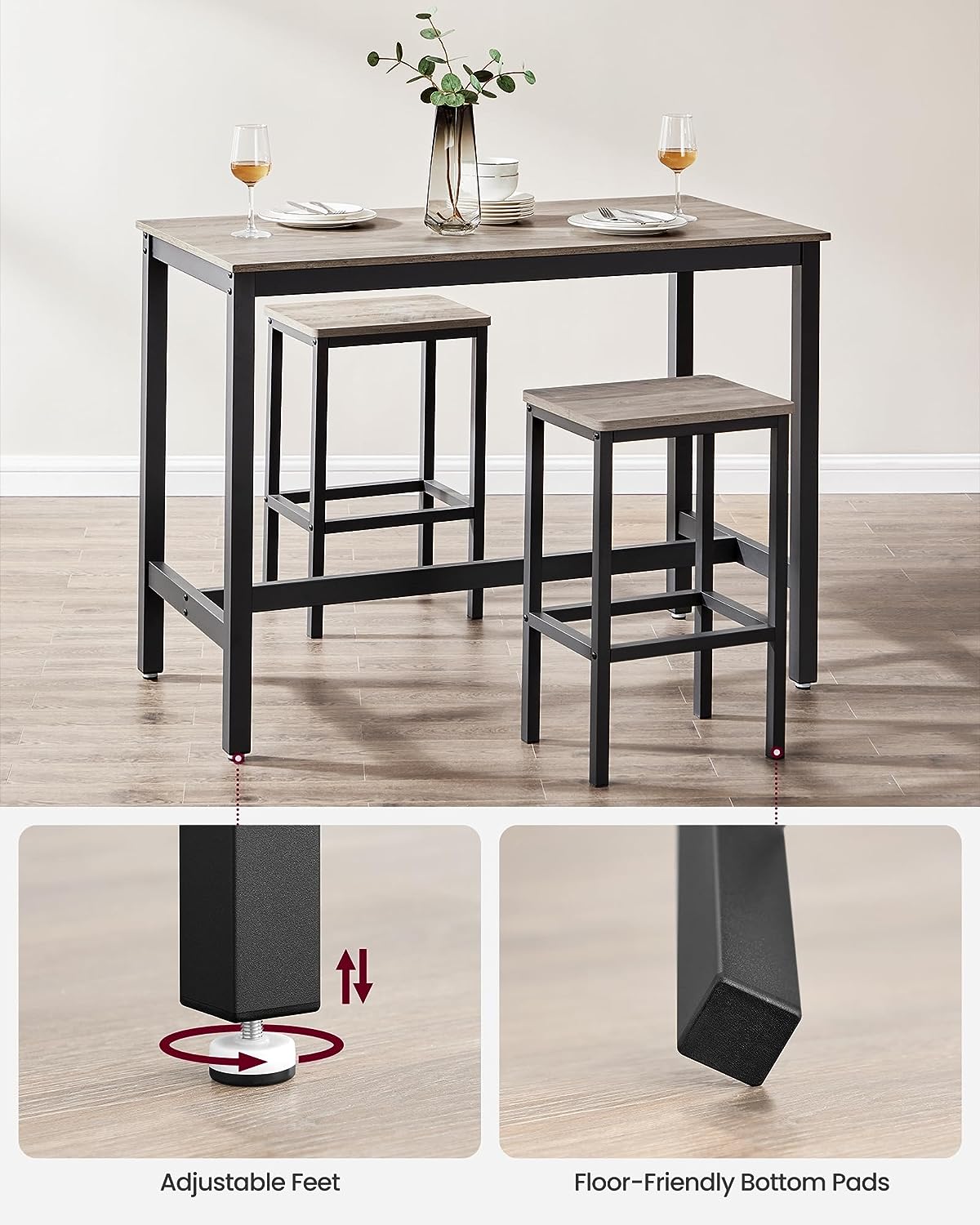 VASAGLE Bar Table Set. Bar Table with 2 Bar Stools. Dining table set. Kitchen Counter with Bar Chairs. Industrial for Kitchen. Living Room. Party Room. Greige and Black ULBT015B02