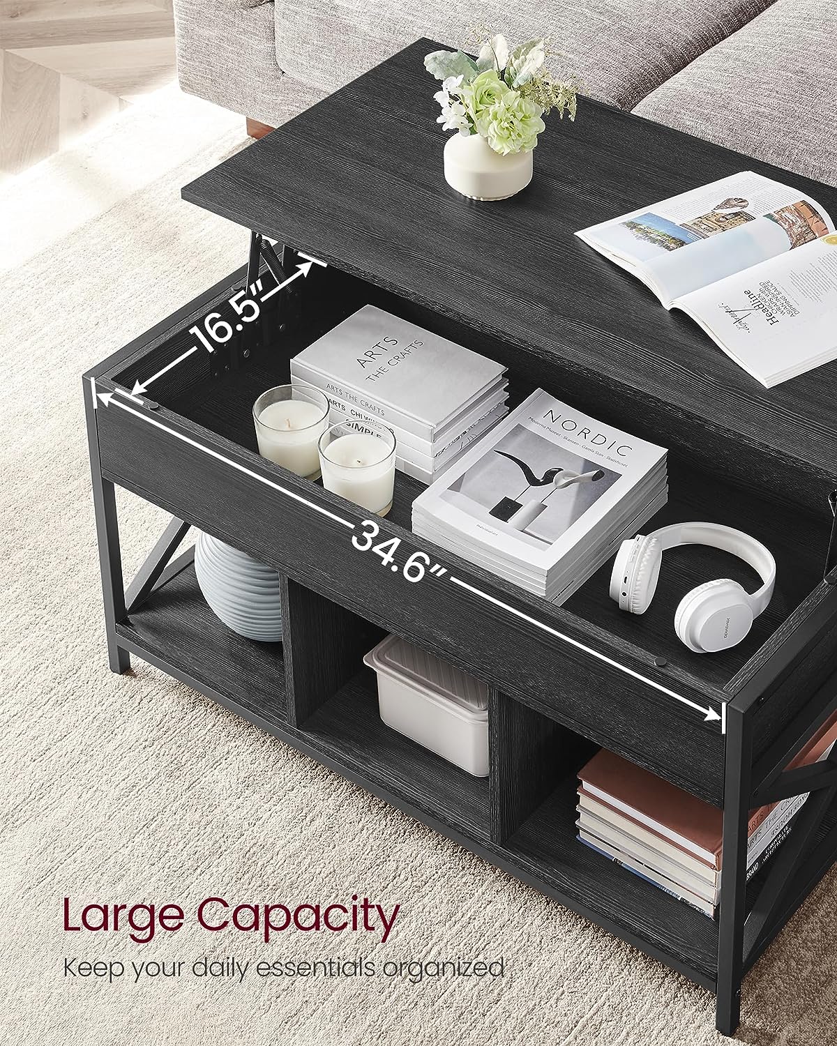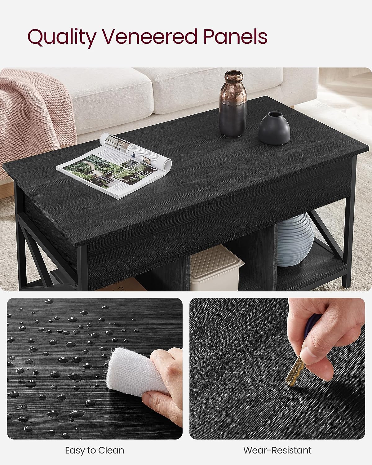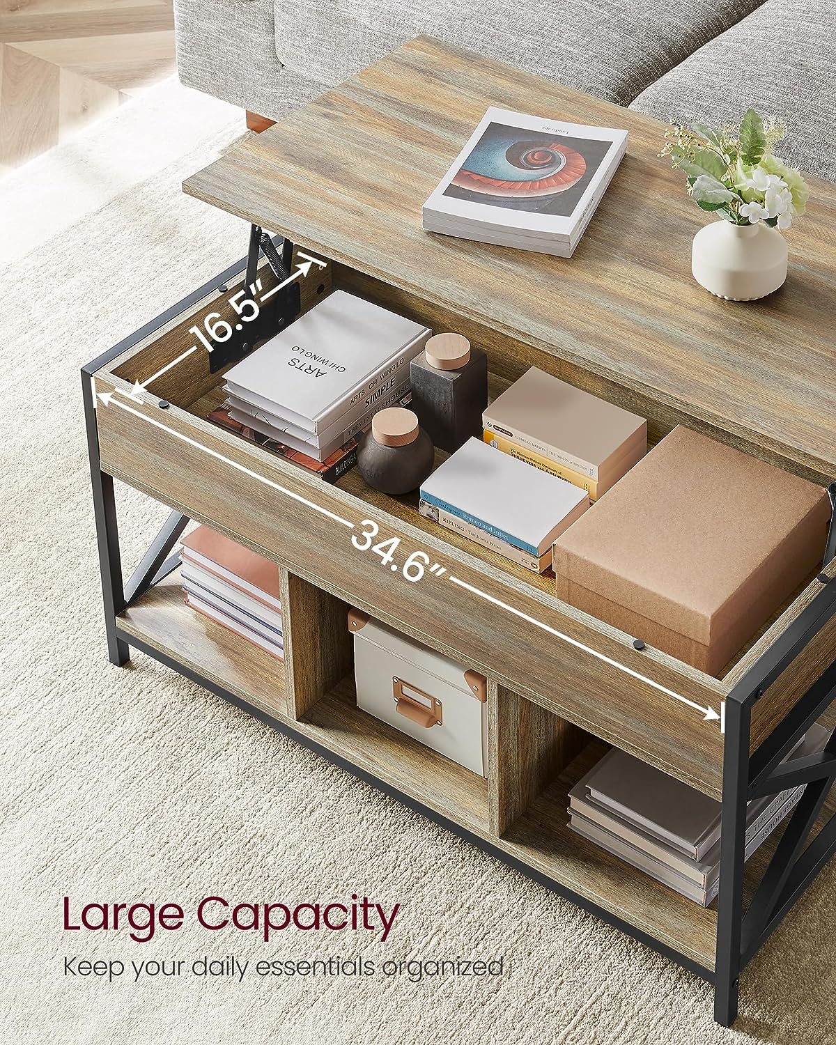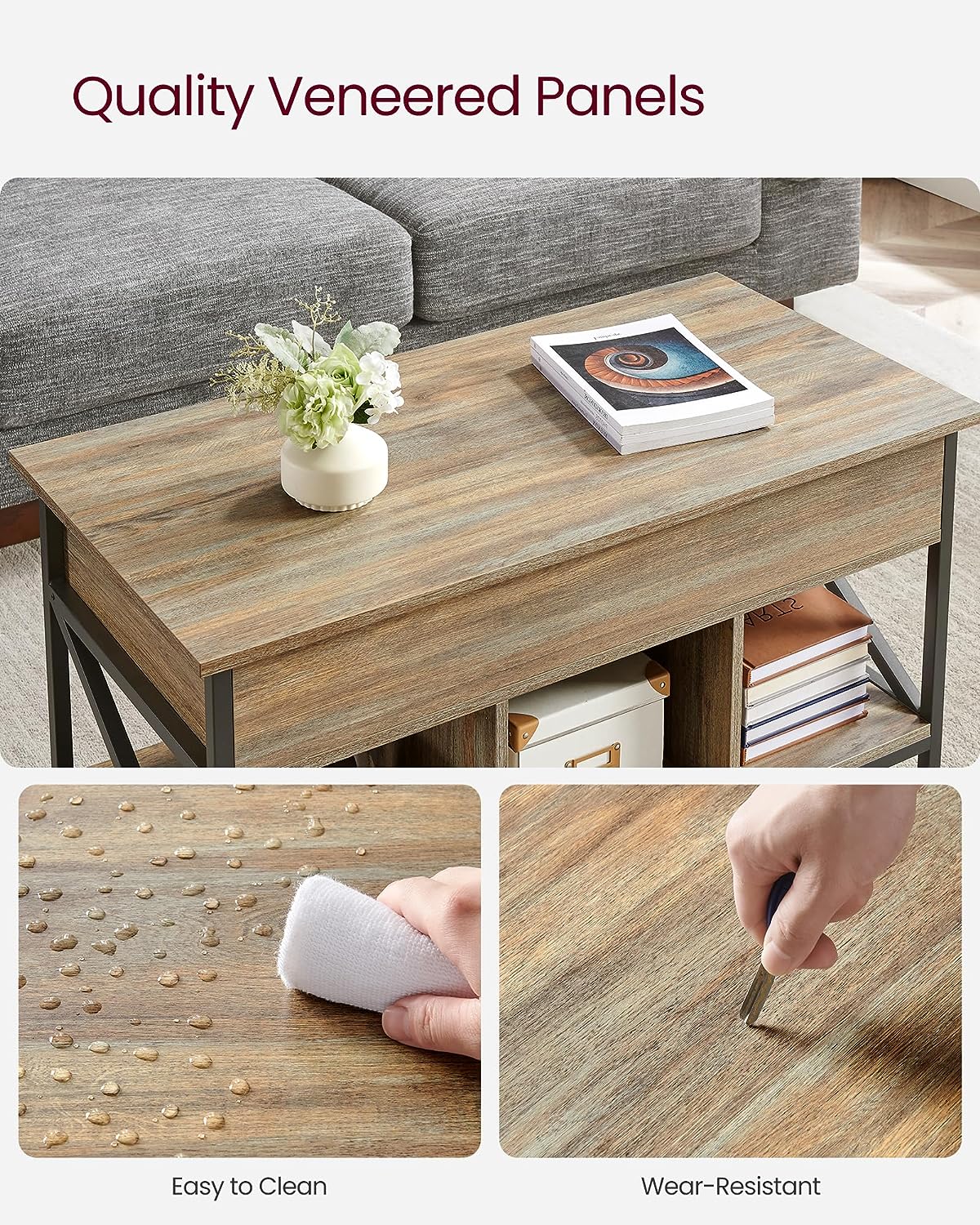 VASAGLE Lift Top Coffee Table for Living Room. Industrial Coffee Table with Hidden Compartments and Storage Shelf. Steel Frame. 19.7 x 39.4 x (19.3-24.4) Inches. Oak with Blue Grains ULCT202B60