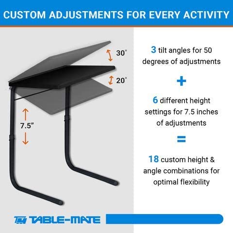 Table-Mate Ultra Folding TV Tray Table and Cup Holder. Adjustable to 6 Heights and 3 Angles with Device Holder (Black)
