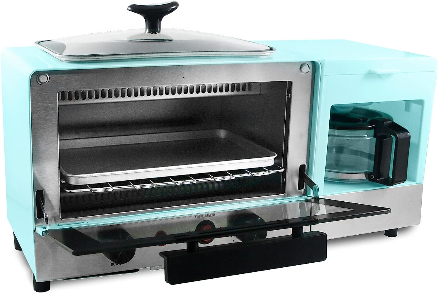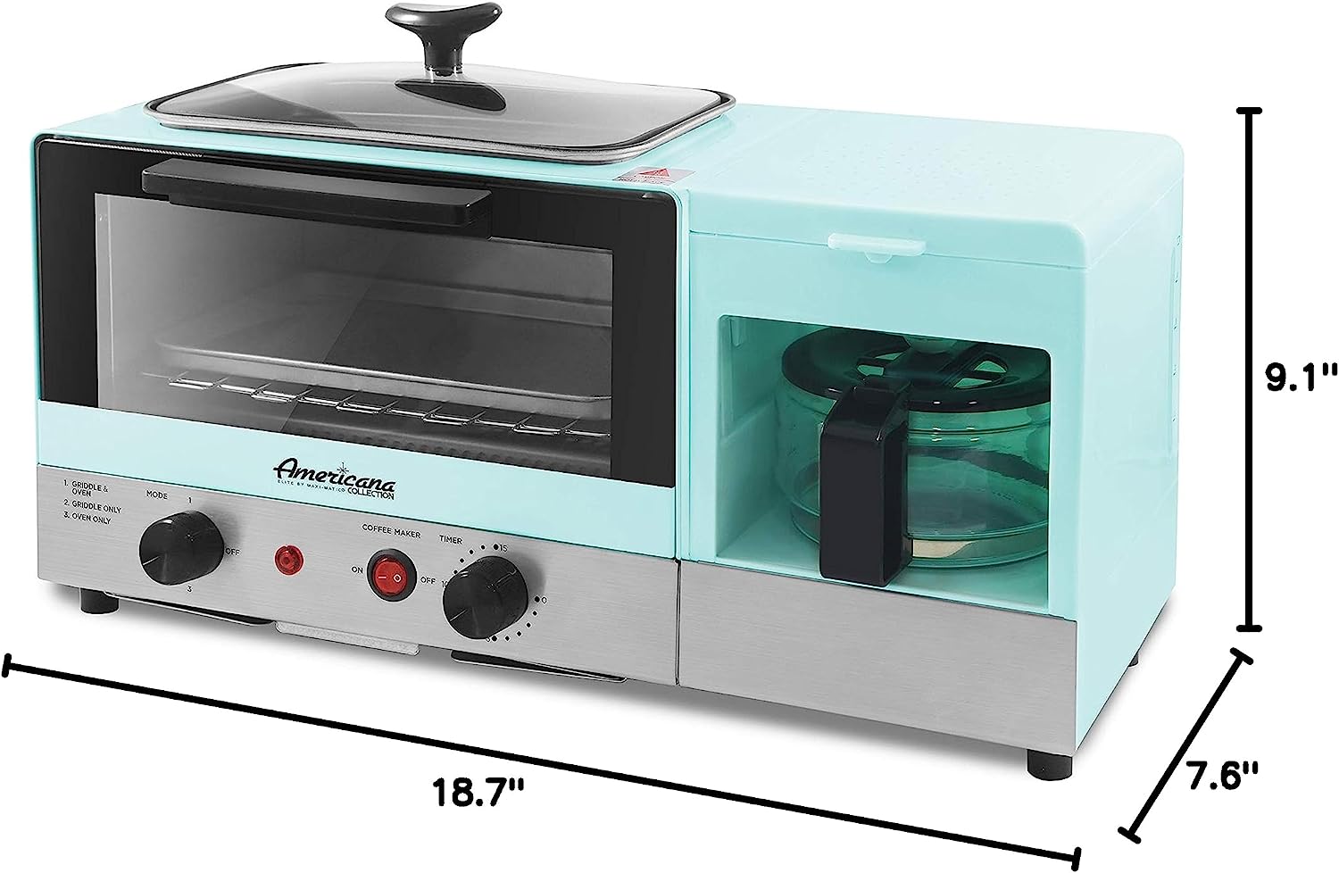Elite Gourmet Americana 2 Slice. 9.5″ Griddle with Glass Lid 3-in-1 Breakfast Center Station. 4-Cup Coffeemaker. Toaster Oven with 15-Min Timer. Heat Selector Mode. Blue. (EBK8810BL)