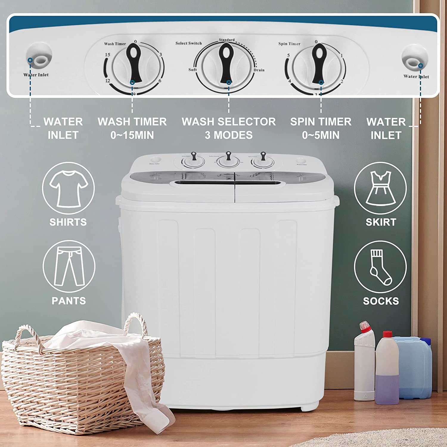 SUPER DEAL Compact Mini Twin Tub Washing Machine. Portable Laundry Washer w/Wash and Spin Cycle Combo. Built-in Gravity Drain. 13lbs Capacity for Camping. Apartments. Dorms. College Rooms. RV's and more