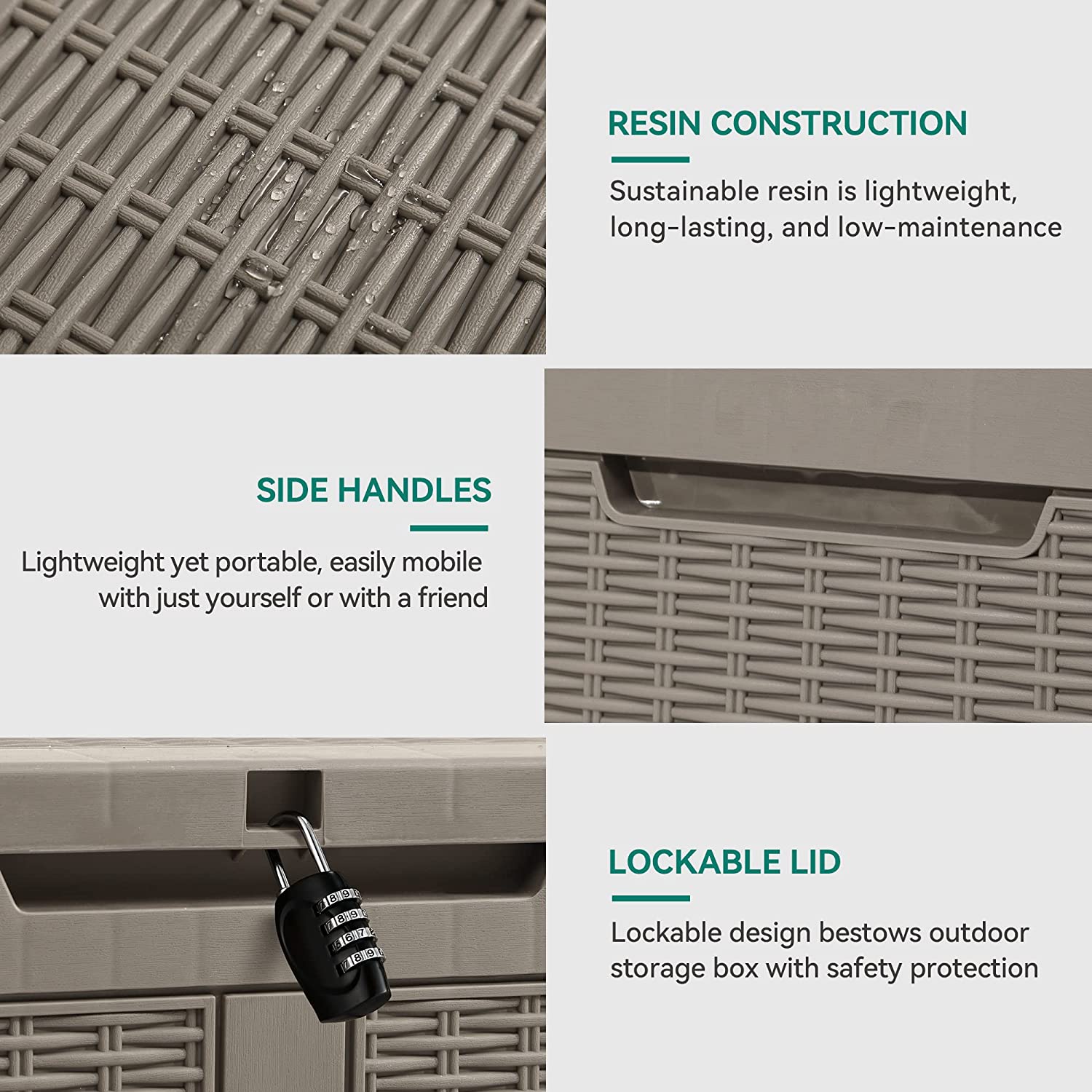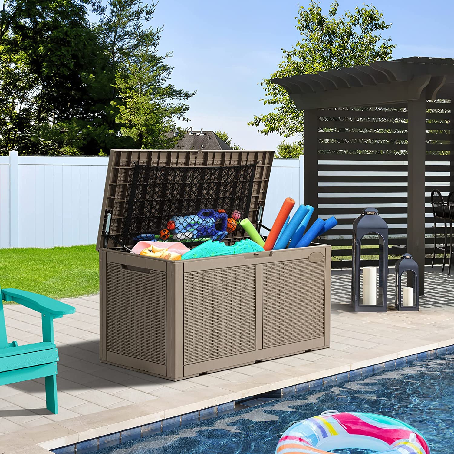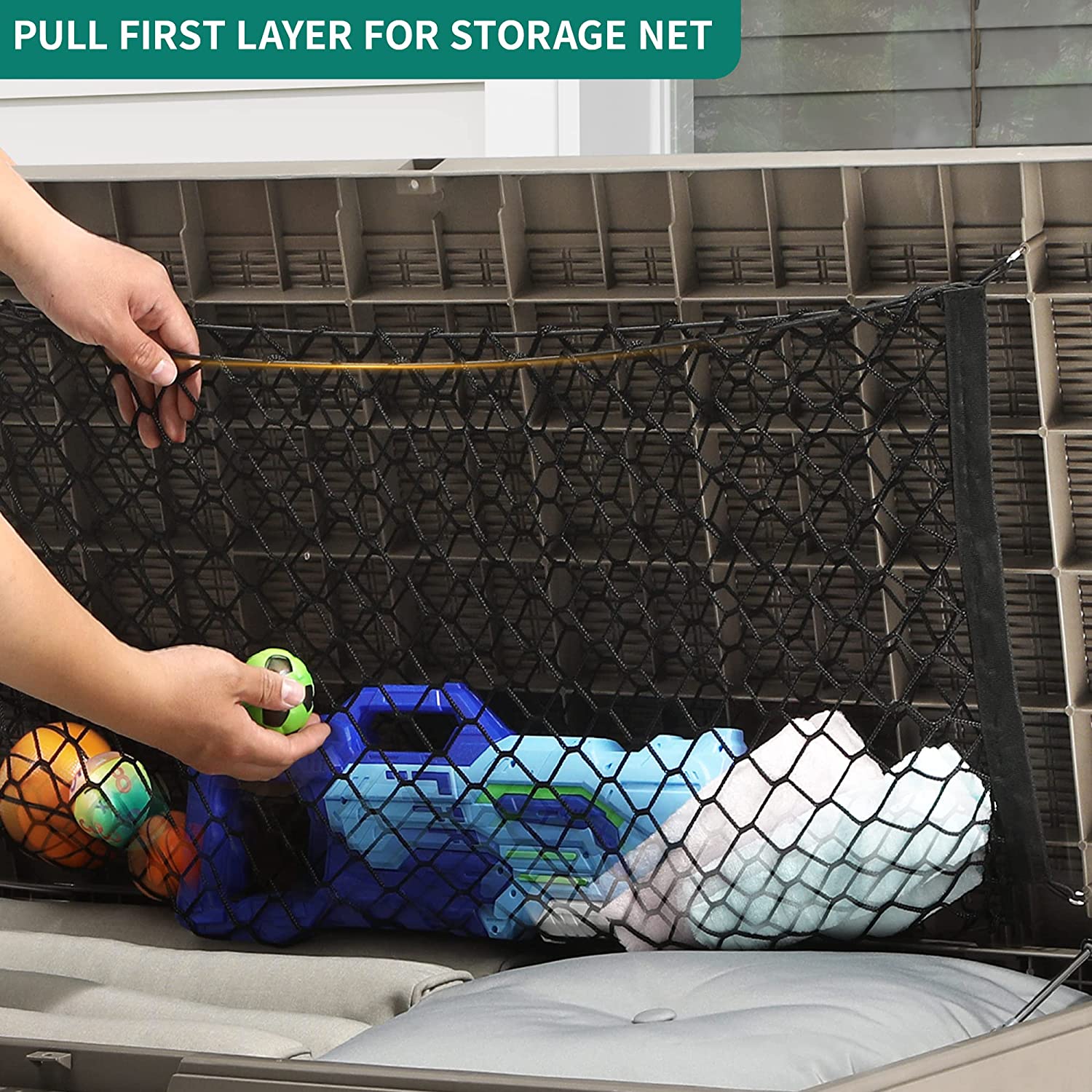 YITAHOME 100 Gallon Large Deck Box w/Storage Net. Resin Outdoor Storage Boxes. Waterproof Patio Cushion Storage Bench for Patio Furniture. Pool Supplies. Garden Tools- Rattan.Lockable (Light Brown)