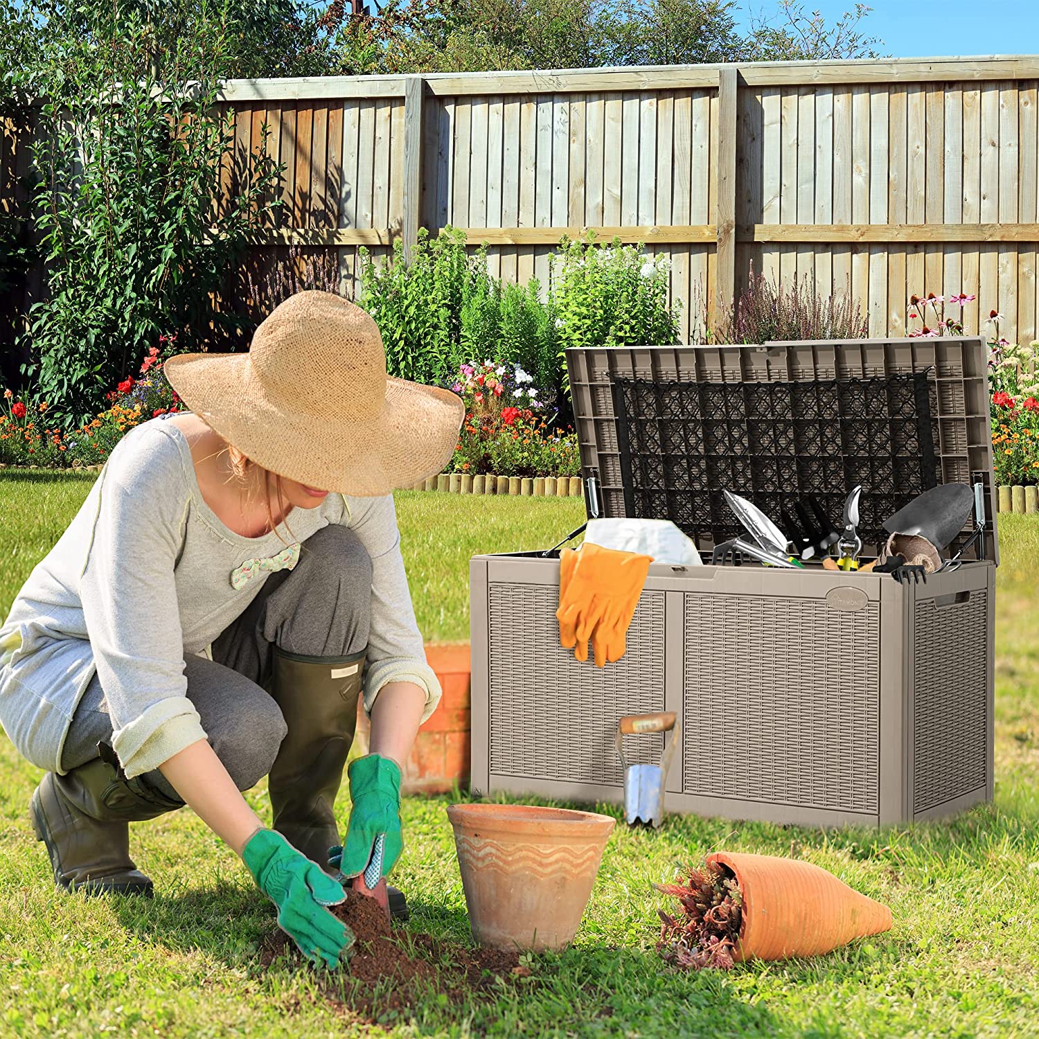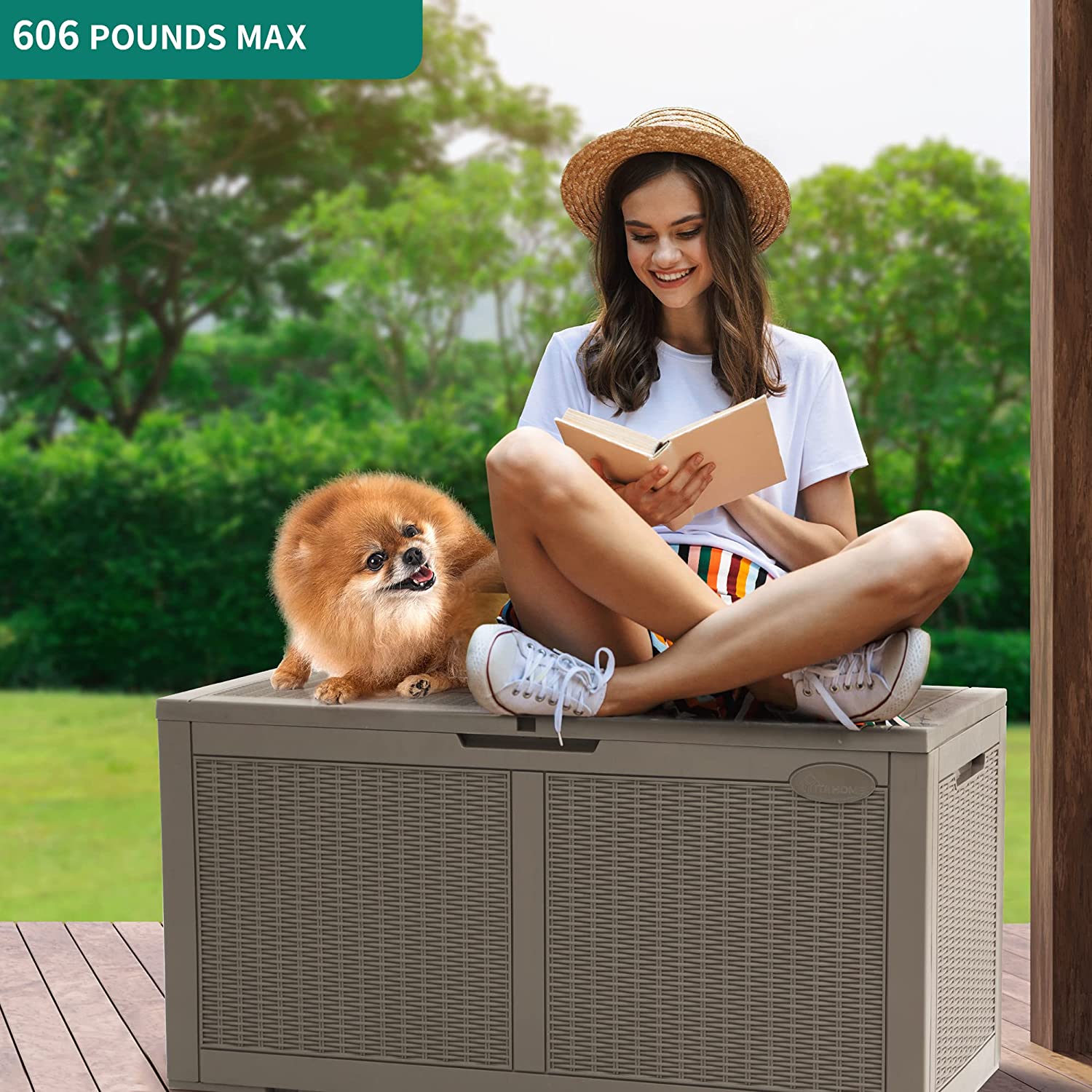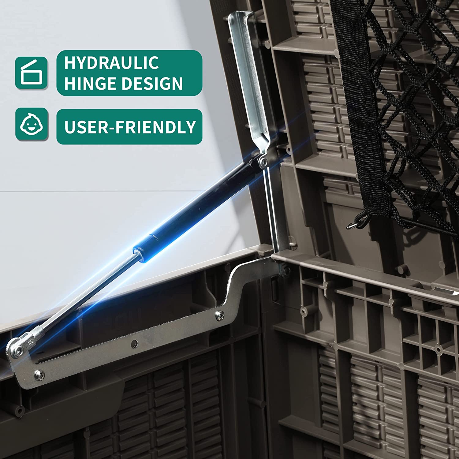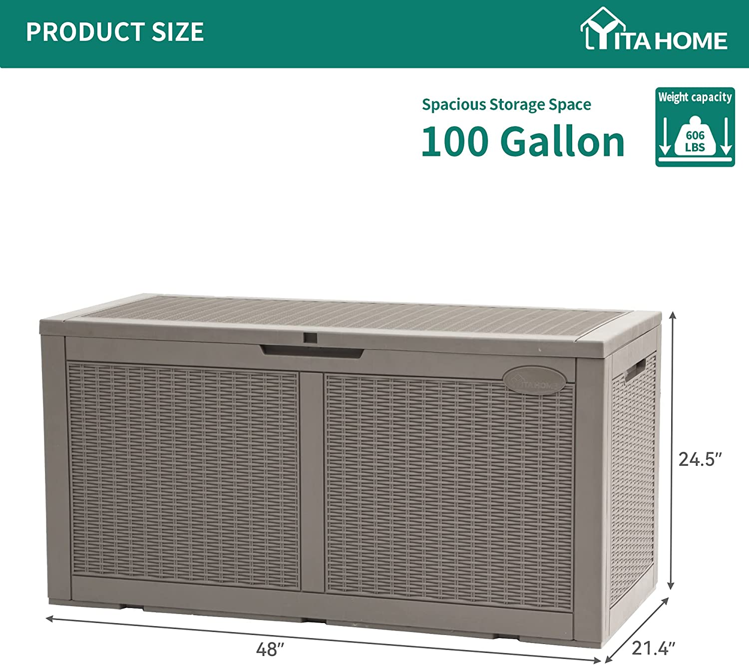 YITAHOME 100 Gallon Large Deck Box w/Storage Net. Resin Outdoor Storage Boxes. Waterproof Patio Cushion Storage Bench for Patio Furniture. Pool Supplies. Garden Tools- Rattan.Lockable (Light Brown)