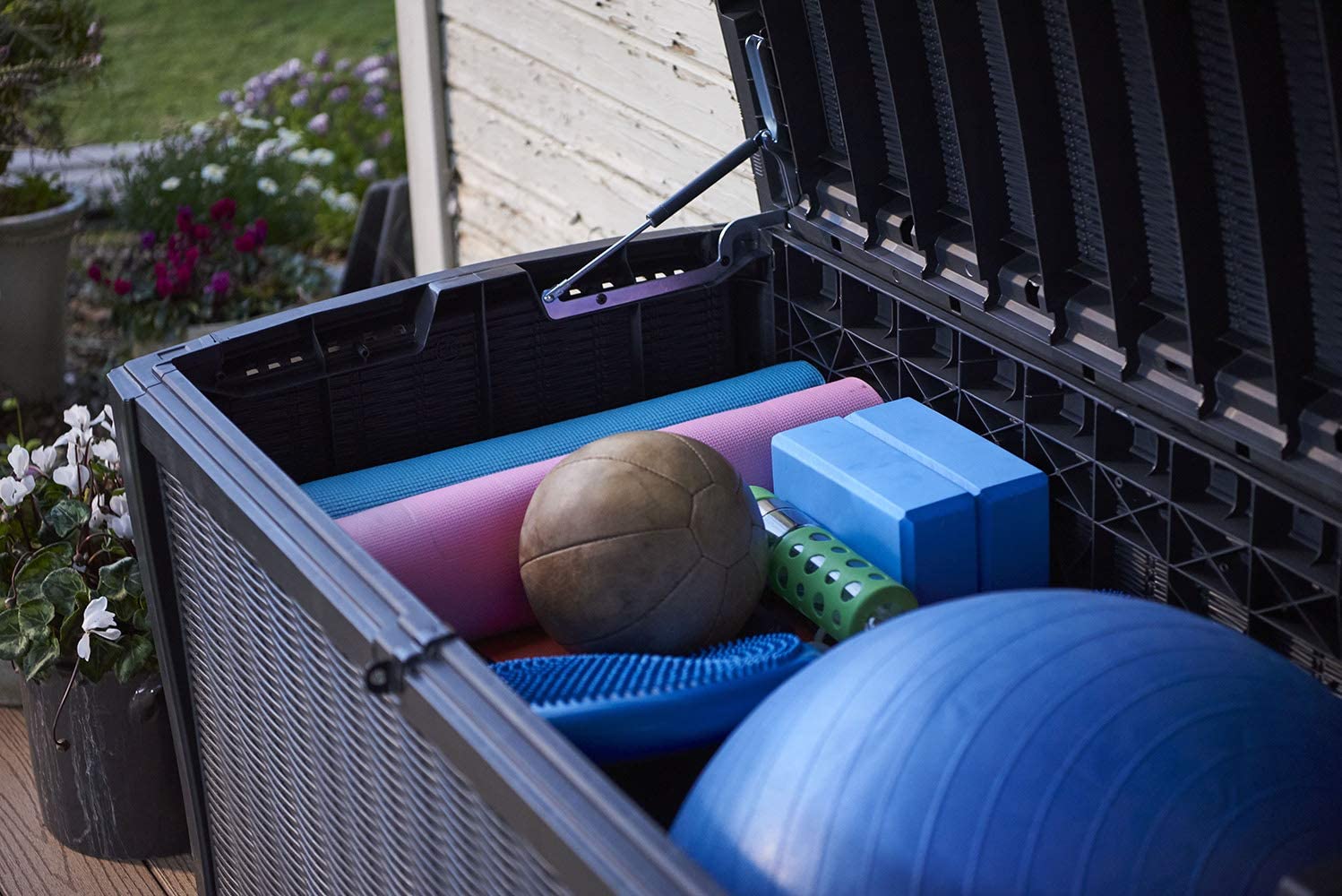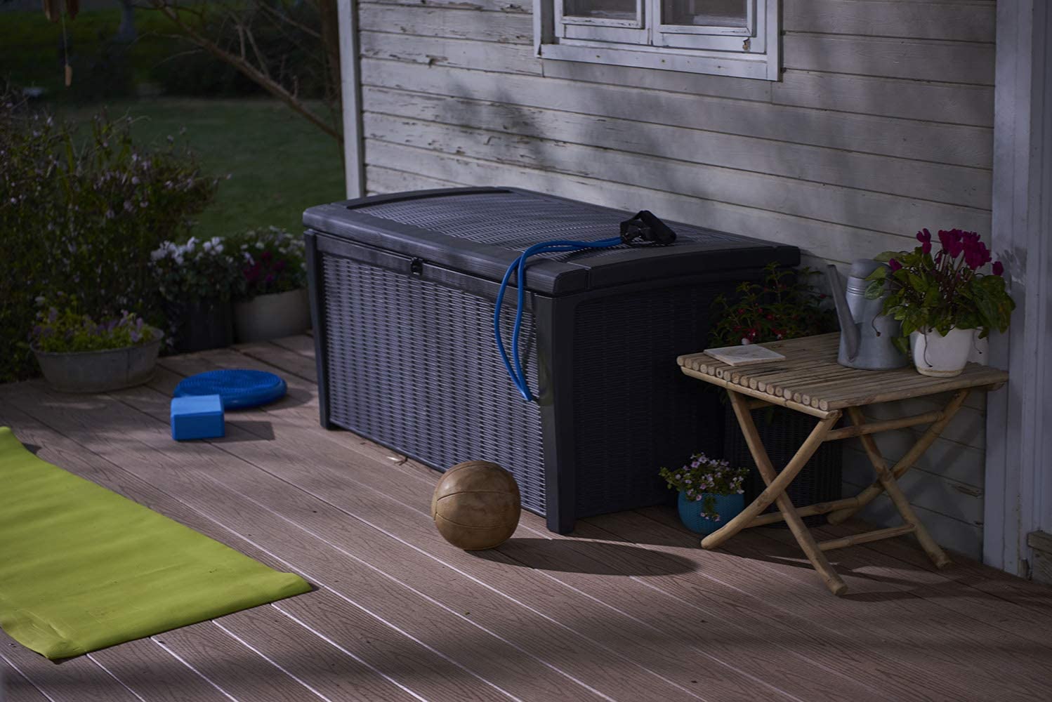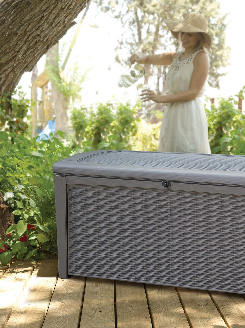 Keter Borneo 110 Gallon Resin Deck Box - Organization and Storage for Patio Furniture. Outdoor Cushions. Throw Pillows. Garden Tools and Pool Toys. Grey