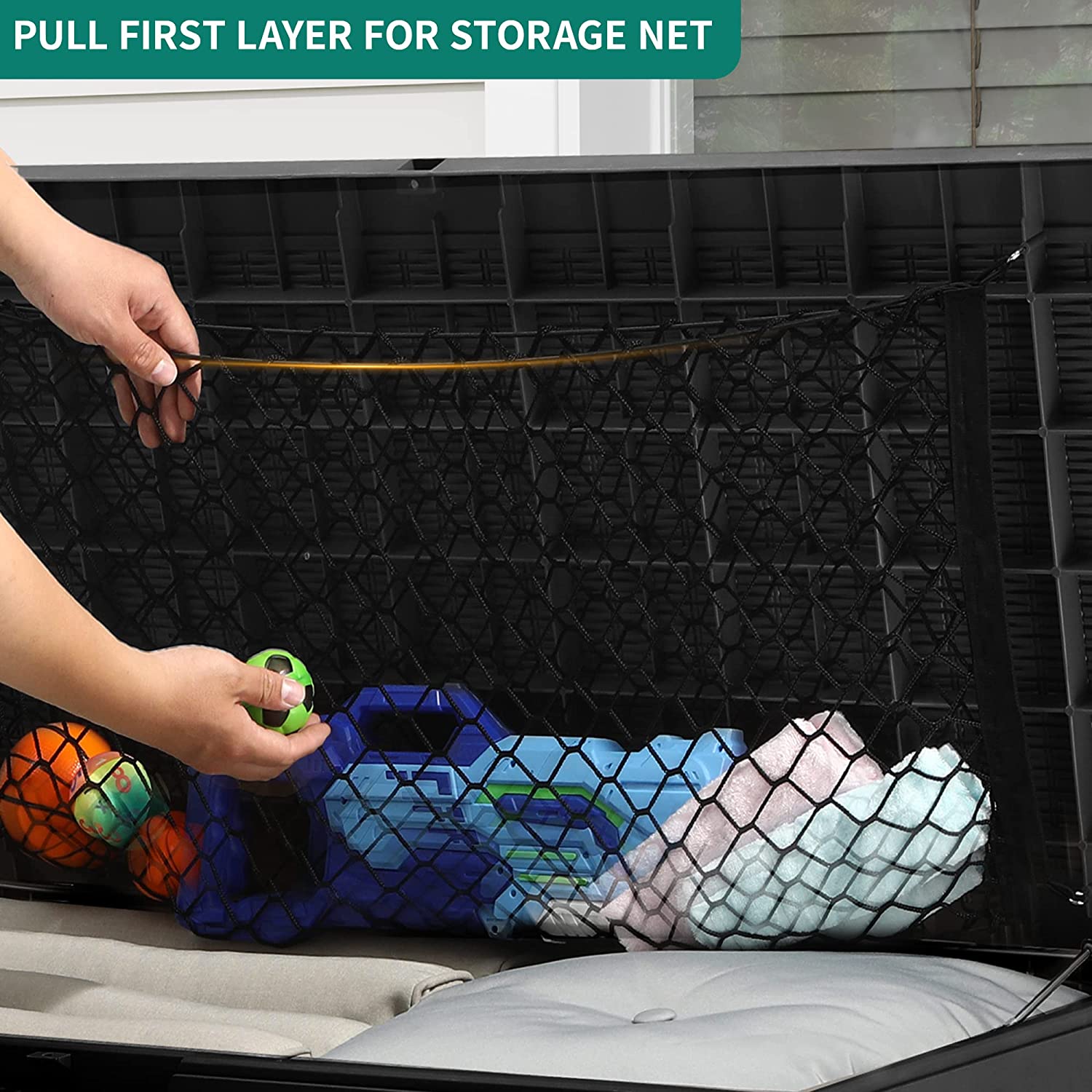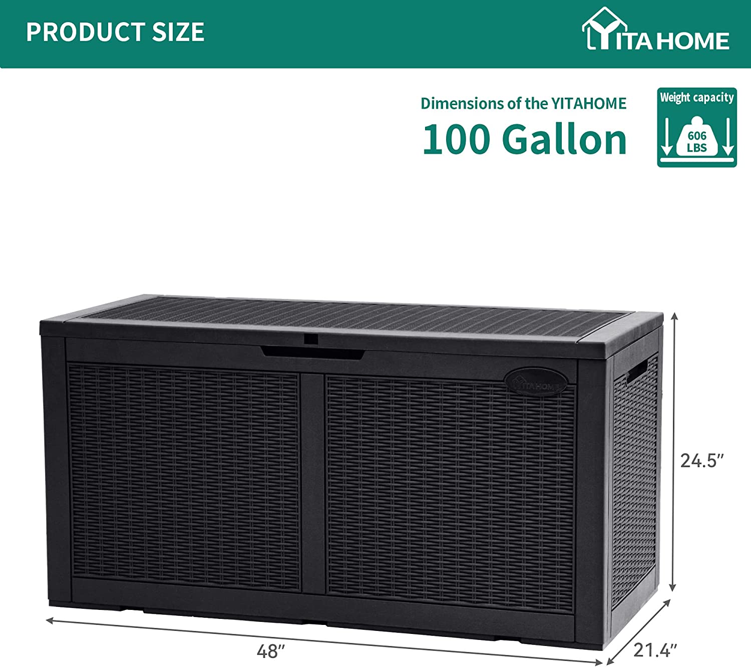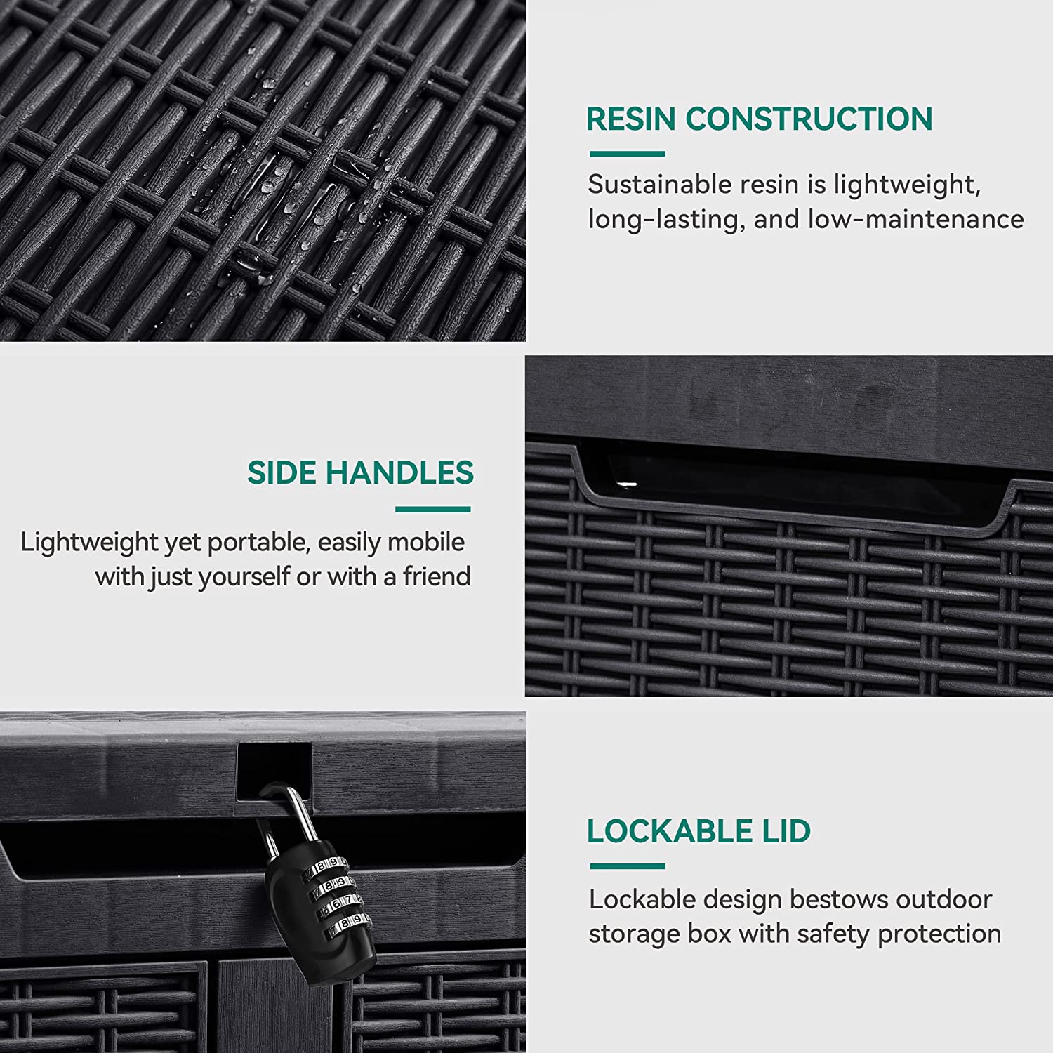 YITAHOME 100 Gallon Large Deck Box w/Storage Net. Resin Outdoor Storage Boxes. Waterproof Patio Cushion Storage Bench for Patio Furniture. Pool Supplies. Garden Tools- Rattan.Lockable (Black)