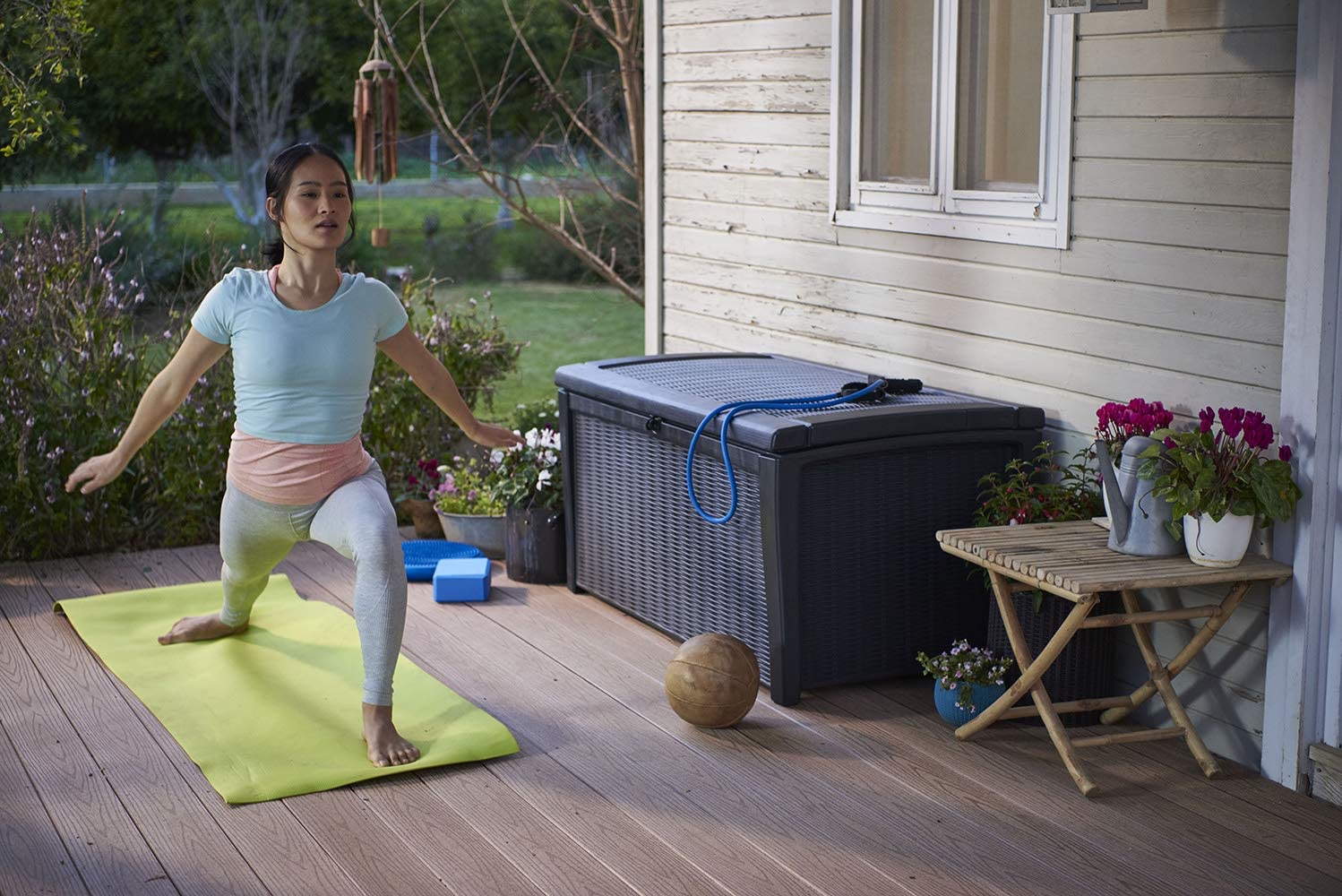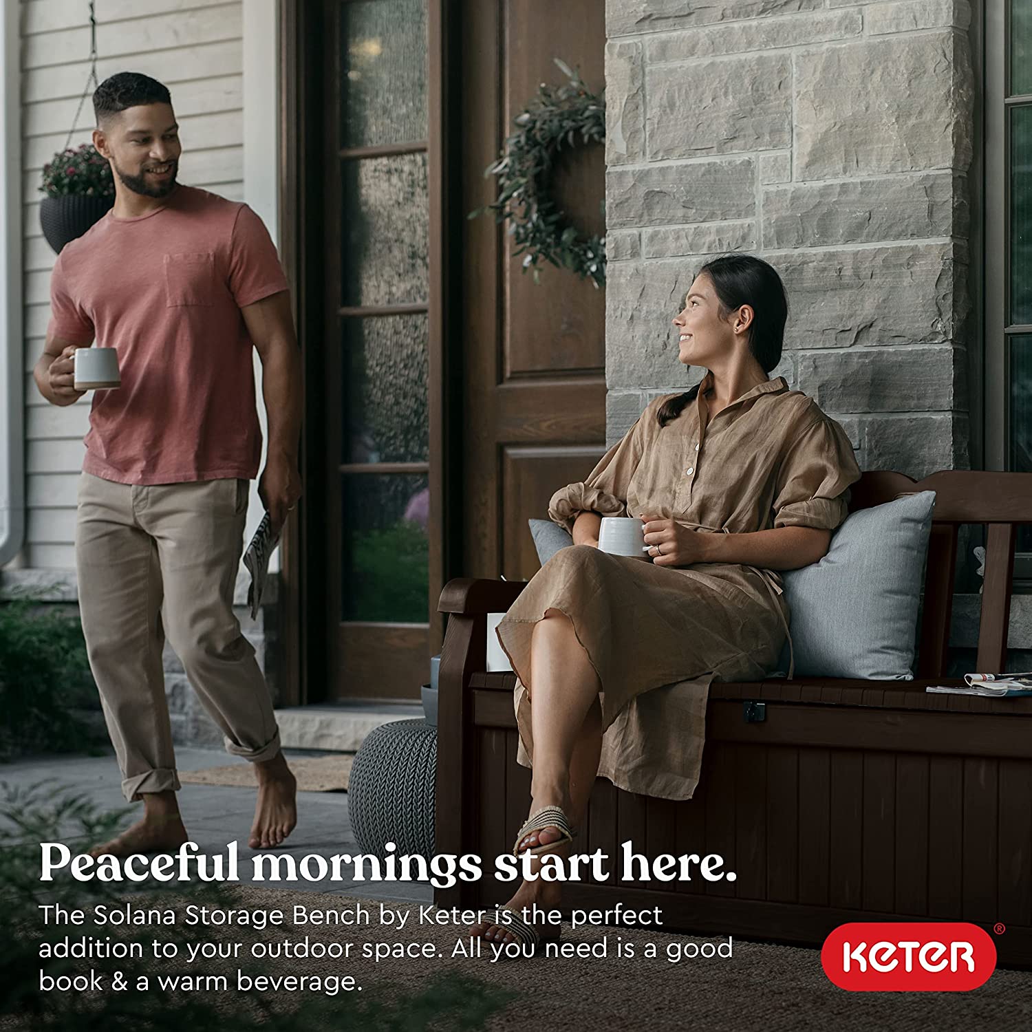Keter Solana 70 Gallon Storage Bench Deck Box for Patio Furniture. Front Porch Decor and Outdoor Seating – Perfect to Store Garden Tools and Pool Toys. Brown