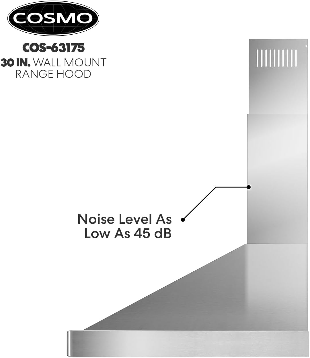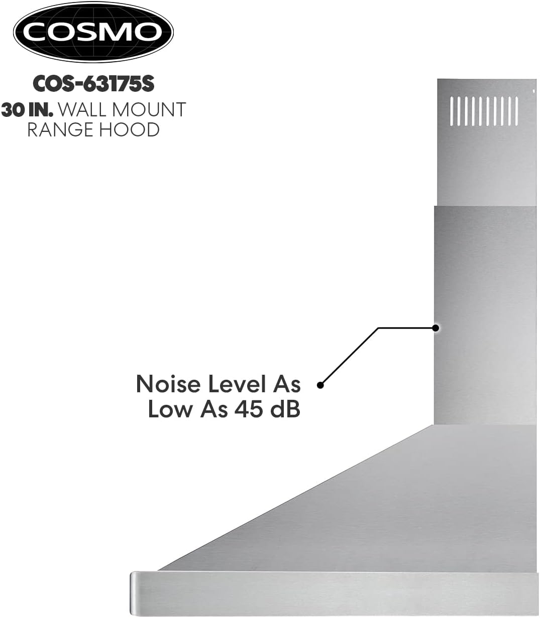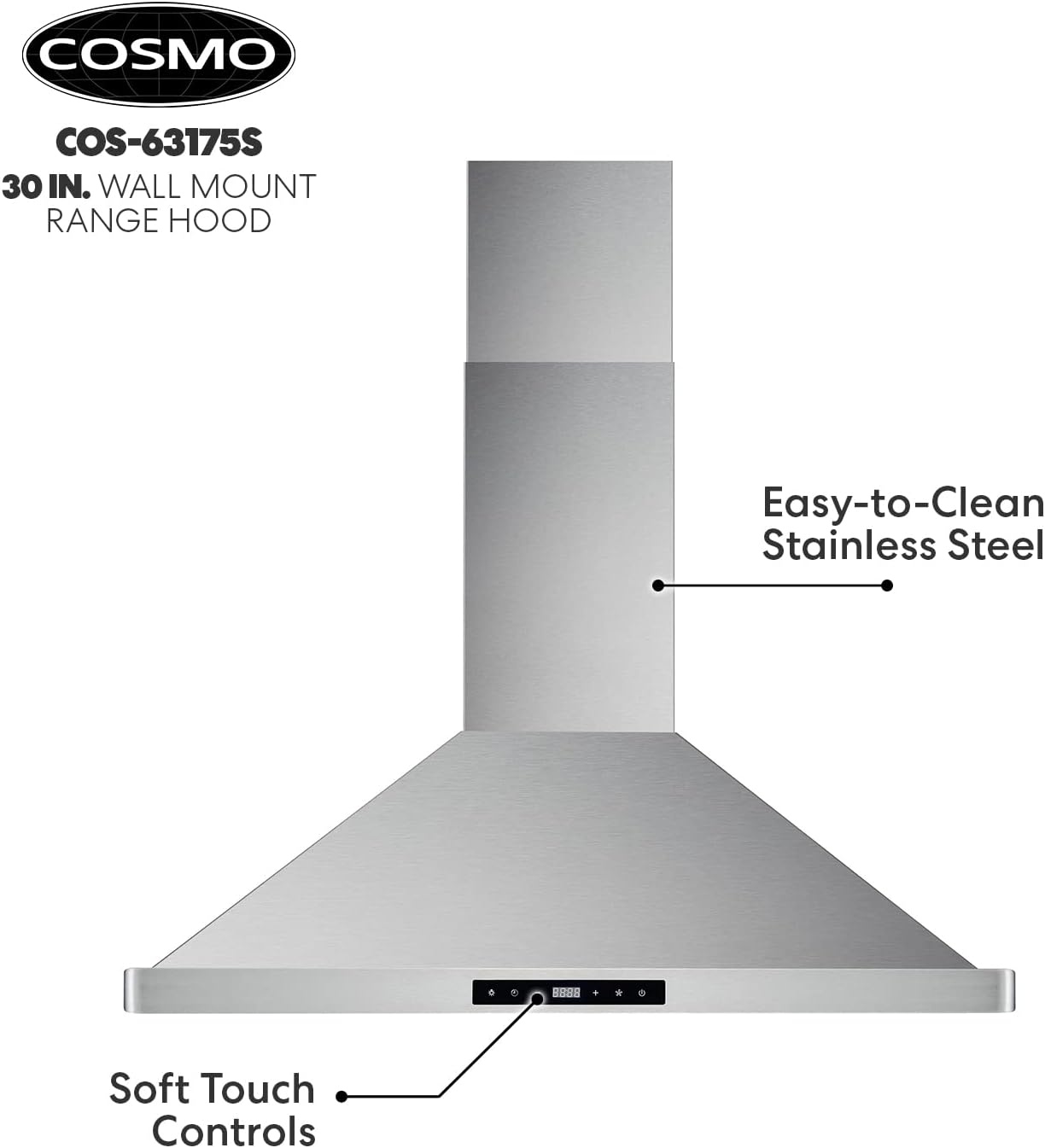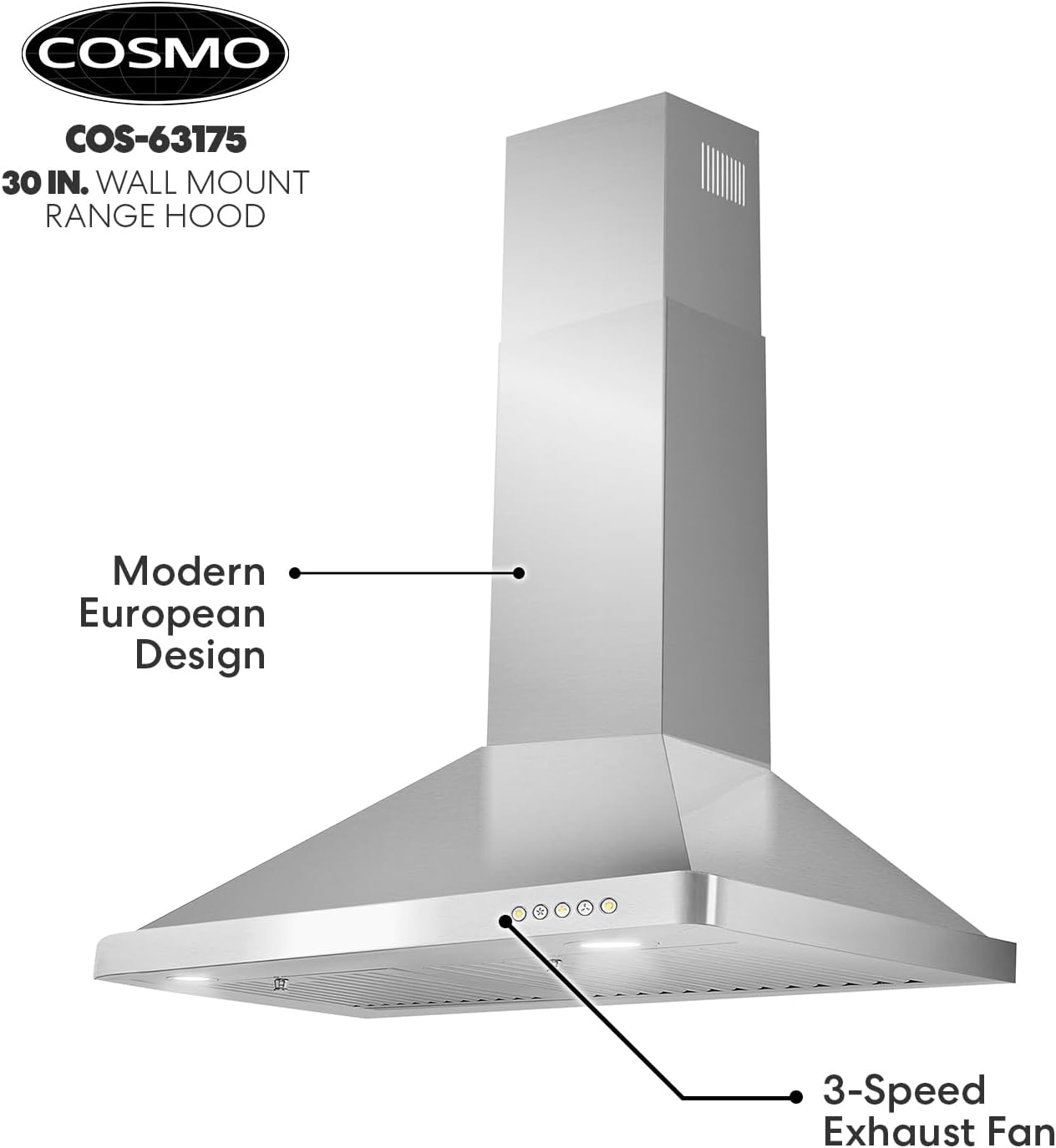 COSMO 63175 30 in. Wall Mount Range Hood with Efficient Airflow. Ducted. 3-Speed Fan. Permanent Filters. LED Lights. Chimney Style Over Stove Vent in Stainless Steel. Exhaust