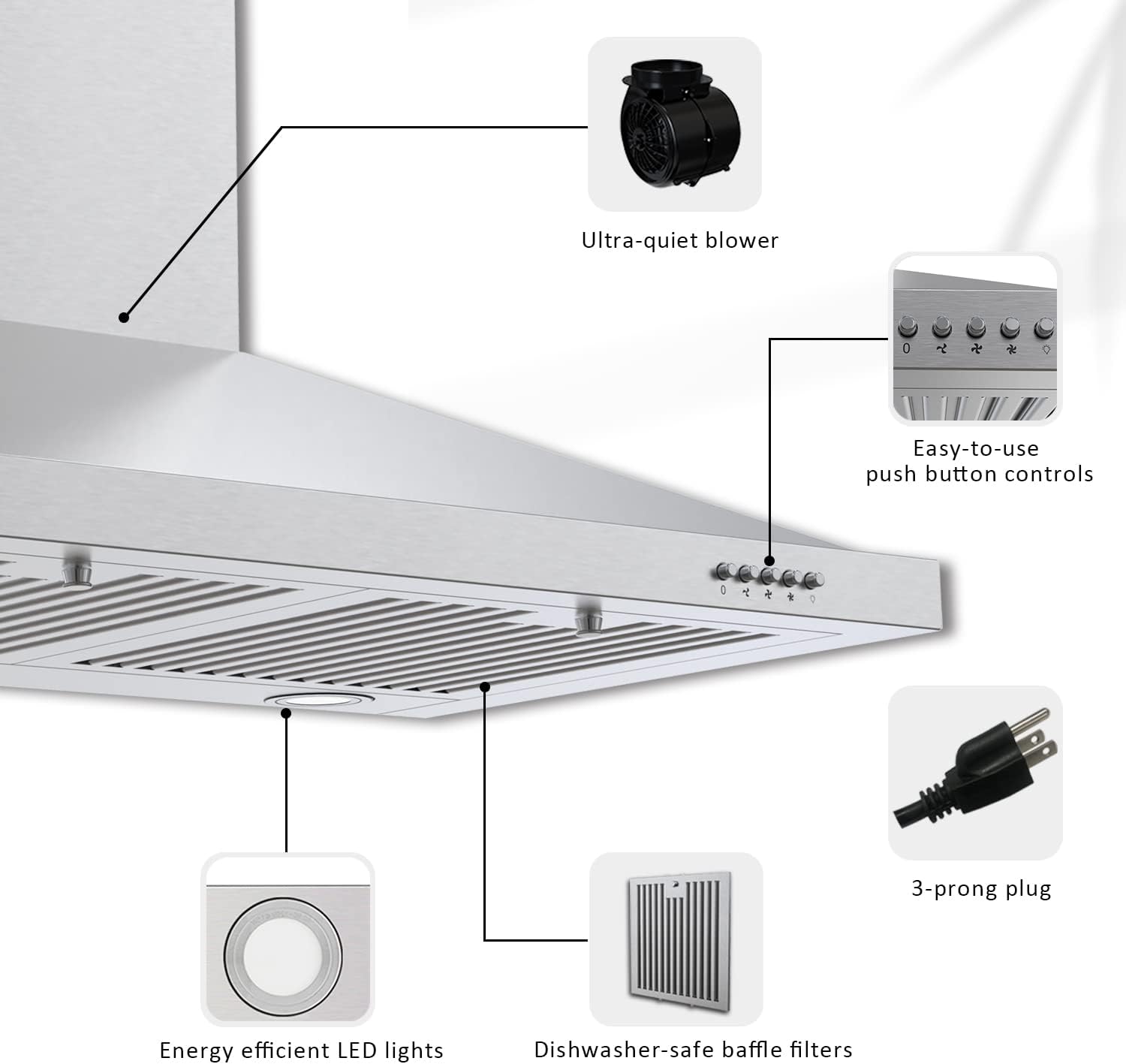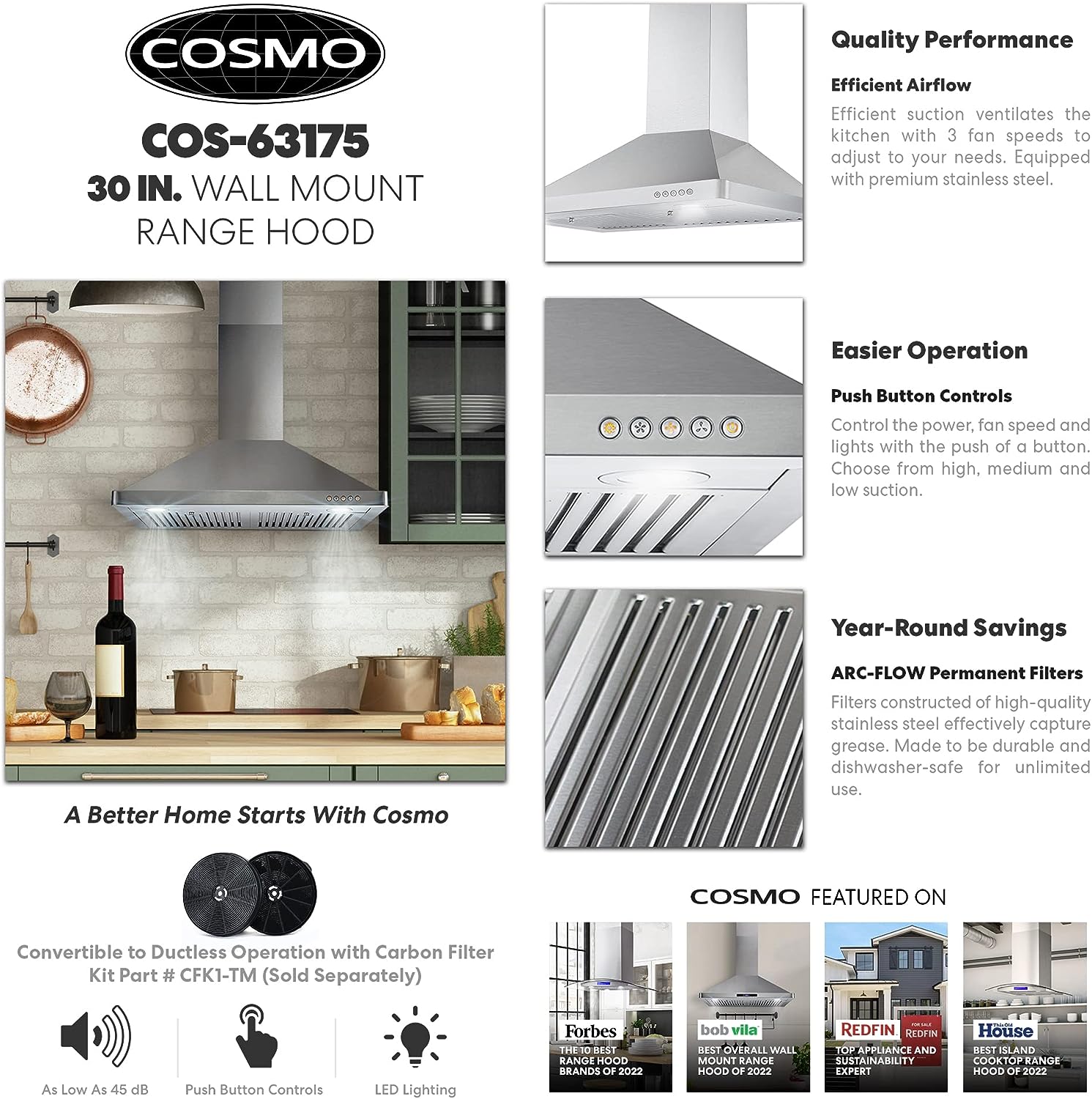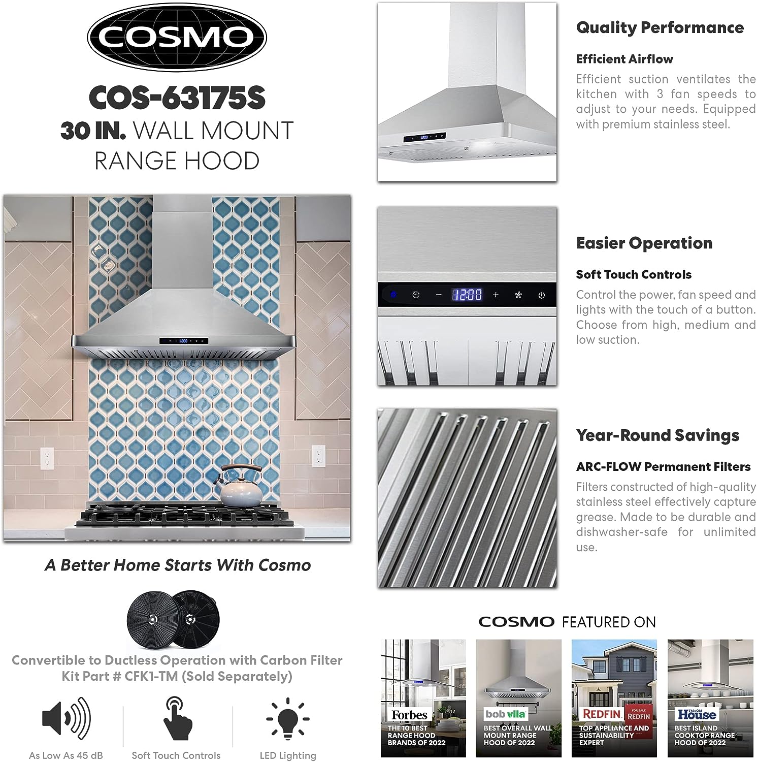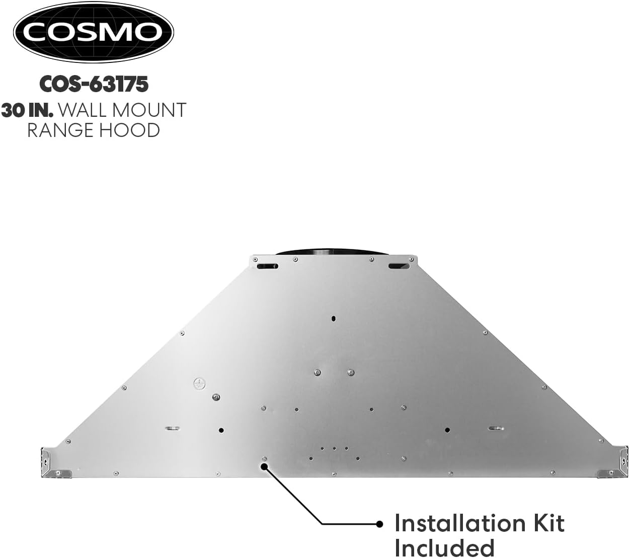 COSMO 63175 30 in. Wall Mount Range Hood with Efficient Airflow. Ducted. 3-Speed Fan. Permanent Filters. LED Lights. Chimney Style Over Stove Vent in Stainless Steel. Exhaust